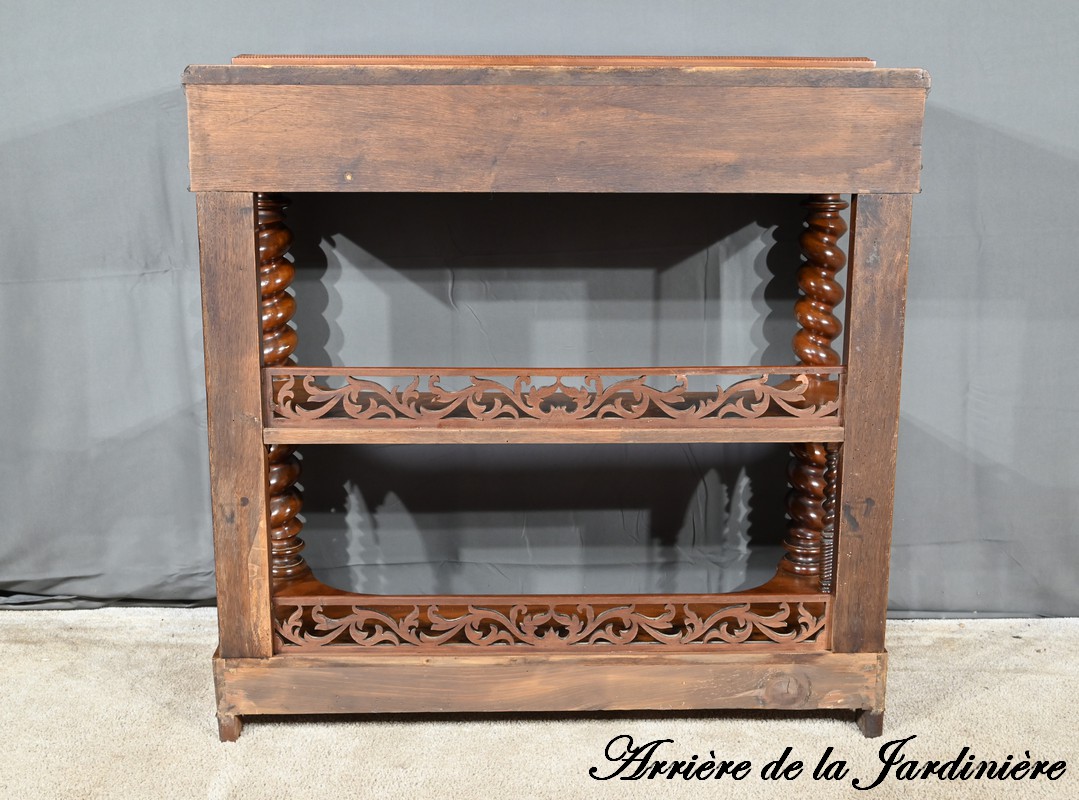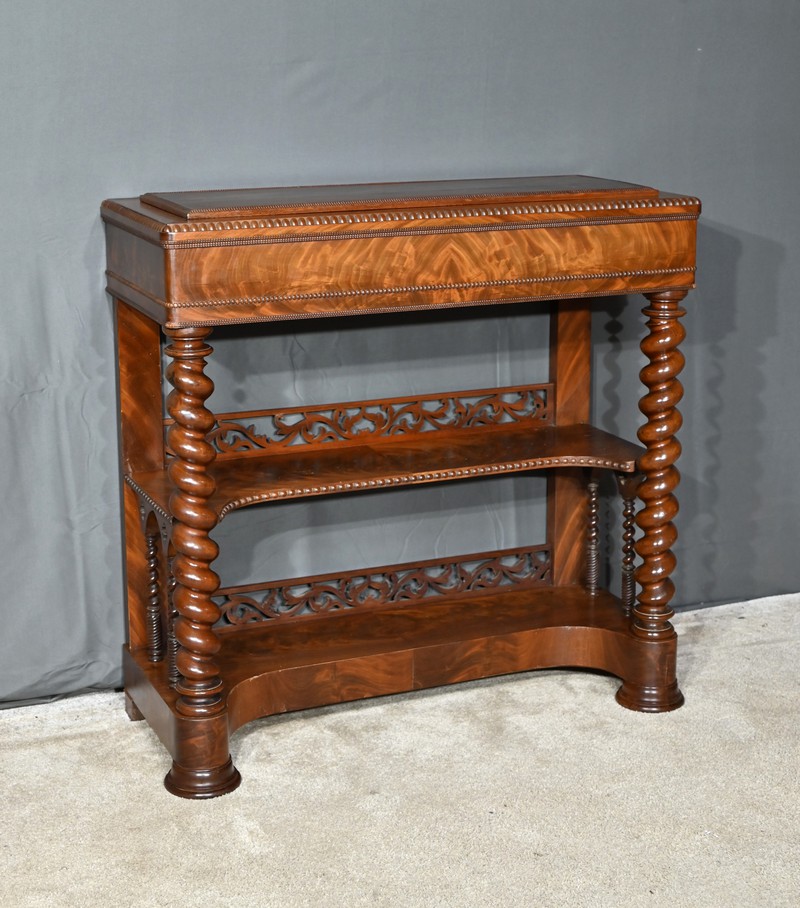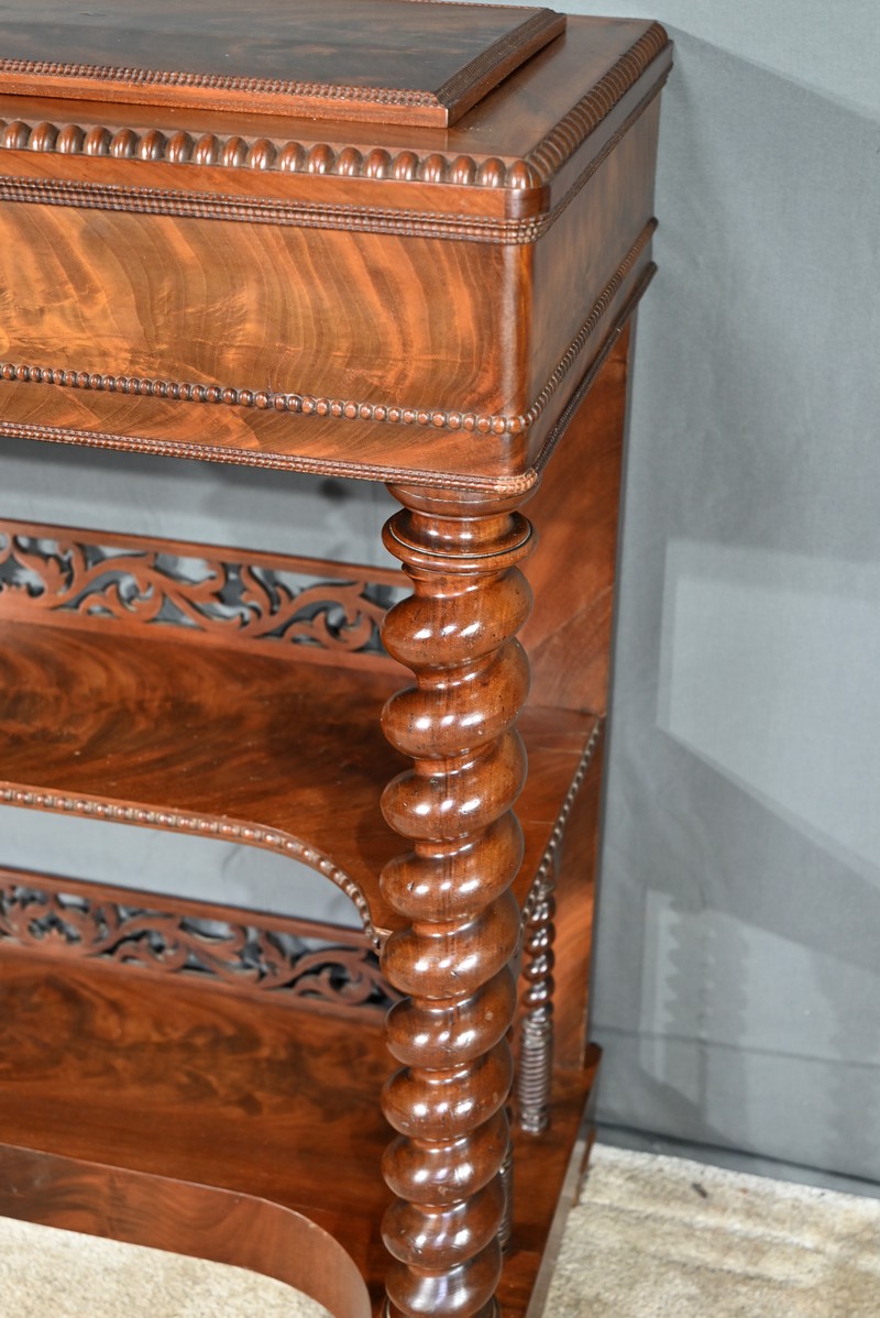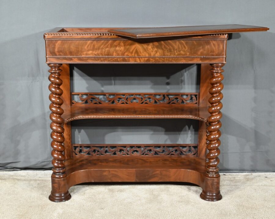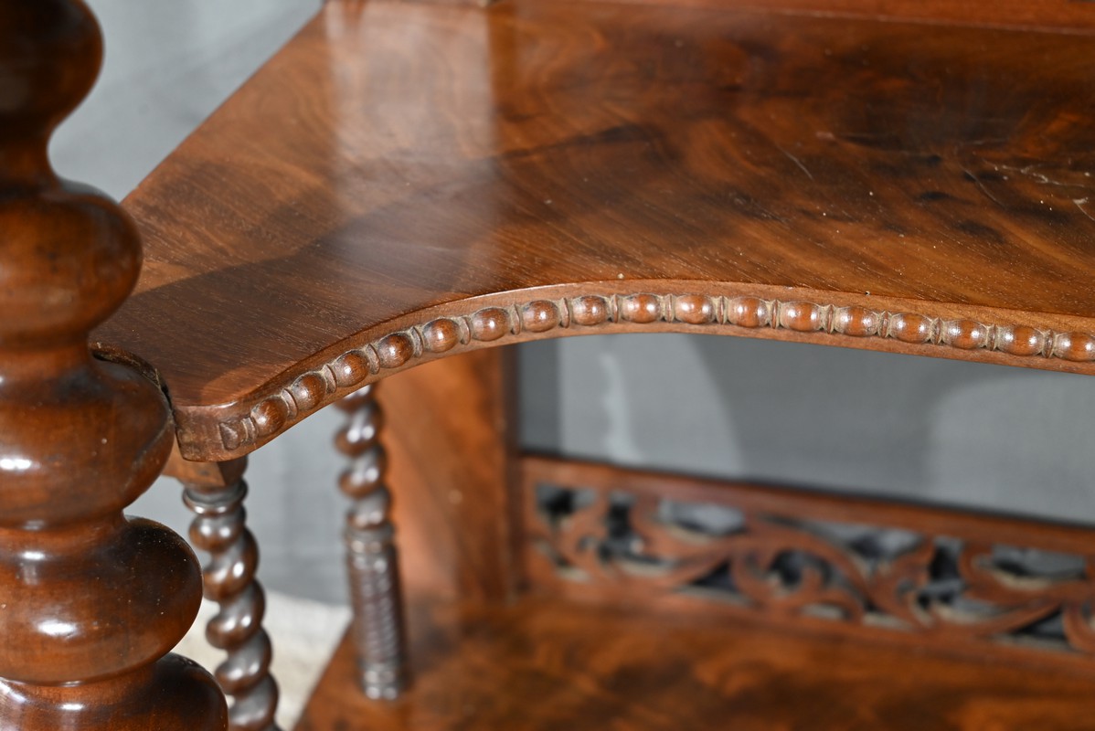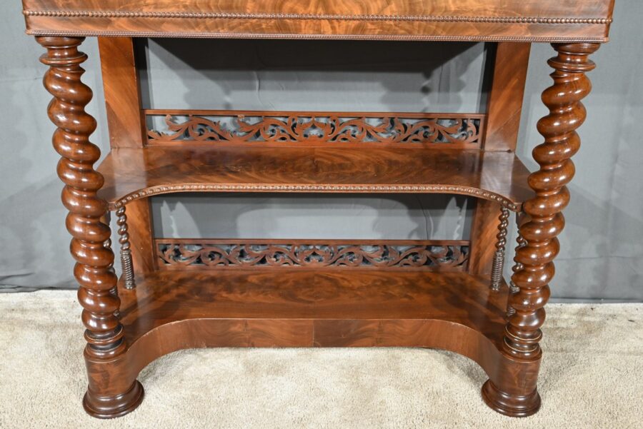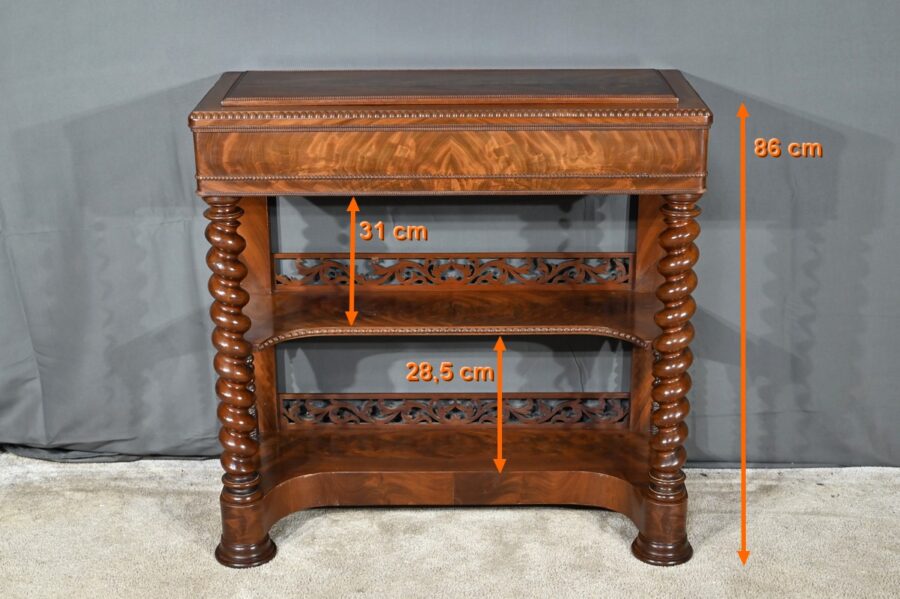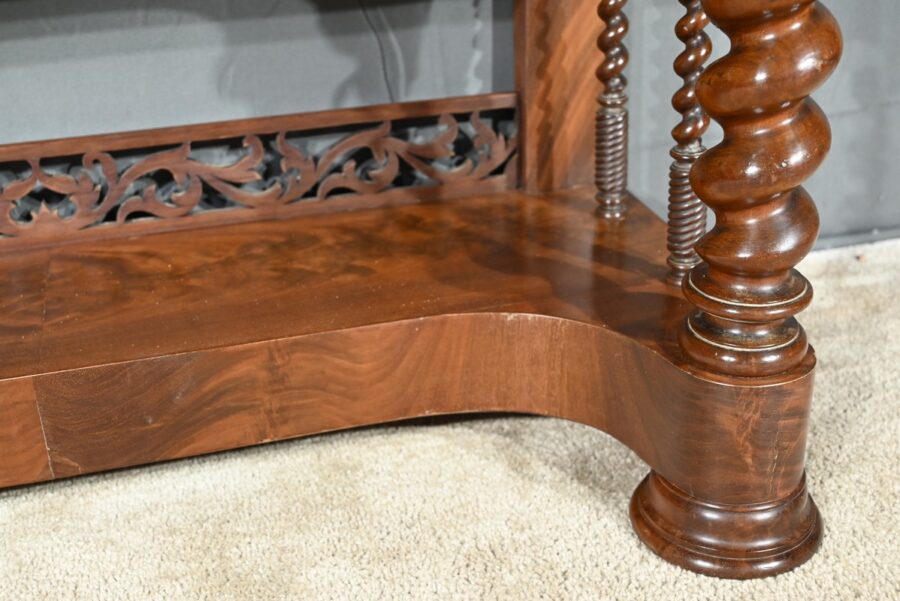 Les pieds tournés, aussi appelés pieds bobine, ajoutent une touche d’élégance et de délicatesse. Plusieurs niveaux d’étagères sont disponibles, avec une galerie au fond pour exposer ou ranger divers objets.