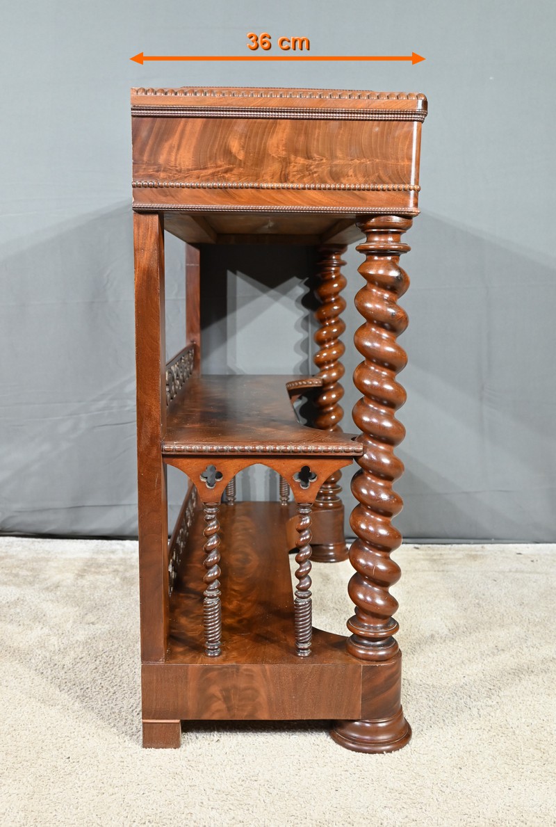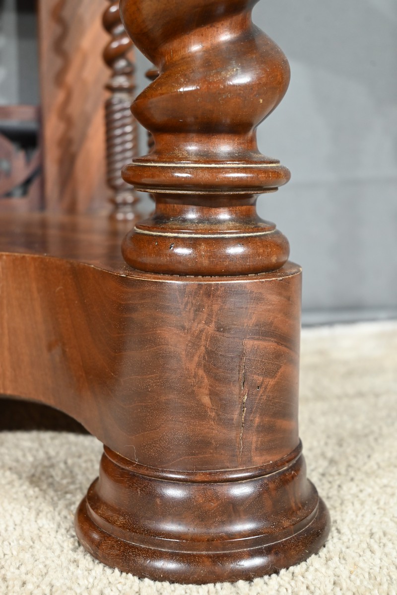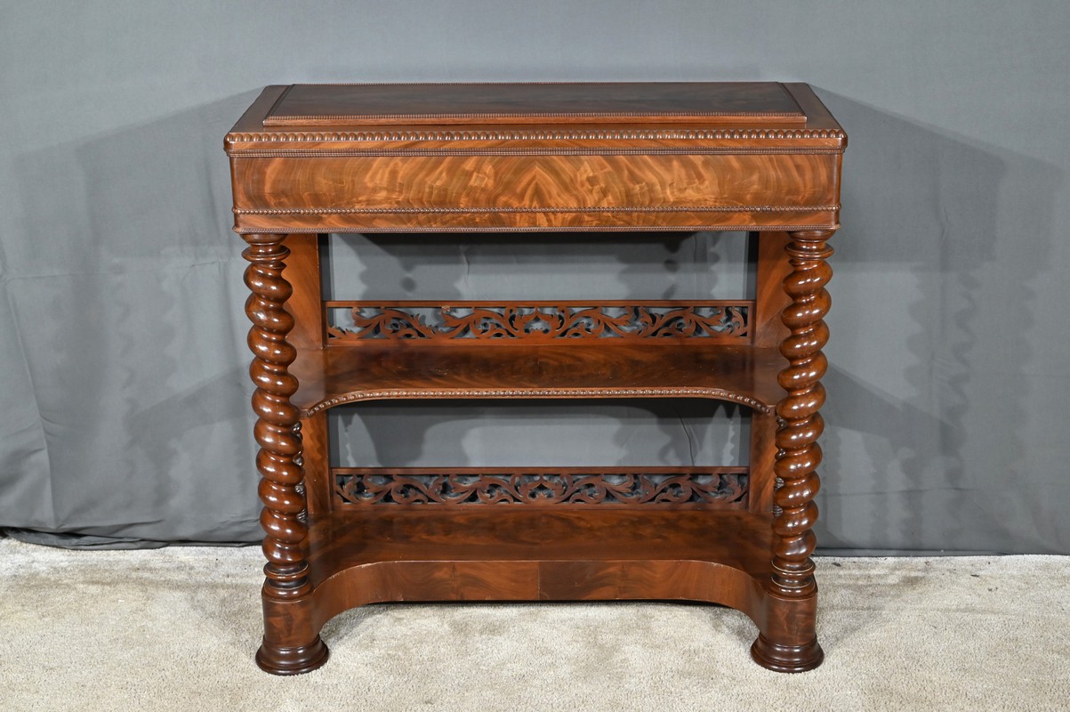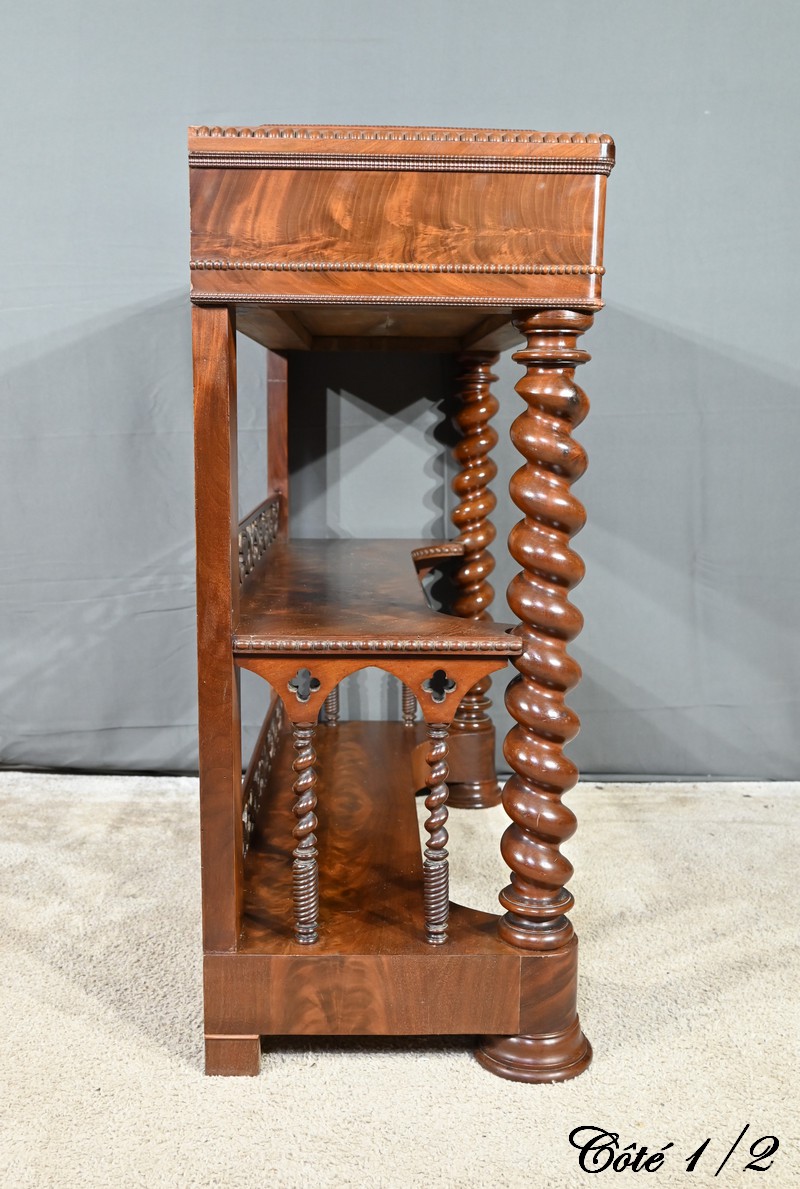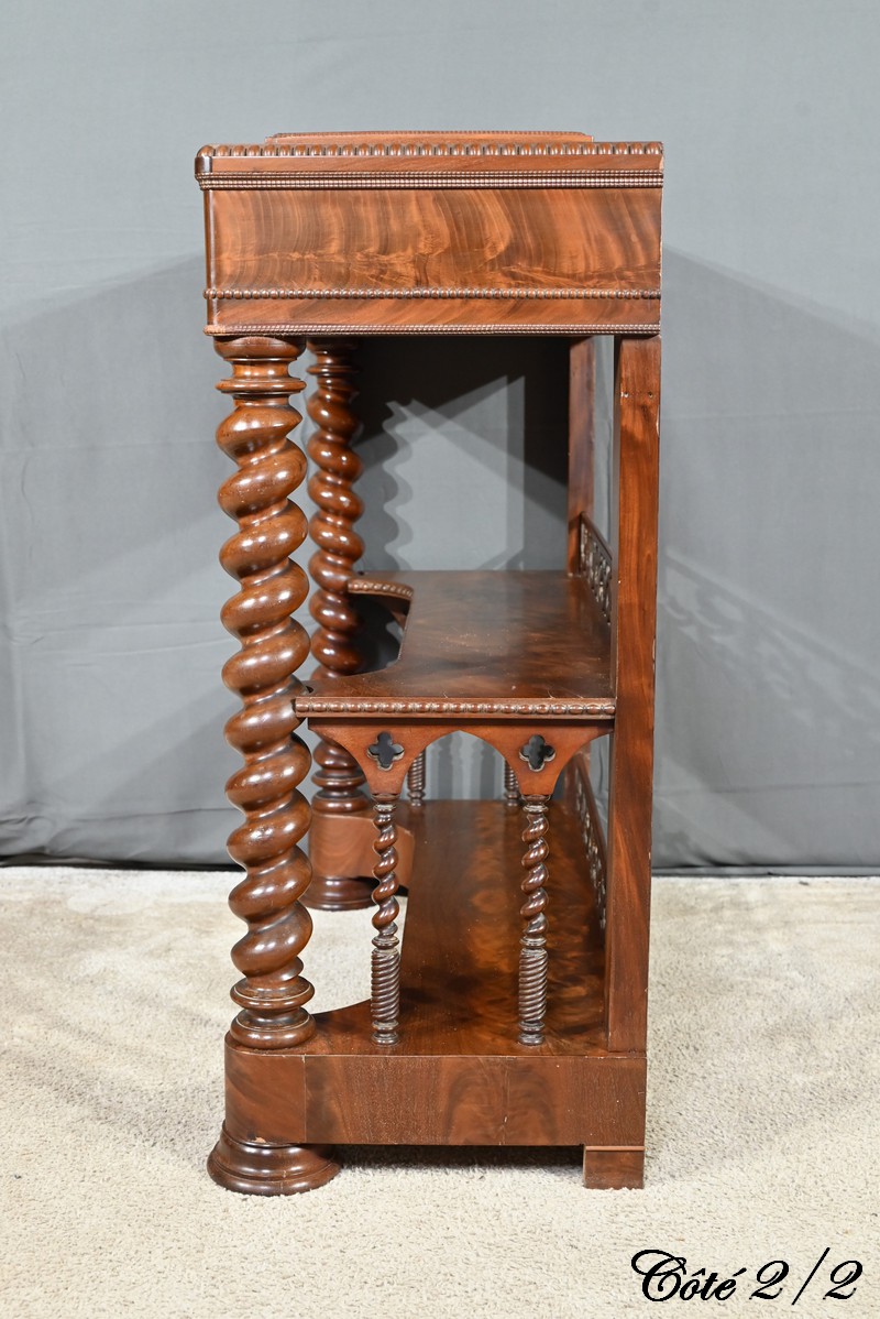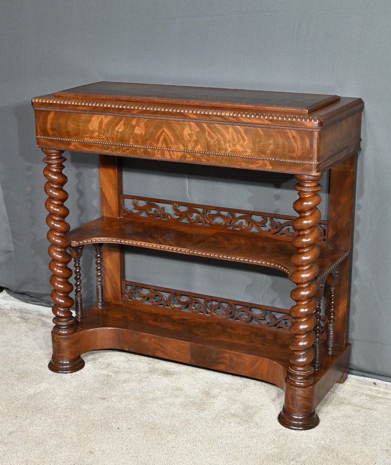 Les pieds tournés, aussi appelés pieds bobine, ajoutent une touche d’élégance et de délicatesse. Plusieurs niveaux d’étagères sont disponibles, avec une galerie au fond pour exposer ou ranger divers objets.