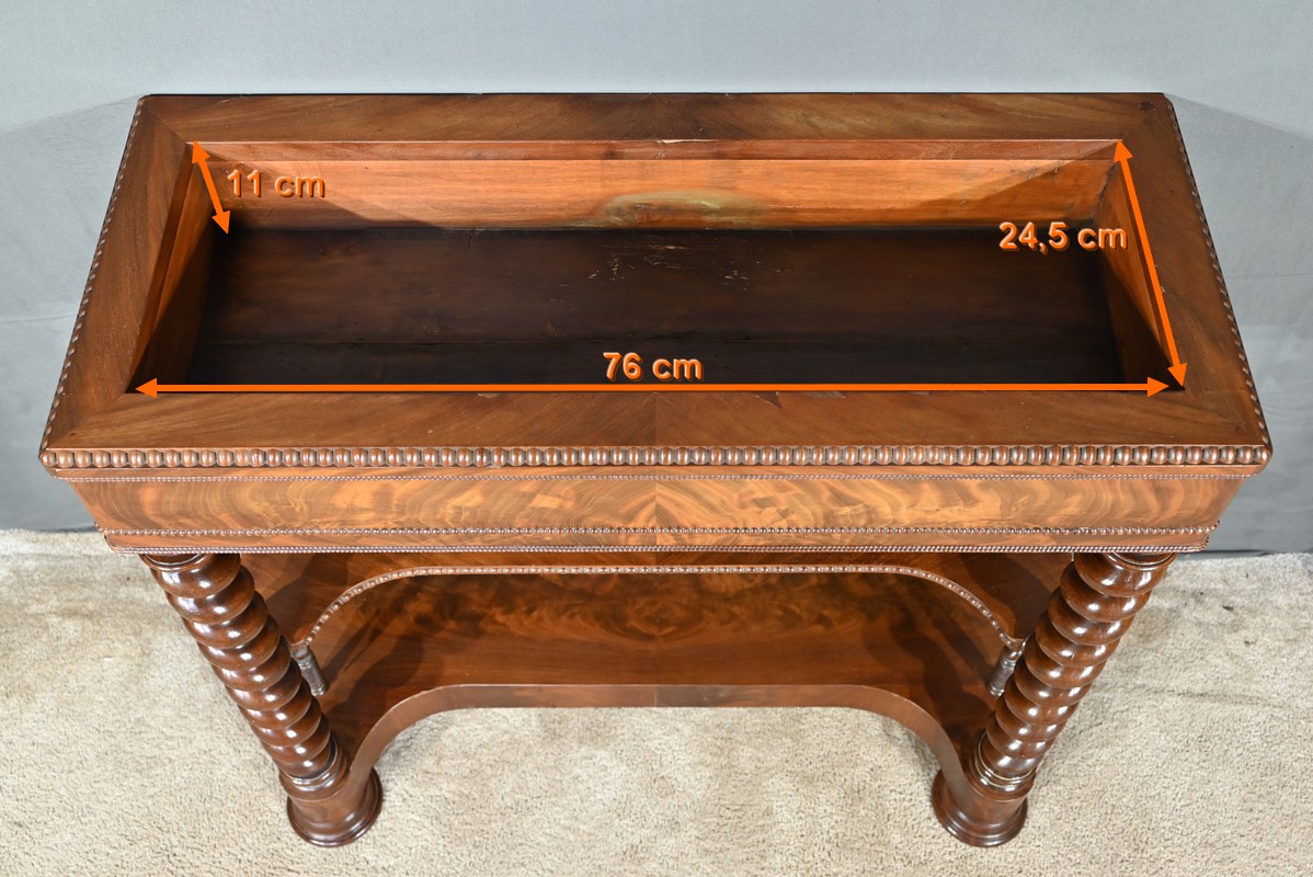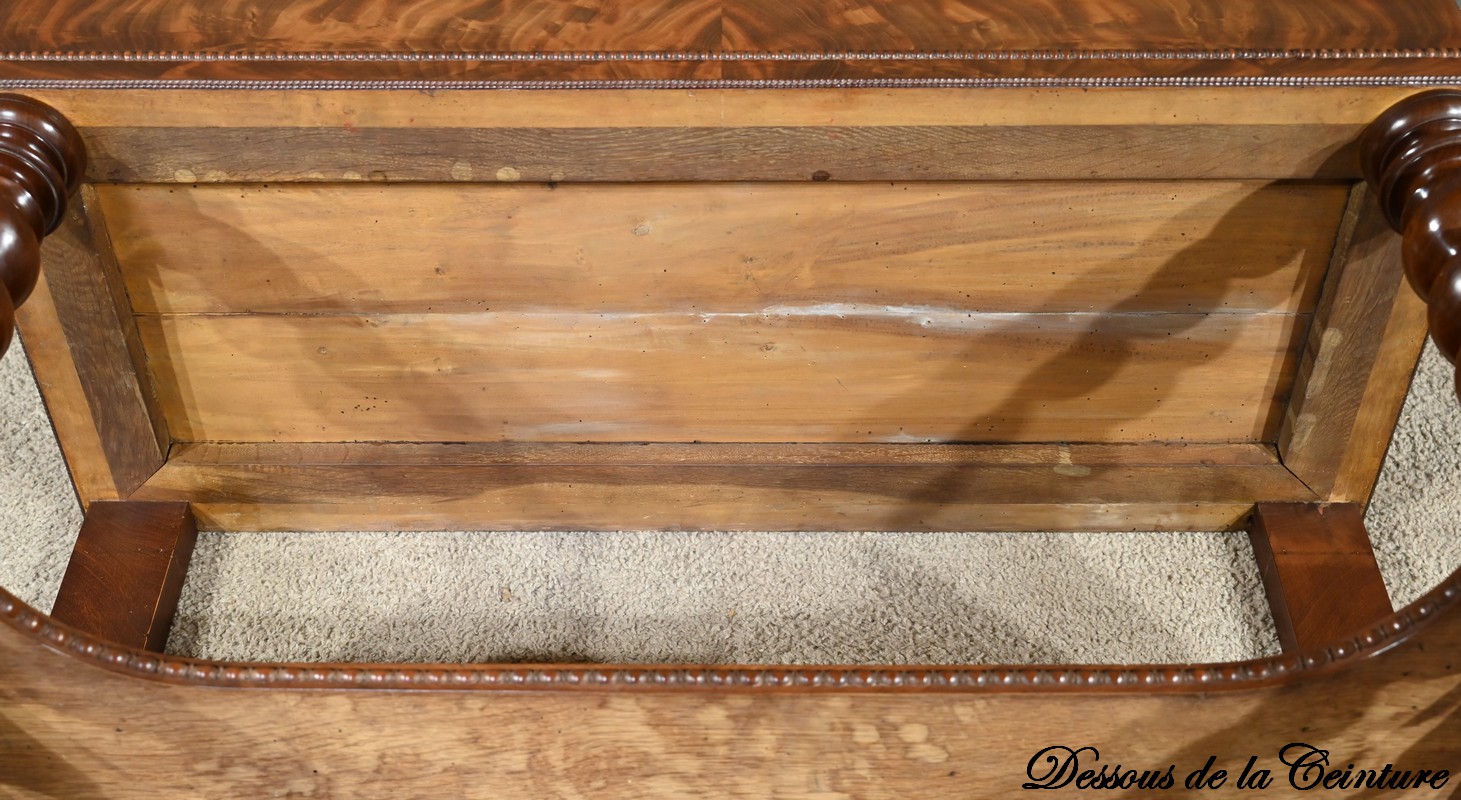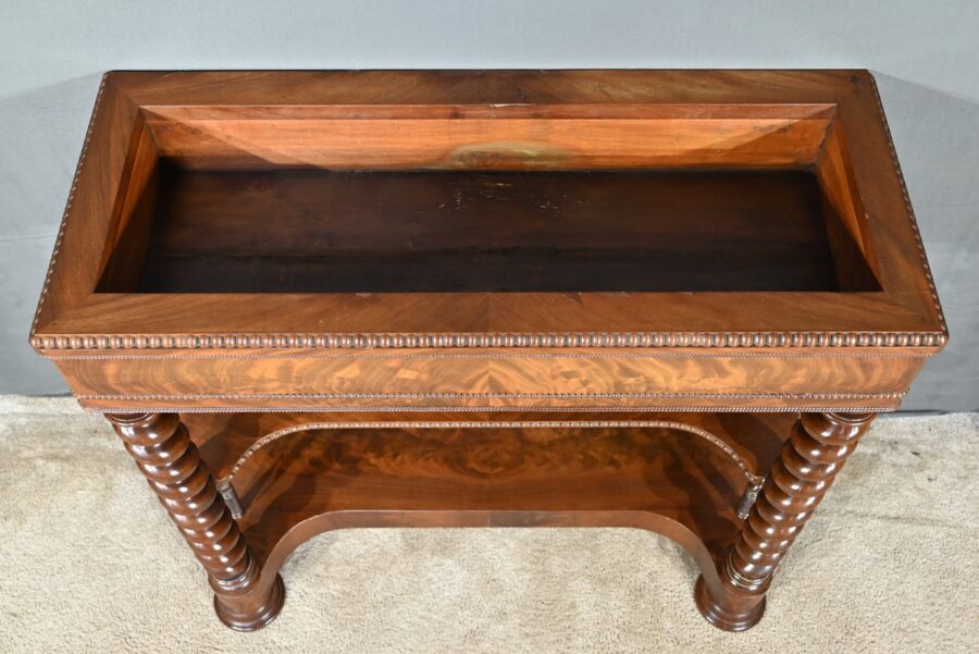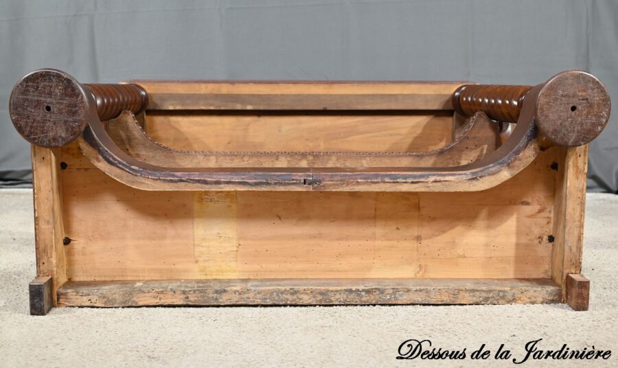 Cette jardinière en ronce d’acajou présente des lignes classiques et robustes, typiques du style restauration