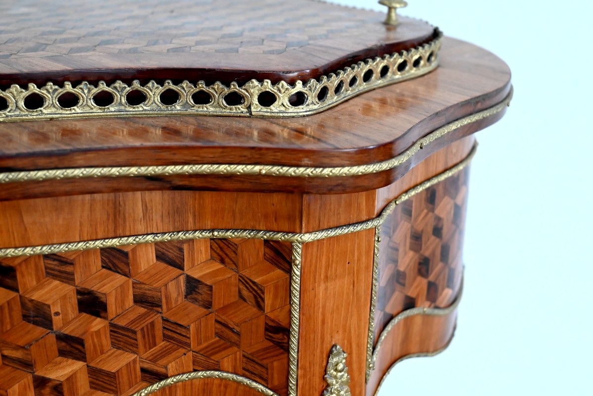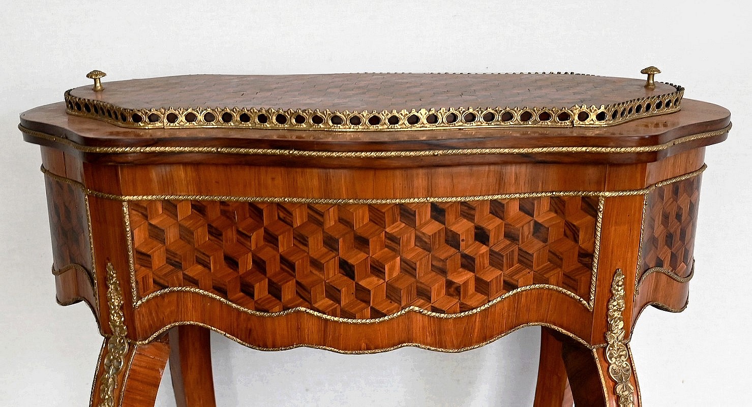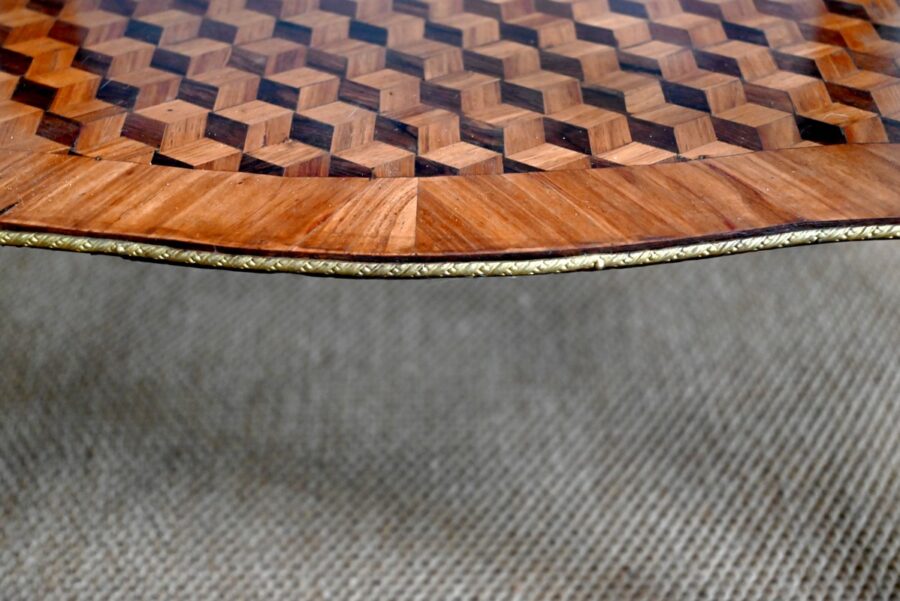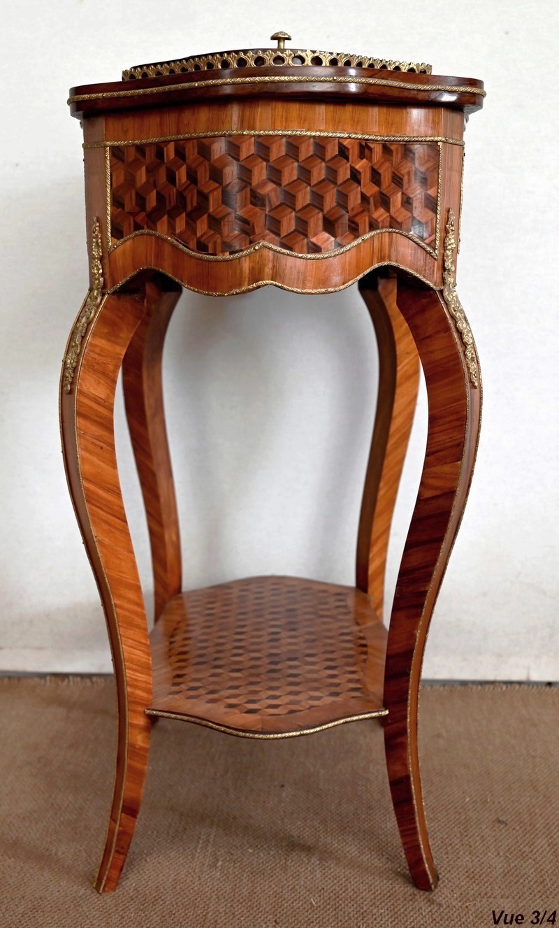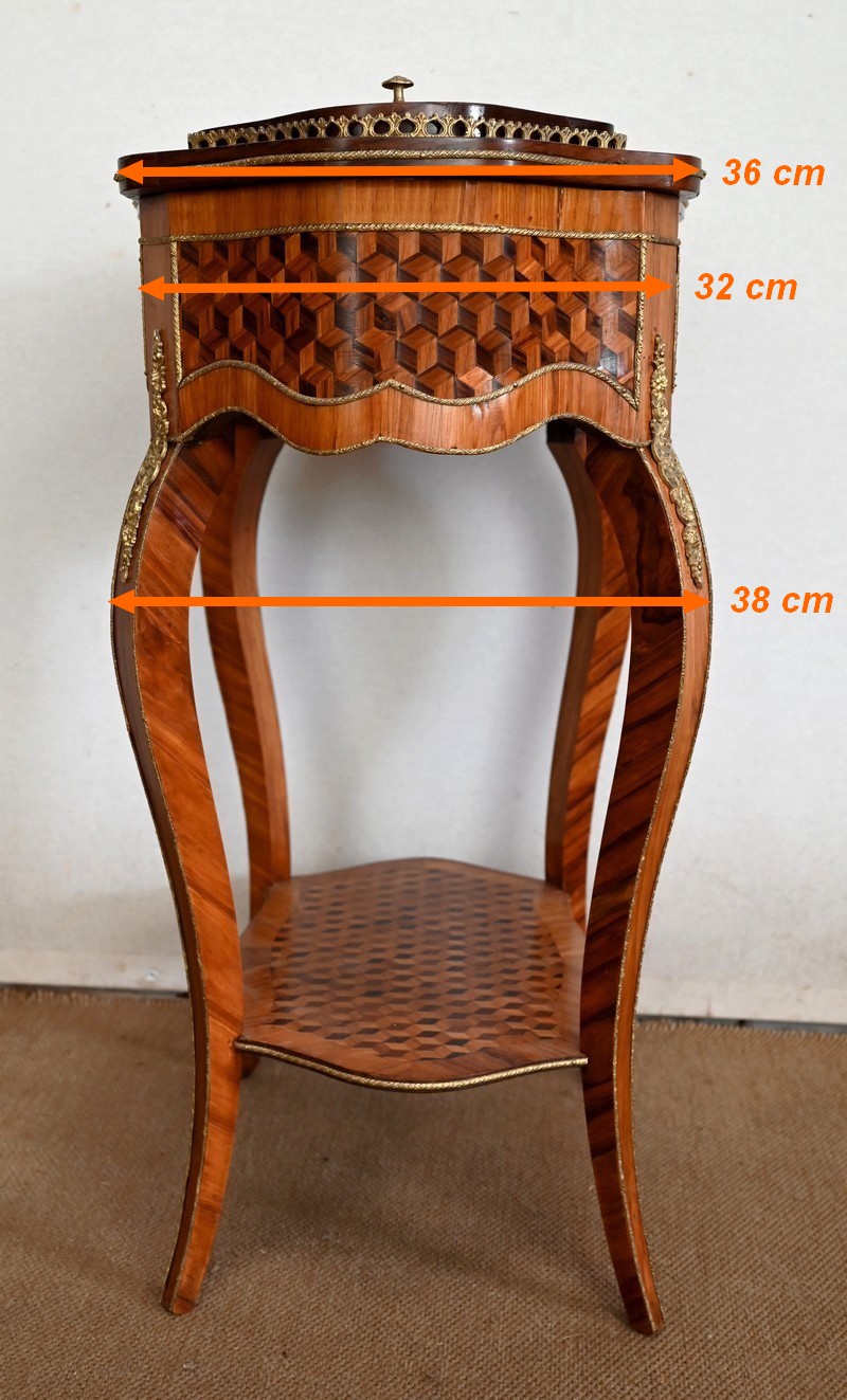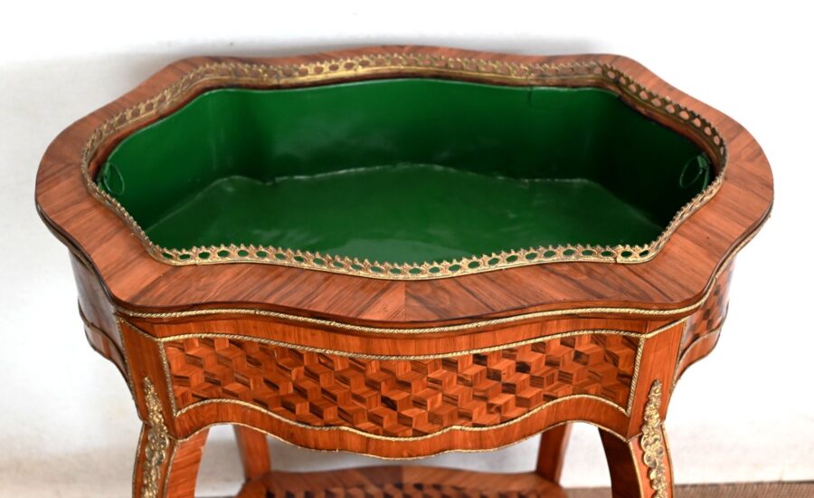Le dessus, dit bouchon, marqueté de losanges formant une succession de cubes parfaitement proportionnés, est pourvu de deux boutons en bronze festonné. L’entourage en dégradé est garni d’une galerie ajourée en bronze. Le couvercle retiré révèle un bac en zinc formant jardinière.