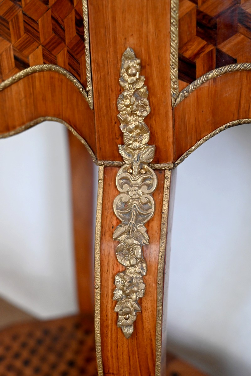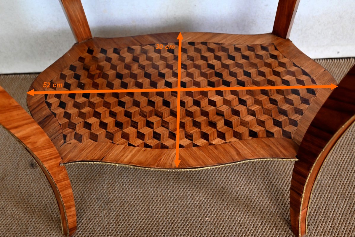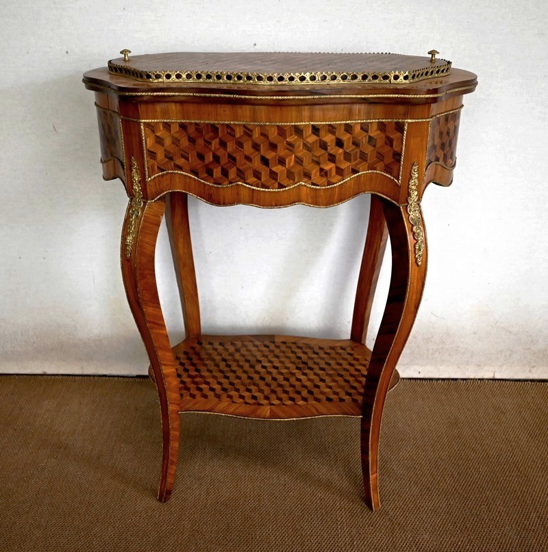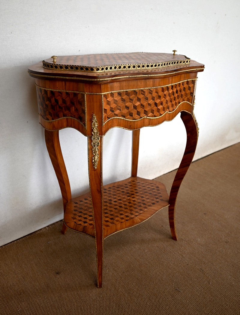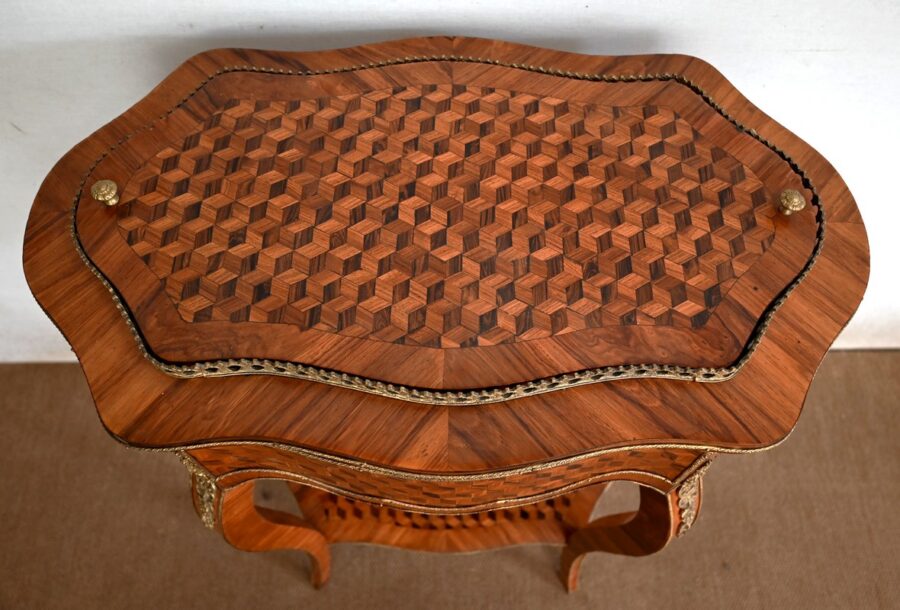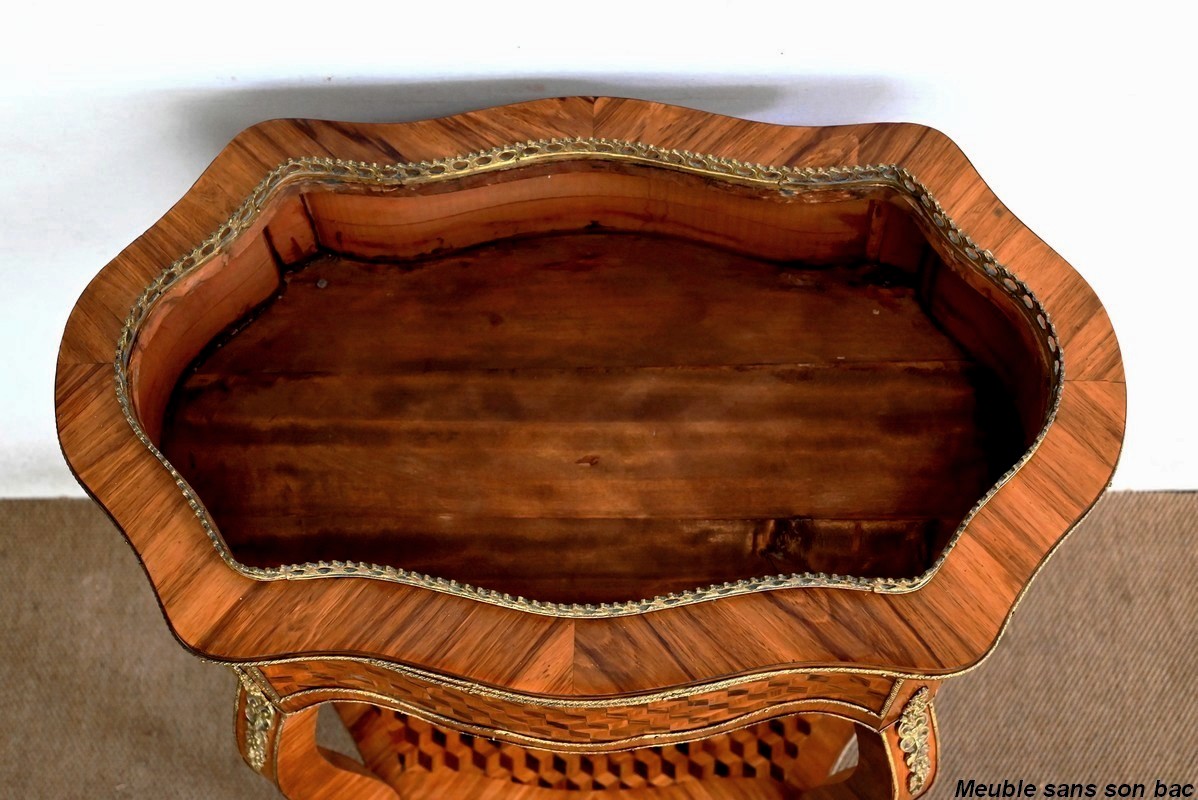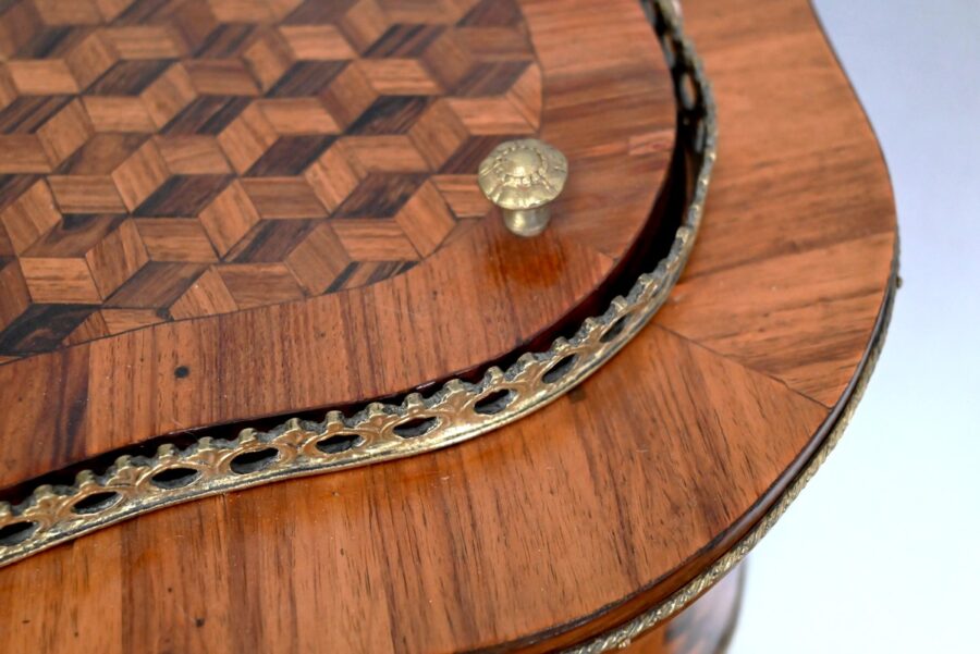 Le dessus, dit bouchon, marqueté de losanges formant une succession de cubes parfaitement proportionnés, est pourvu de deux boutons en bronze festonné. L’entourage en dégradé est garni d’une galerie ajourée en bronze. Le couvercle retiré révèle un bac en zinc formant jardinière.