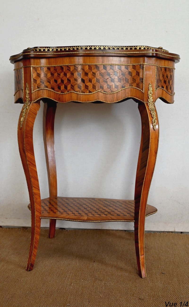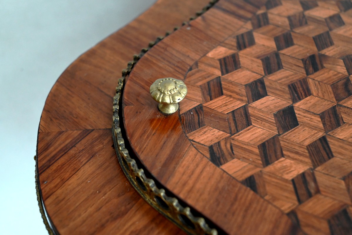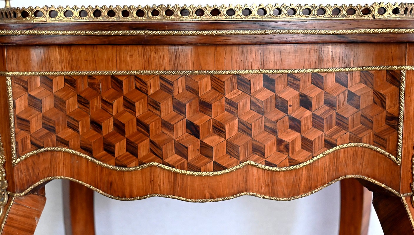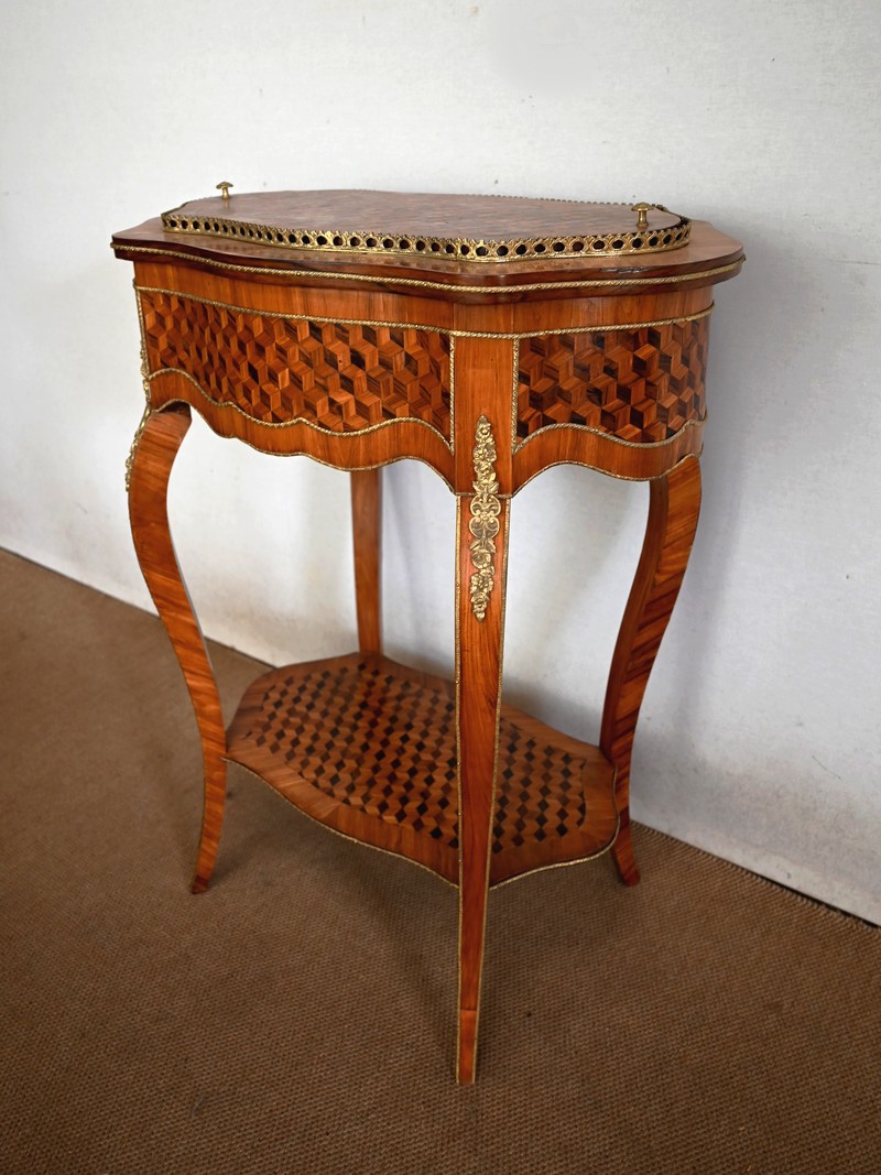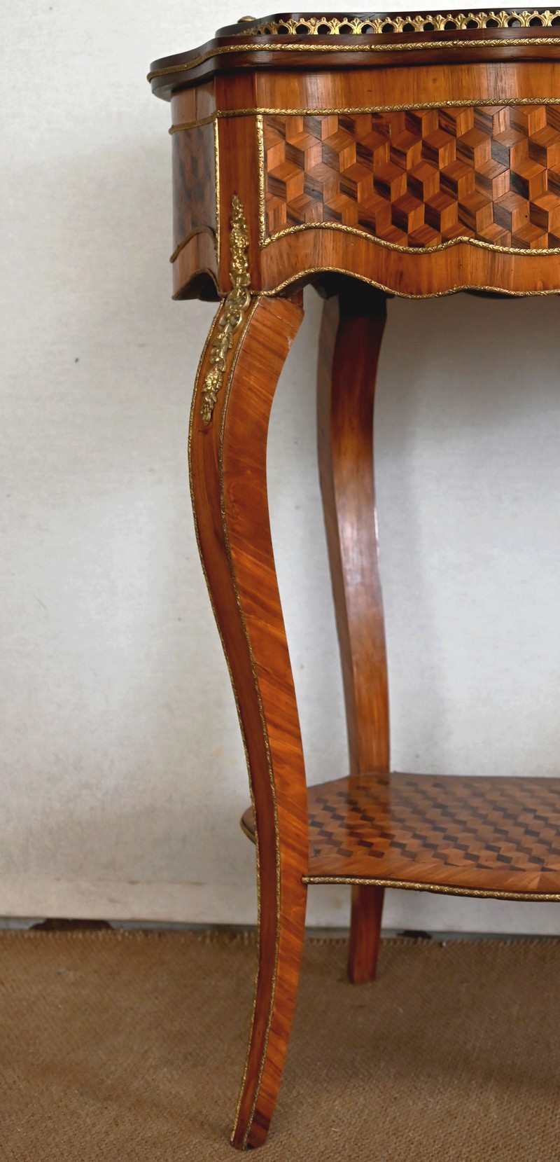 Le dessus, dit bouchon, marqueté de losanges formant une succession de cubes parfaitement proportionnés, est pourvu de deux boutons en bronze festonné. L’entourage en dégradé est garni d’une galerie ajourée en bronze. Le couvercle retiré révèle un bac en zinc formant jardinière.