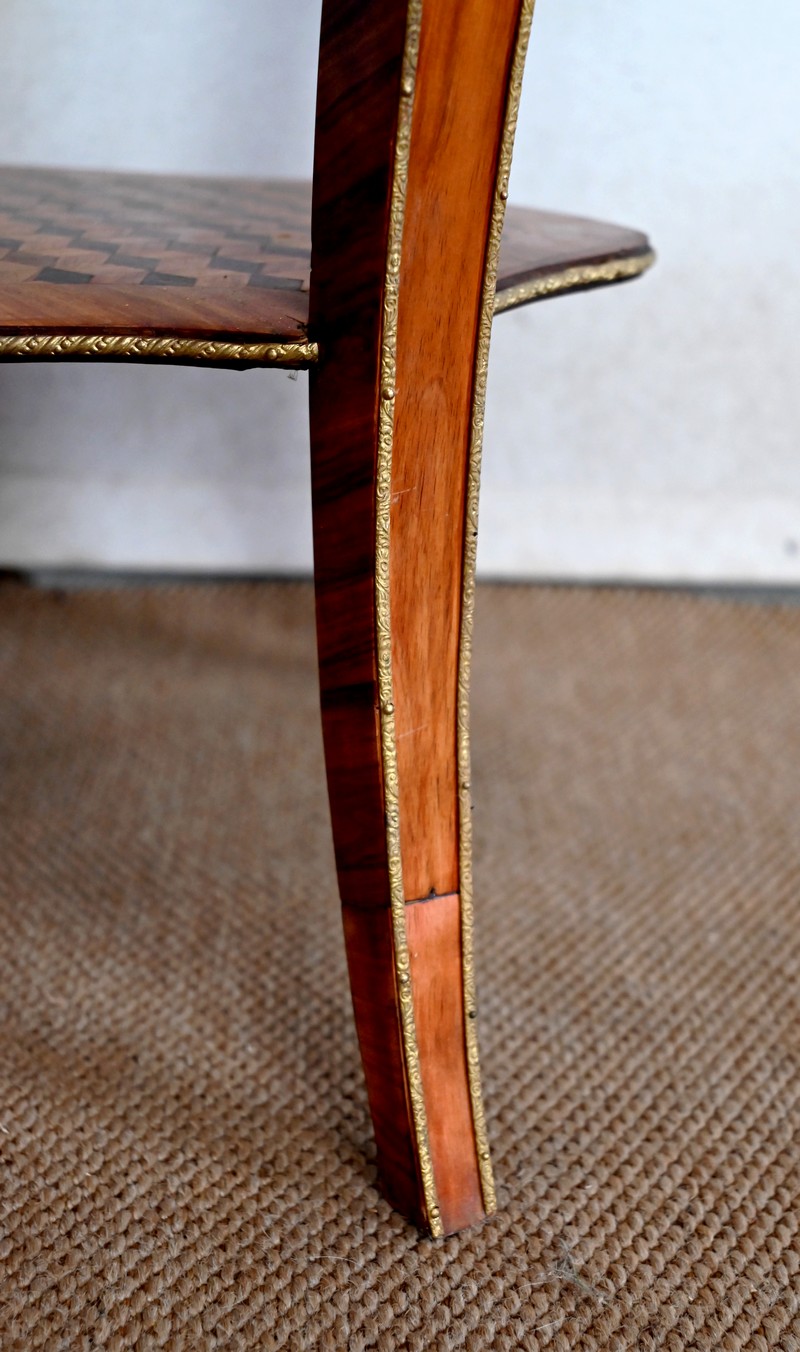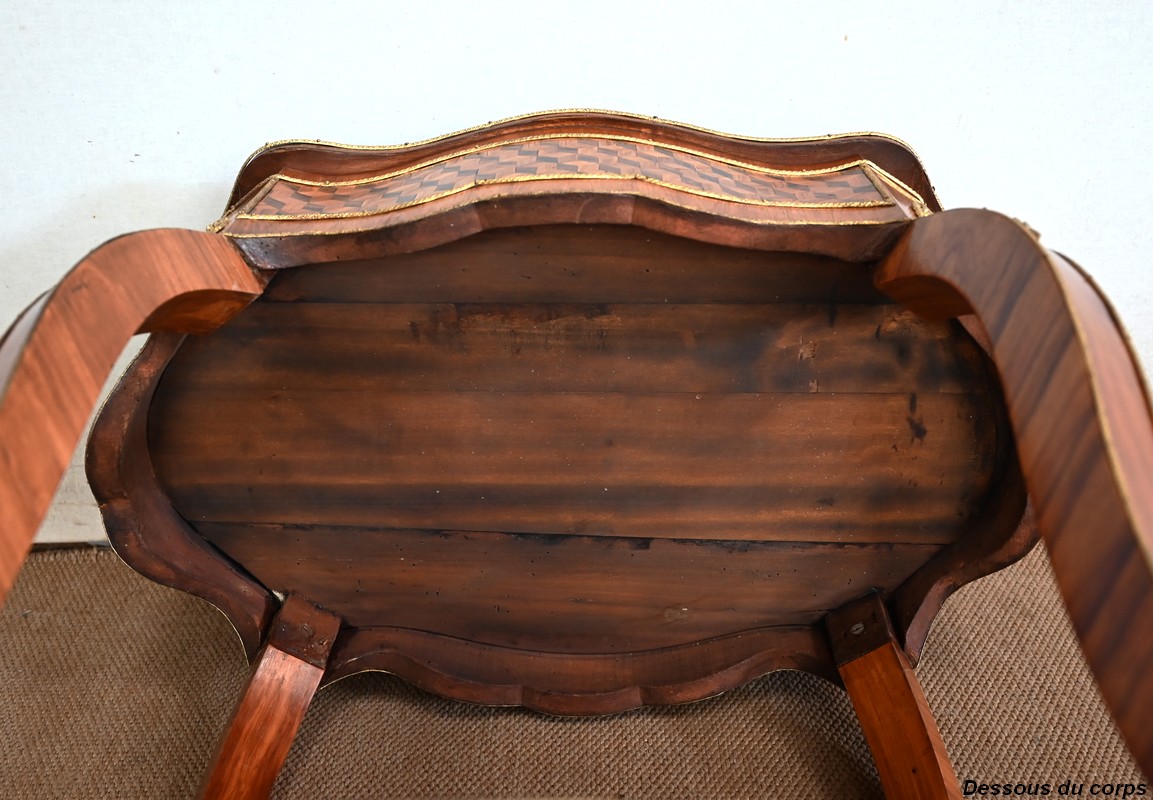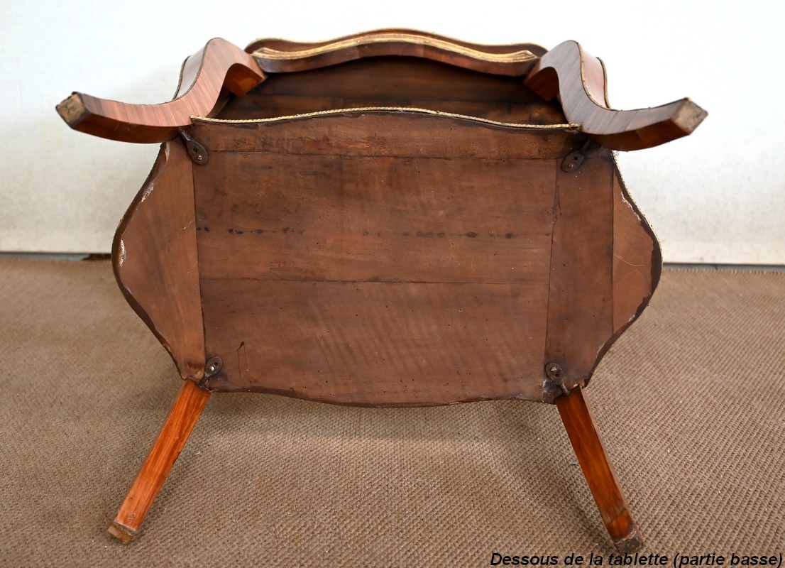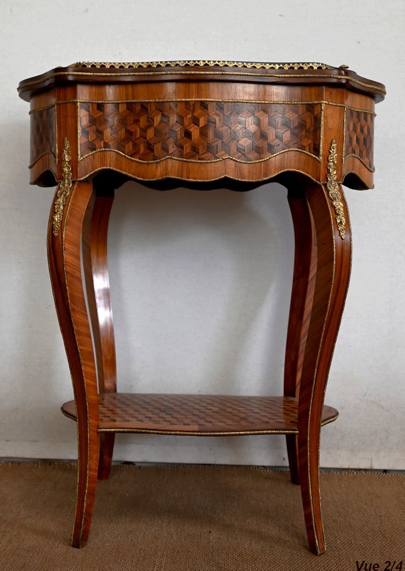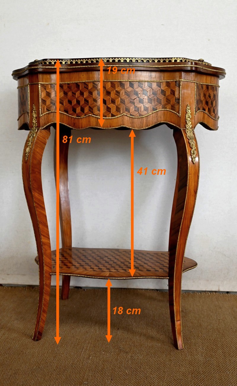Le dessus, dit bouchon, marqueté de losanges formant une succession de cubes parfaitement proportionnés, est pourvu de deux boutons en bronze festonné. L’entourage en dégradé est garni d’une galerie ajourée en bronze. Le couvercle retiré révèle un bac en zinc formant jardinière.
