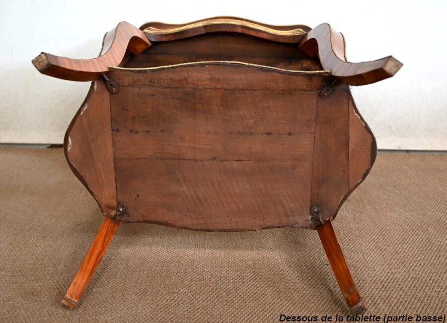 Cet ensemble repose sur quatre pieds en galbe, de section rectangulaire, s’affinant vers le bas. Ils sont plaqués en bois de fil sur les faces avant et arrière, et en frises sur les côtés. Ils sont également agrémentés d’un motif floral en bronze.