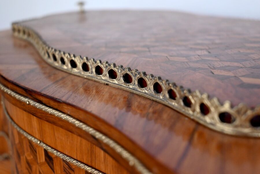 La ceinture à mouvement, galbée toutes faces, est aussi ventrue sur les côtés. On y retrouve les mêmes marqueteries de cubes, encadrées de petites baguettes de laiton ciselé, également présentent sur toutes les arêtes du meuble.