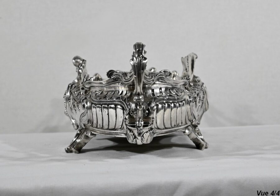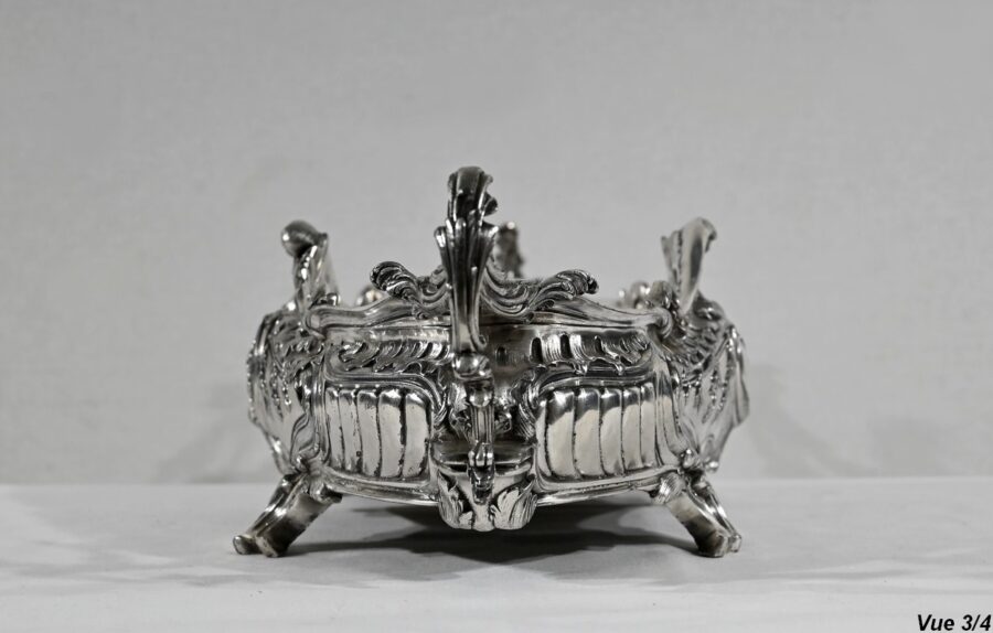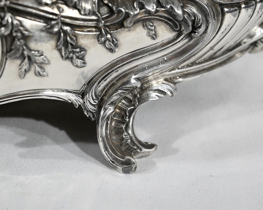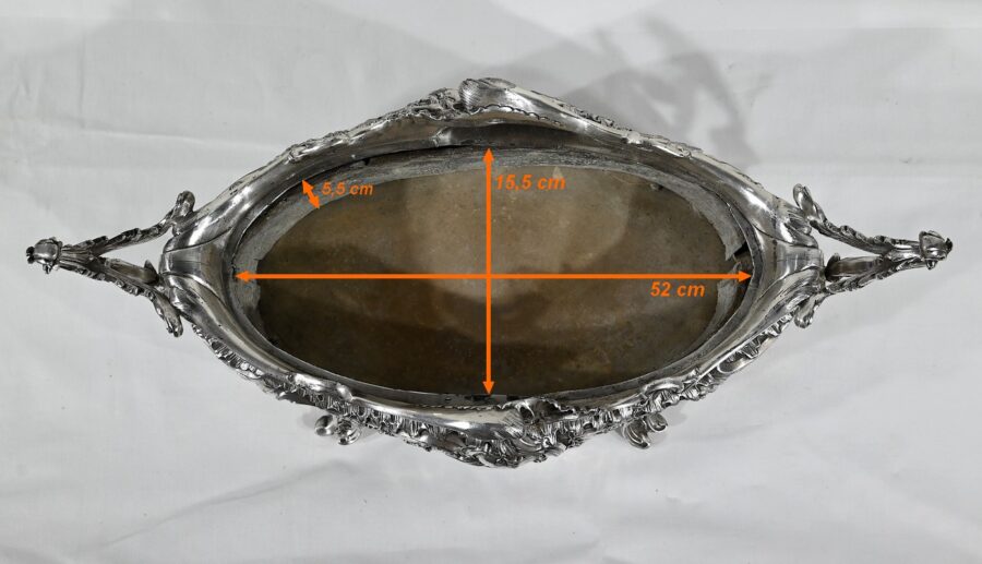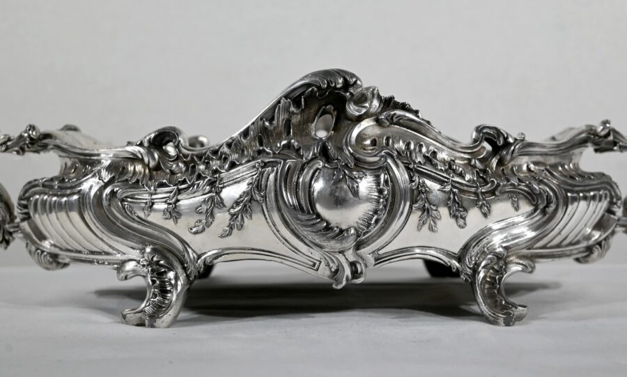 Jardinière ovale, en bronze argenté, de style Louis XV. Le corps, orné sur les parties pansues de coquilles centrales, est entièrement ciselé de rocaille, de rinceaux et de branches fleuries.
