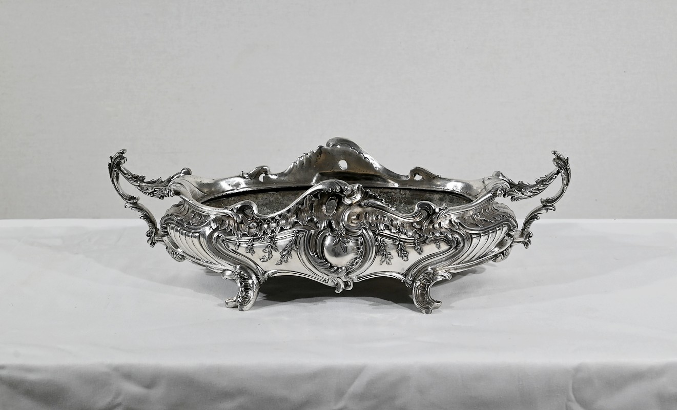 Jardinière de la Belle Époque en bronze argenté à décor de volutes. Ce centre de table ovale repose sur quatre pieds et possède deux poignées ajourées. Il est à noter la présence du poinçon du Maître Orfèvre Victor SAGLIER sous la jardinière. Cette dernière est également munie d’un petit bassin amovible en métal argenté.