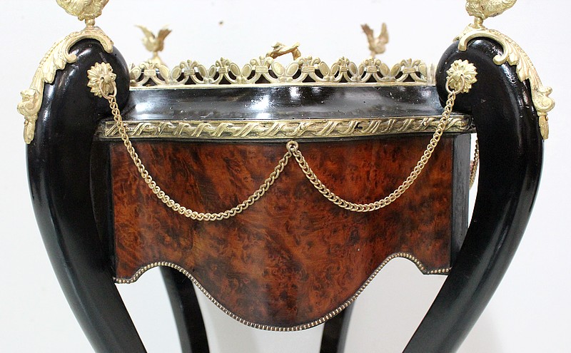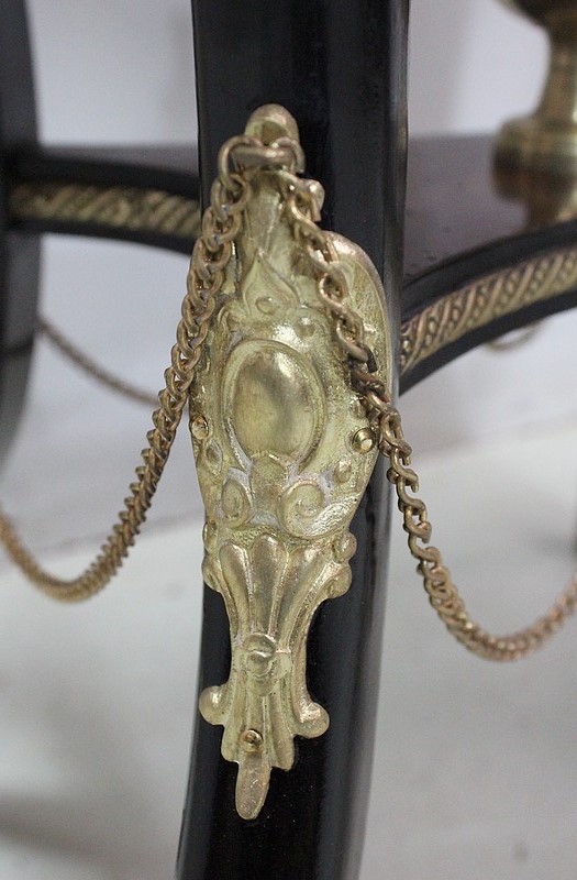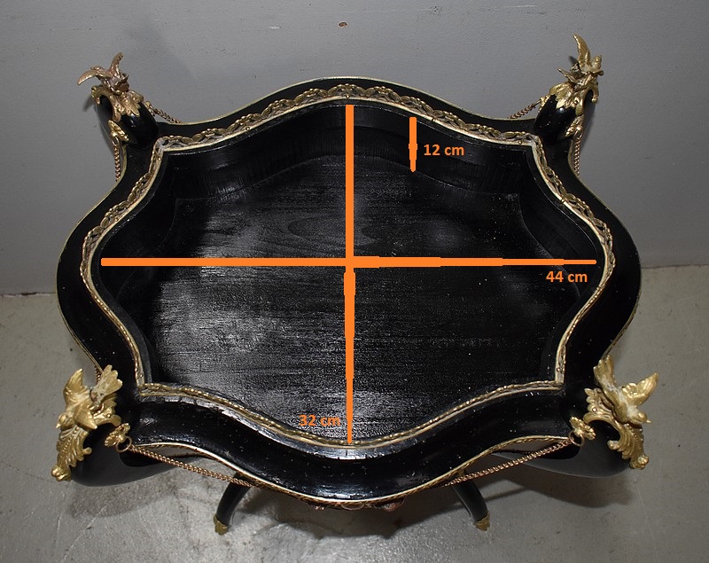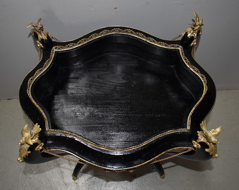 L’ensemble repose sur quatre jambes en bois noirci généreusement cambrées. Elle sont enjolivées en partie haute de Bronzes représentant des oiseaux aux ailes déployées sur des chutes feuillagées. Des ornements du même alliage précieux garnissent le creux de ces quatre pieds terminés par des Sabots. On notera la présence de fines chaines suspendues entre les Bronzes, apportant de la légèreté à ce meuble Décoratif déjà plein de finesse.