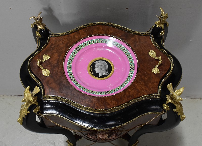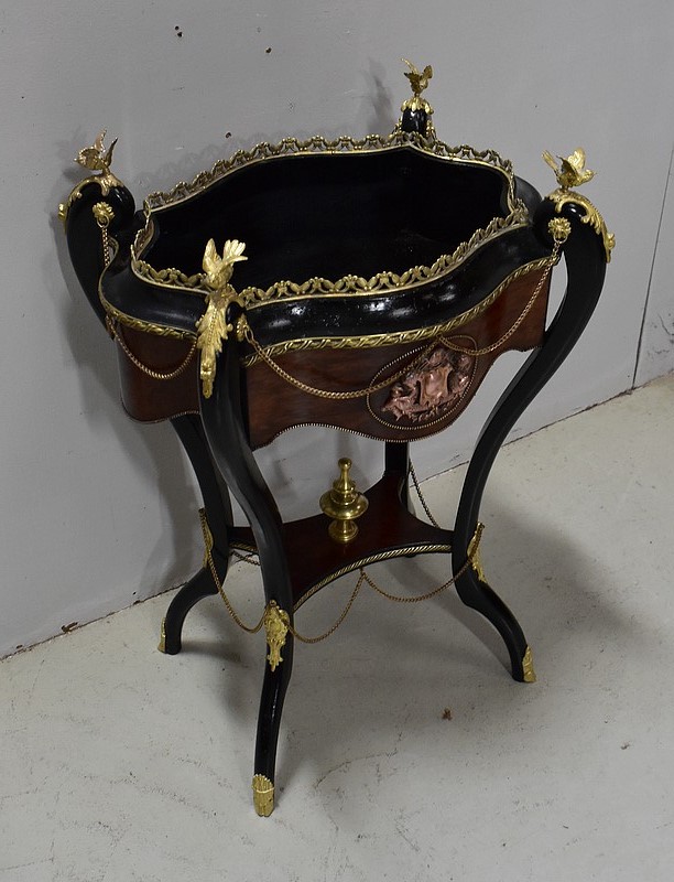 Jardinière à forme Mouvementée, ouvrant sur le dessus par un couvercle aux lignes arrondies, en Placage de Ronce de Thuya. Il est monté d’une assiette de Porcelaine à dominante Rose, agrémentée au centre un profil de soldat Antique, et sur son pourtour d’une frise colorée. Deux poignées en Bronze découpé permettent de retirer ce plateau et de découvrir un compartiment nu, de 12 cm de profondeur, bordé d’une Galerie ajourée. On pourra y installer une plante, un rosier, ou d’autres objets plus inattendus, comme des Bijoux ou des fruits, si l’on choisi de détourner cette Jardinière de sa fonction initiale.