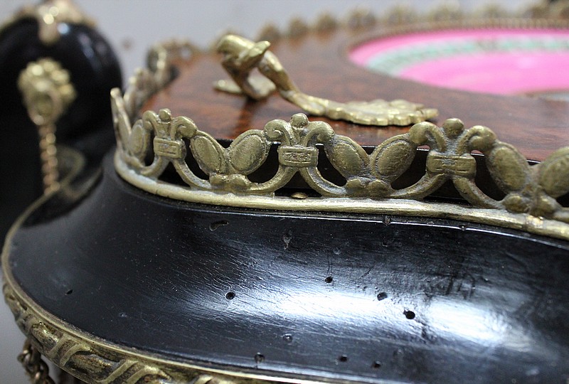 Sa ceinture aux quatre côtés galbés est ornée en façade avant et arrière d’une scène de Putti adossés à un Blason, encerclée d’une frise perlée.