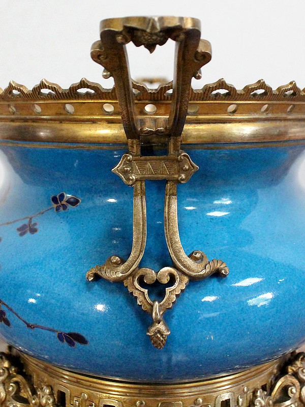 Jardinière oblongue en porcelaine émaillée et ornementée, accompagnée de bronze doré.