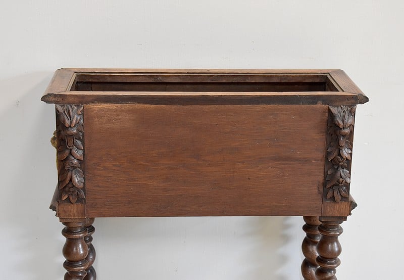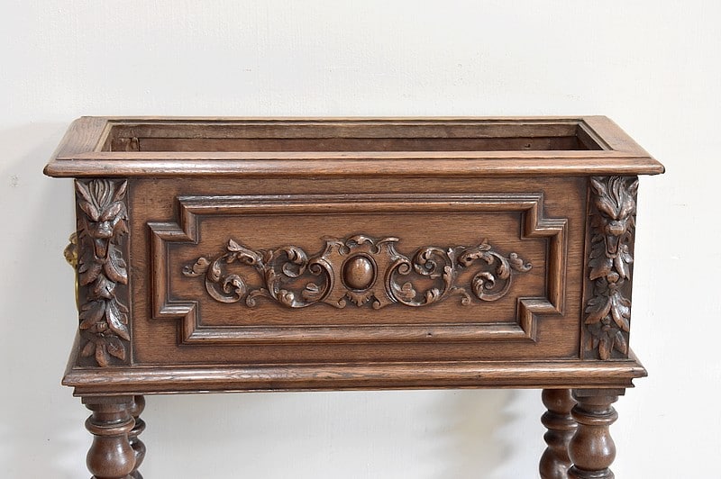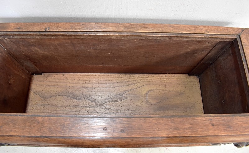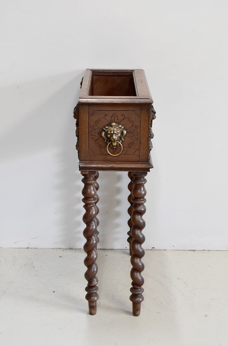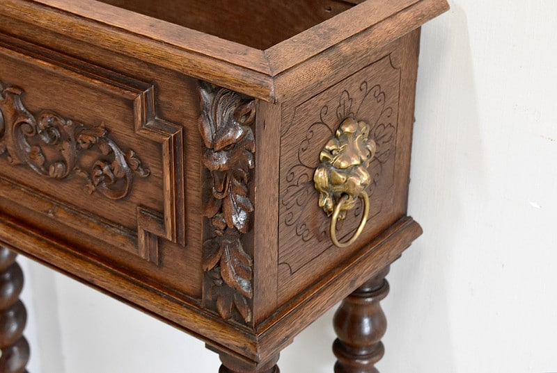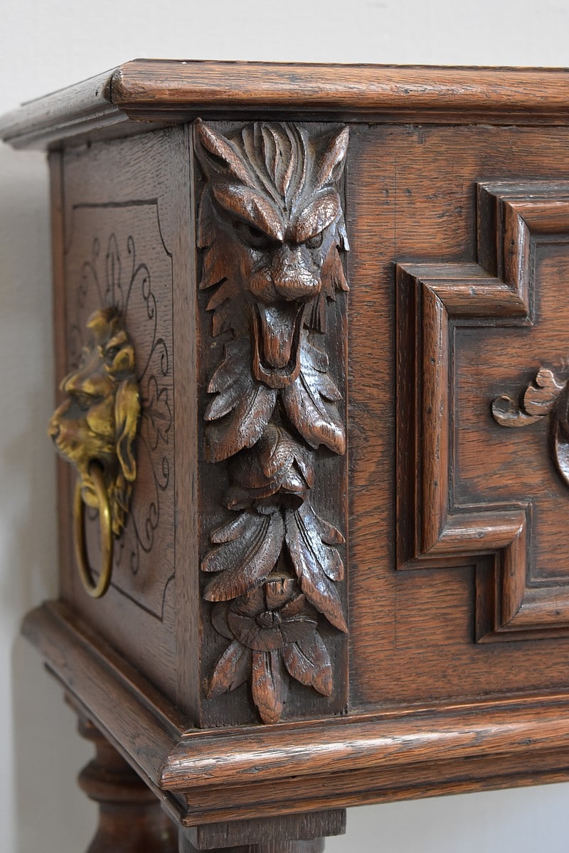 Les côtés sont ornés d’une tête de lion en laiton tenant un anneau dans la gueule, superposé à un fond à un motif rainuré.