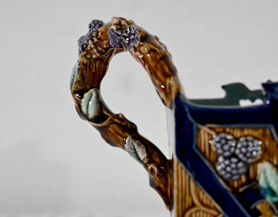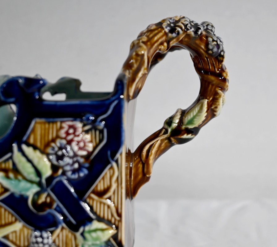 Sorties des fours de la manufacture Fives Lille, ces cache-pots arborent un décor identique, sur la panse et les anses, de mûres, de fleurs et de feuilles dans des tons pastel et marron. Chacun repose sur quatre petits pieds escargots dans le même esprit.