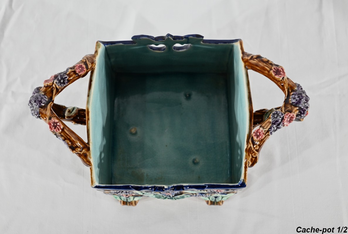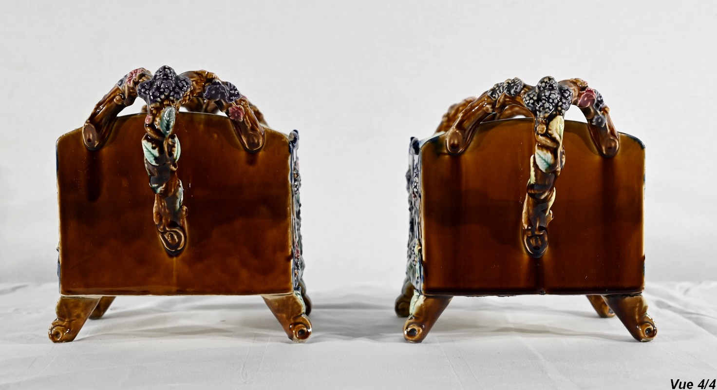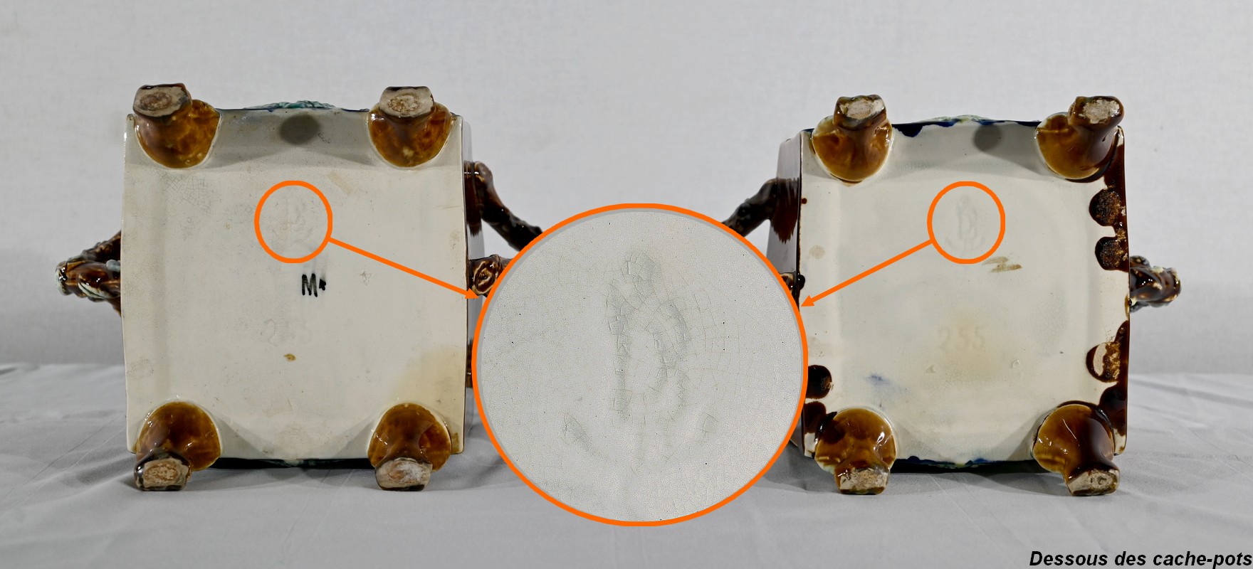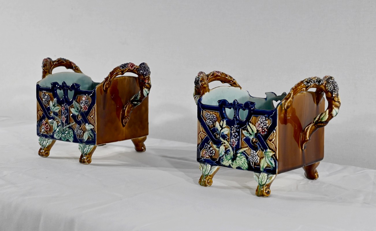 Paire de cache-pots carrés, en pâte d’Argile délayée dite ’’Barbotine’’, du faïencier Belge Gustave De Bruyn (1838-1916) dont le blason est gravé sous le fond de chaque article.