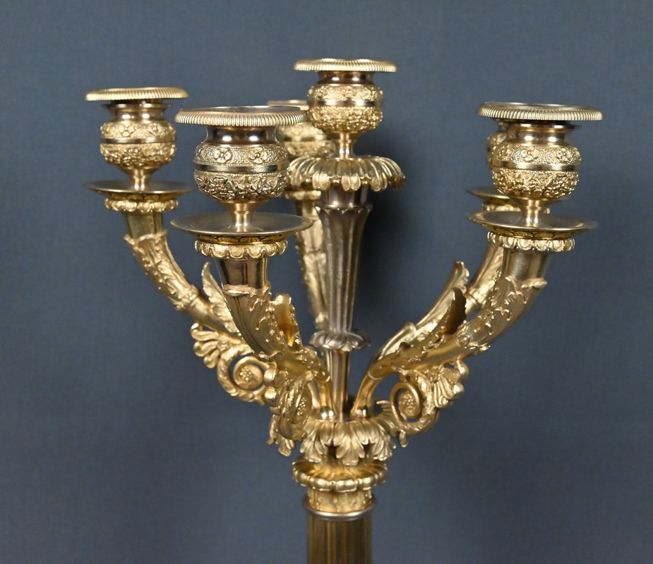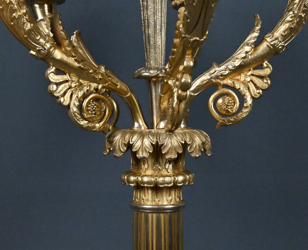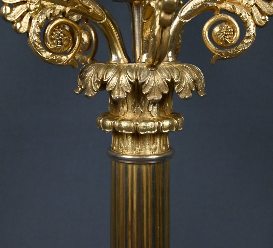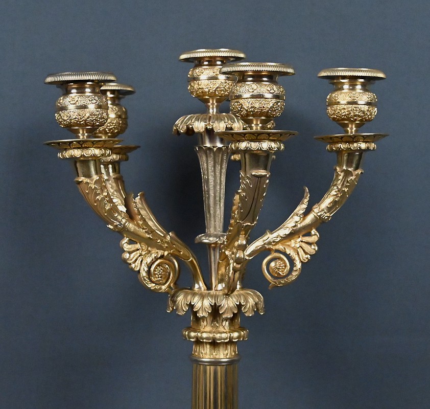 Le fût, en gaine cannelée, est orné de feuillages et de palmettes finement ciselés. Il supporte un bouquet de cinq bras de lumière en forme de cornes d’abondance, décorés de volutes florales et de rinceaux, dont la richesse ornementale évoque pleinement l’esthétique néoclassique tardive. L’ensemble est couronné d’un bougeoir central posé sur une fleur en corolle, apportant une verticalité et un équilibre visuel remarquable.