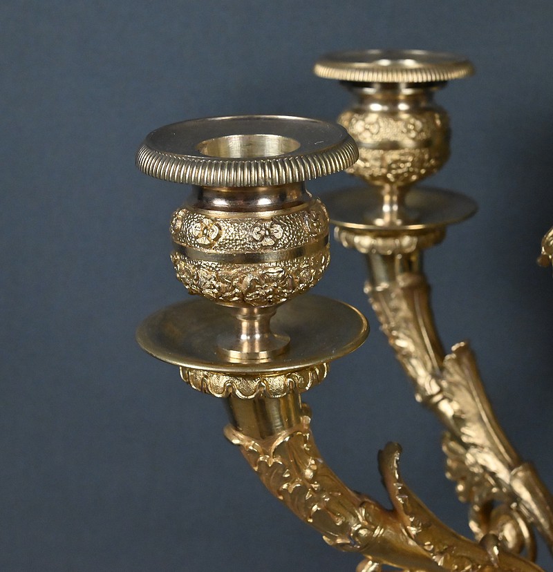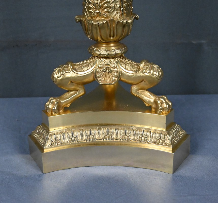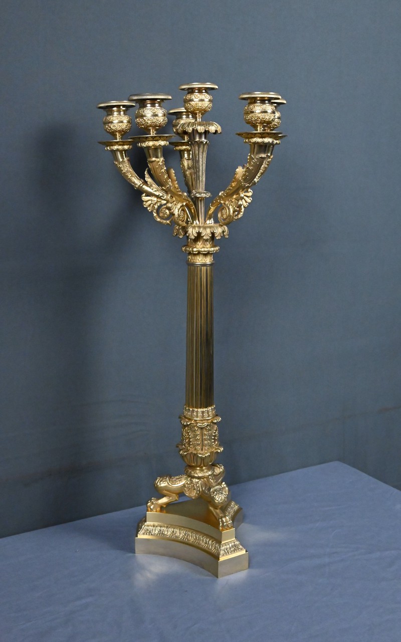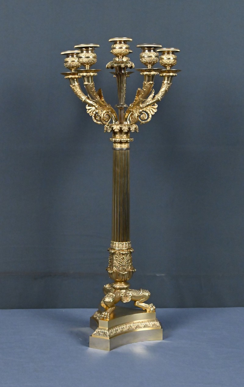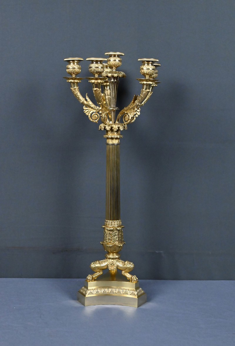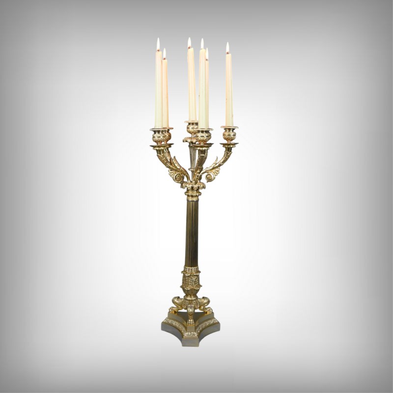 Ce candélabre en bronze doré, typique du raffinement de l’époque Restauration, séduit par l’harmonie de ses proportions et la finesse exceptionnelle de sa ciselure.