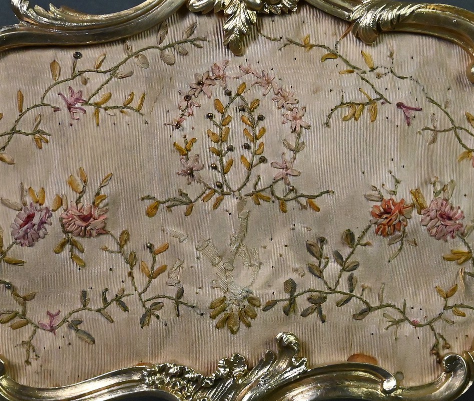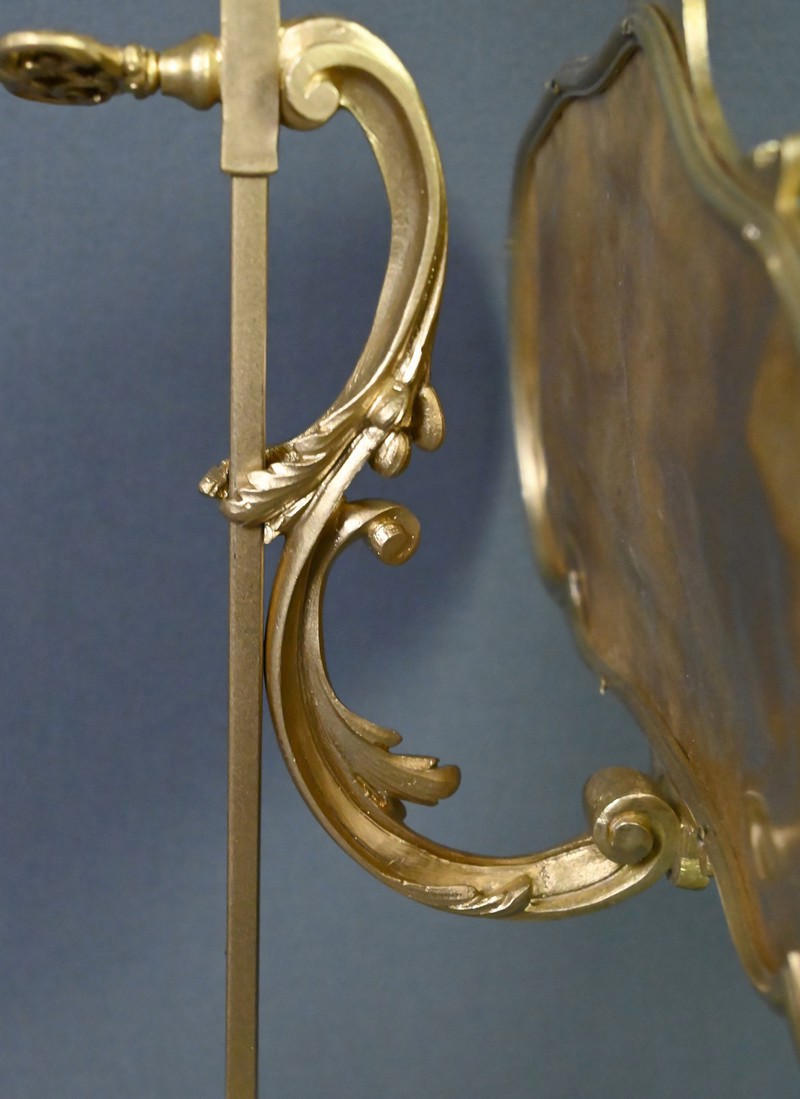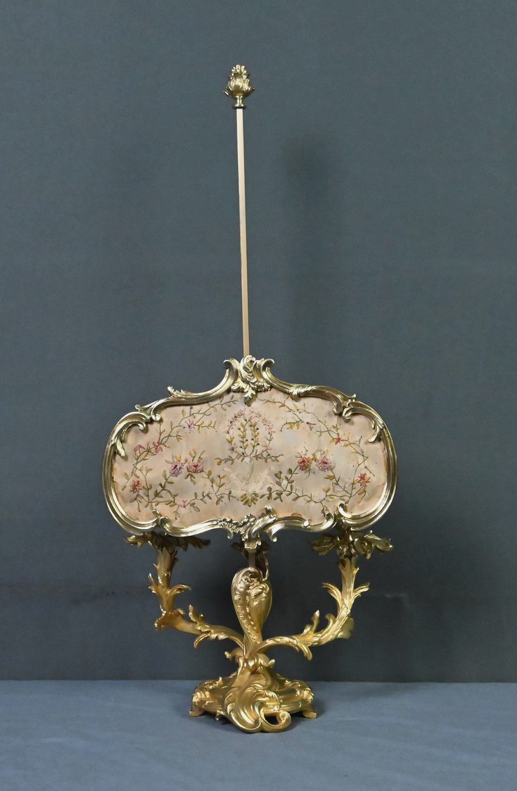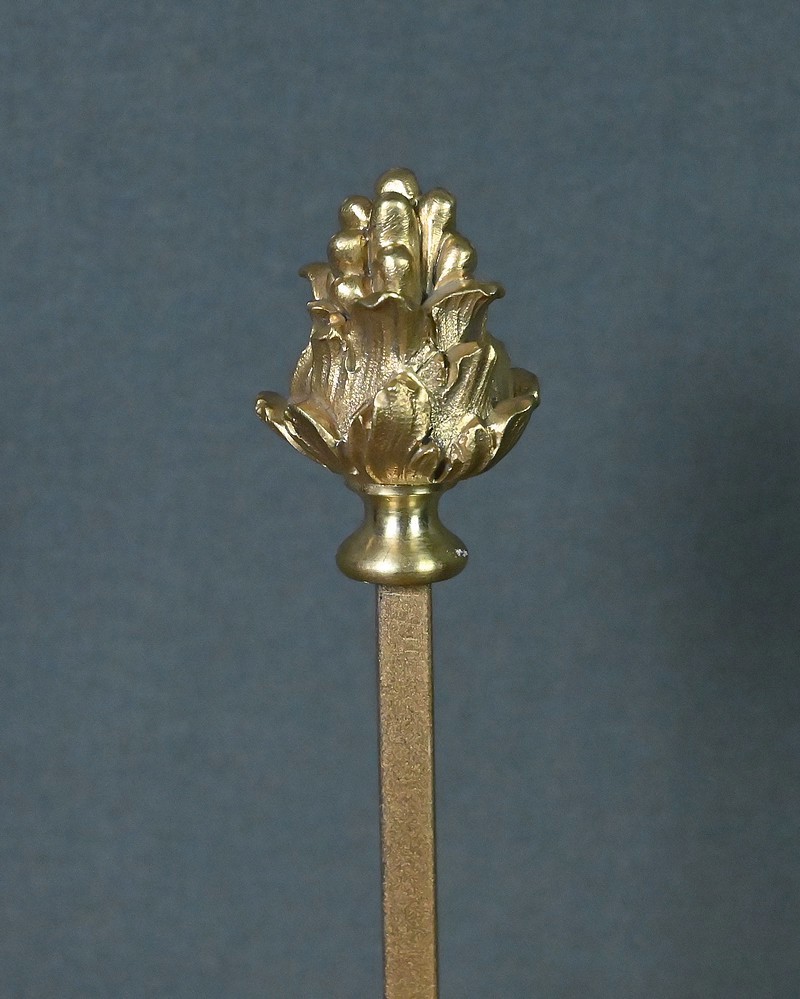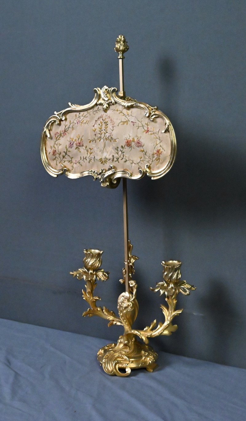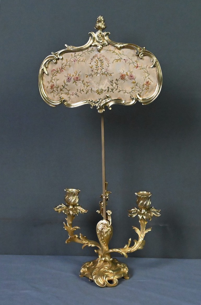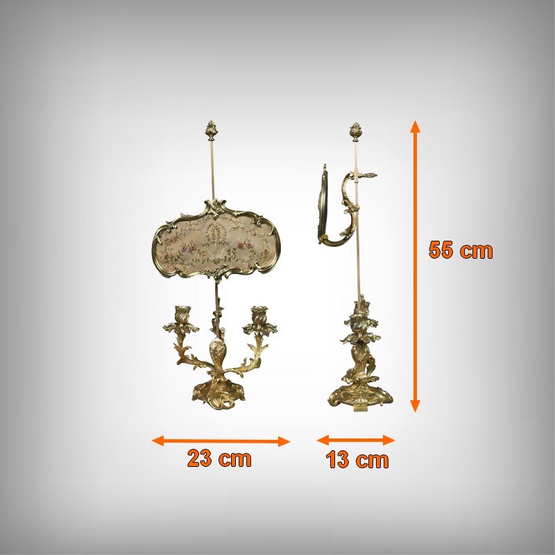 Au-dessus, un délicat écran en tissu brodé de fleurettes adoucit subtilement l’éclat des bougies. Monté sur une tige en bronze doré dans la continuité du fût, cet écran est réglable en hauteur, permettant de moduler la lumière selon l’ambiance souhaitée.