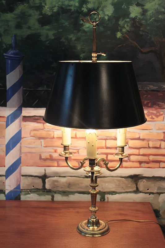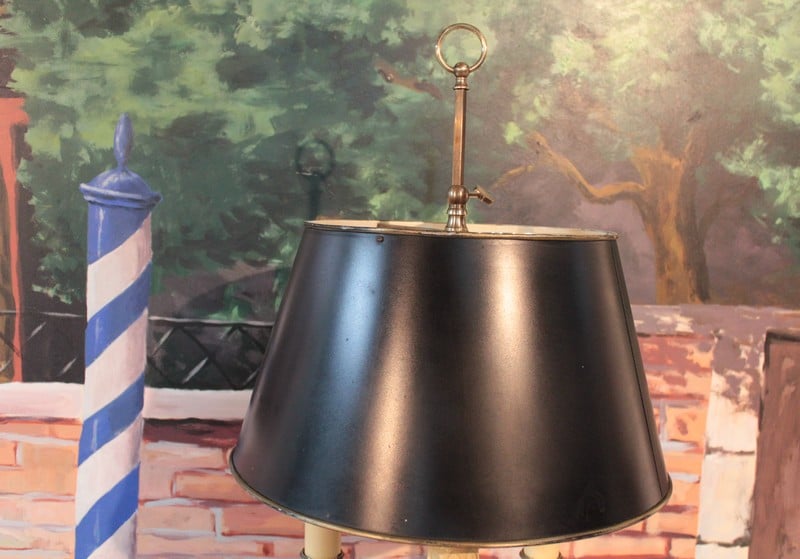 Chandelier en bronze électrifié à 3 bras de lumière. Il est coiffé d’un abat-jour en laiton réglable de couleur noire à l’extérieur et ivoire à l’intérieur.