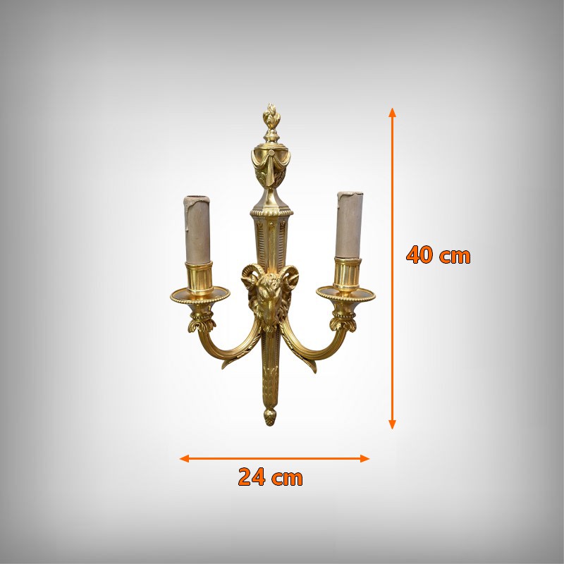 Chacune de ces appliques figurent des détails décoratifs saisissants : Les bougeoirs sont perlés et soulignés de rinceaux délicats, au centre trône une superbe tête de bélier, symbole de force et de raffinement. En haut de chaque applique, une urne stylisée avec flambeau, rehaussée d’un drapé sculpté, ajoute une dimension théâtrale à l’ensemble. Le fût strié se termine par des asperges inversées et une petite pomme de pin. Ces pièces décoratives transcendent la simple fonction d’éclairage : elles apportent une touche de noblesse à tout intérieur, qu’il soit classique ou résolument contemporain.