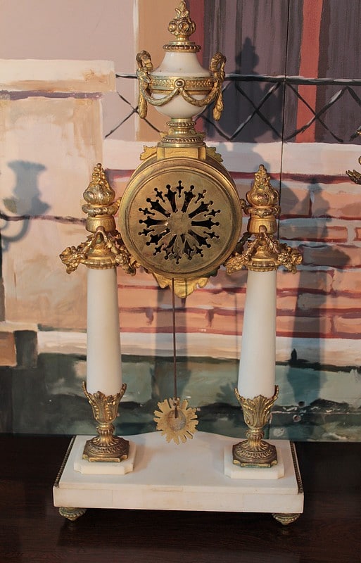 Garniture de cheminée Louis XVI en marbre blanc et bronze composée d’une pendule portique et de deux candélabres.