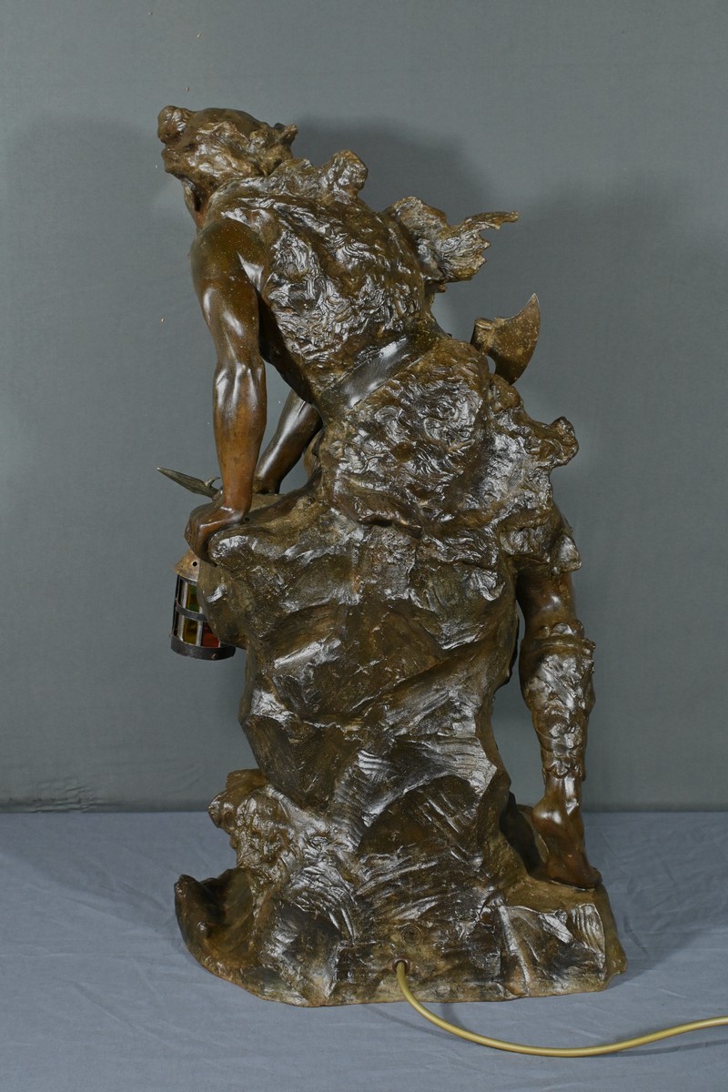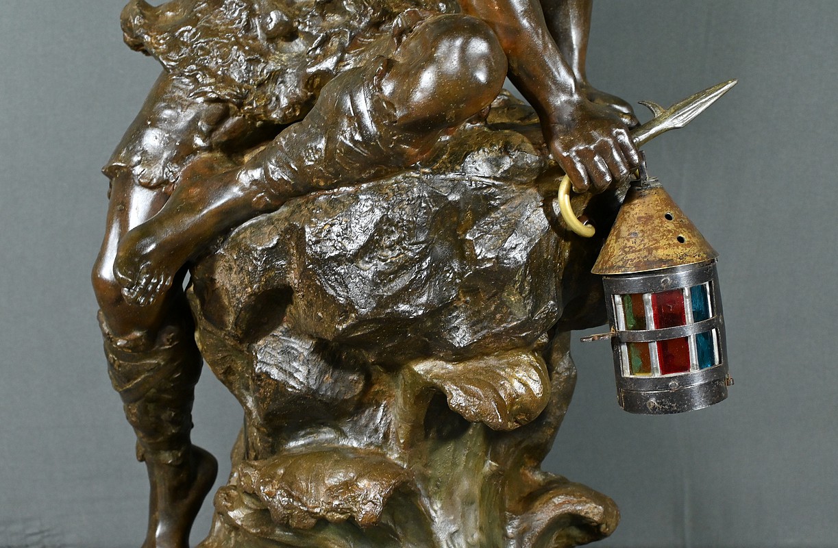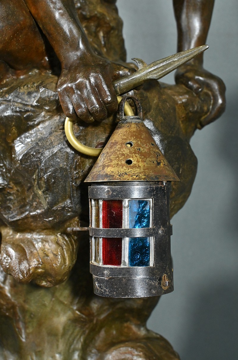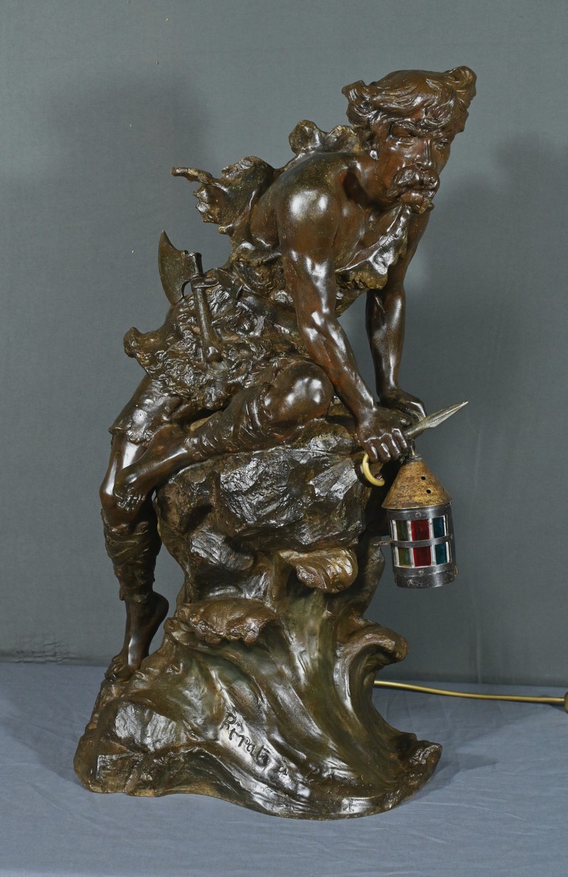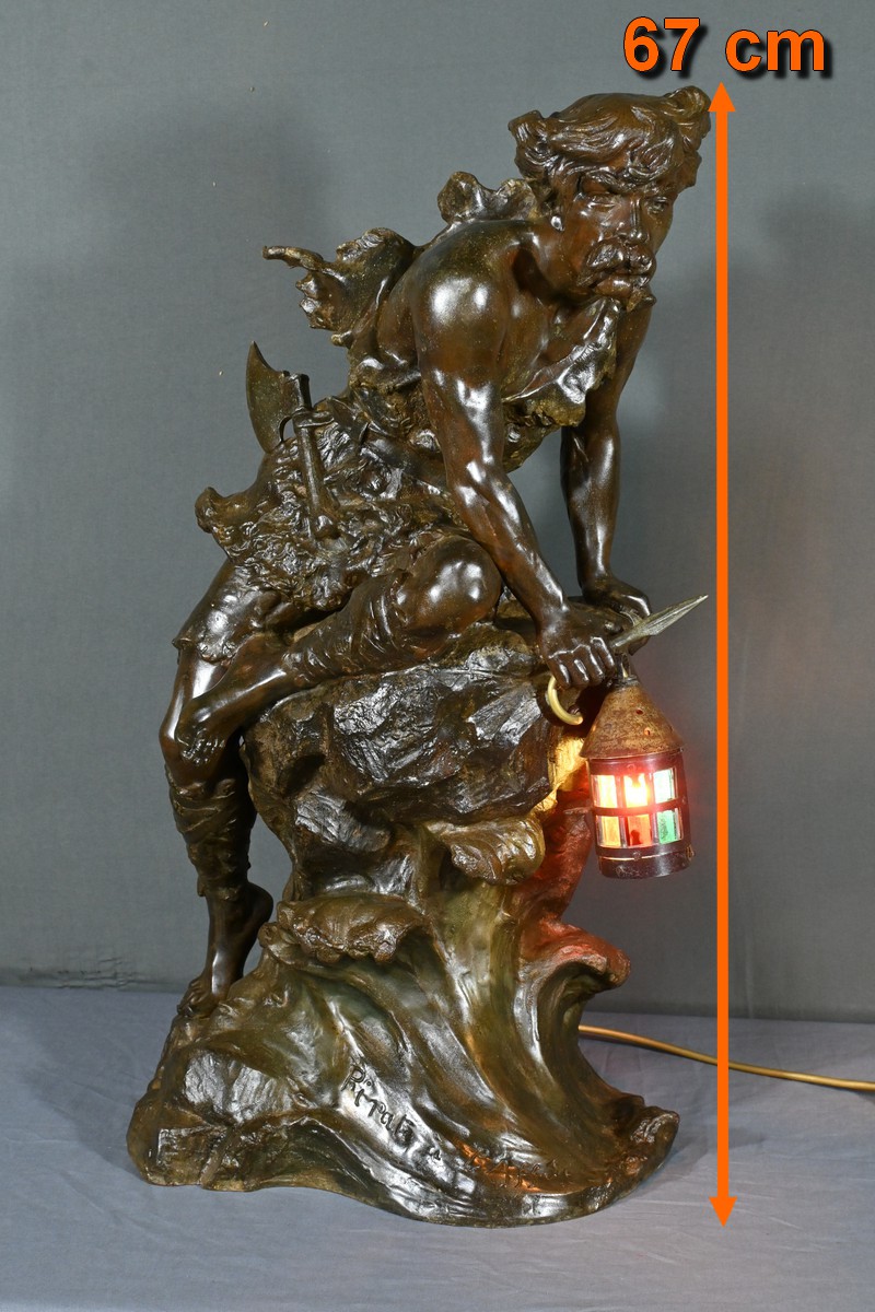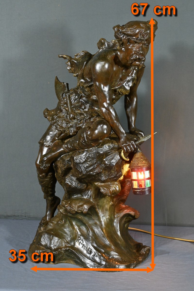 Grande lampe en régule, signée par l’artiste A. Foretay, représentant un pirate sur un rocher en position d’affût, prêt à attaquer. La sculpture, datant du début du XXe siècle, est richement détaillée, capturant l’essence du personnage avec précision. Le pirate tient une lanterne allumée dans sa main droite, émettant une lumière chaleureuse à travers des vitraux colorés. Les vêtements et accessoires typiques de l’époque, y compris une hache accrochée à sa ceinture, ajoutent une touche d’authenticité et de réalisme à cette œuvre. La base de la sculpture imite un rocher, renforçant l’impression de mouvement et de vigilance du pirate. Ajout décoratif à tout intérieur, cette épreuve séduira les collectionneurs et les amateurs d’objets insolites