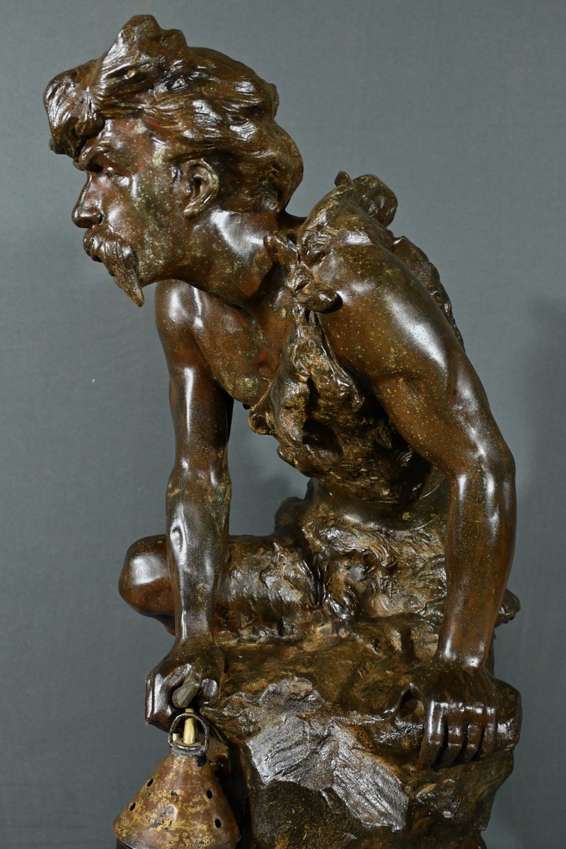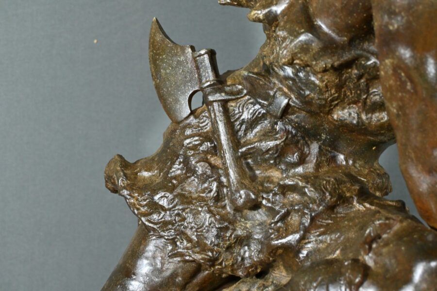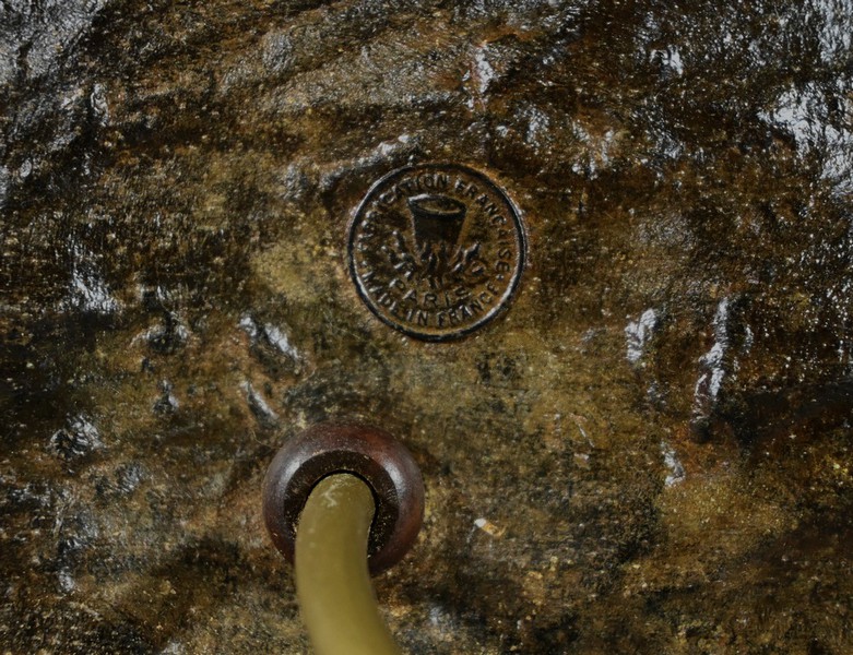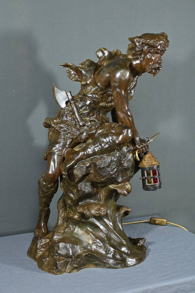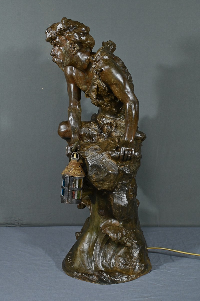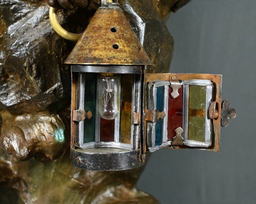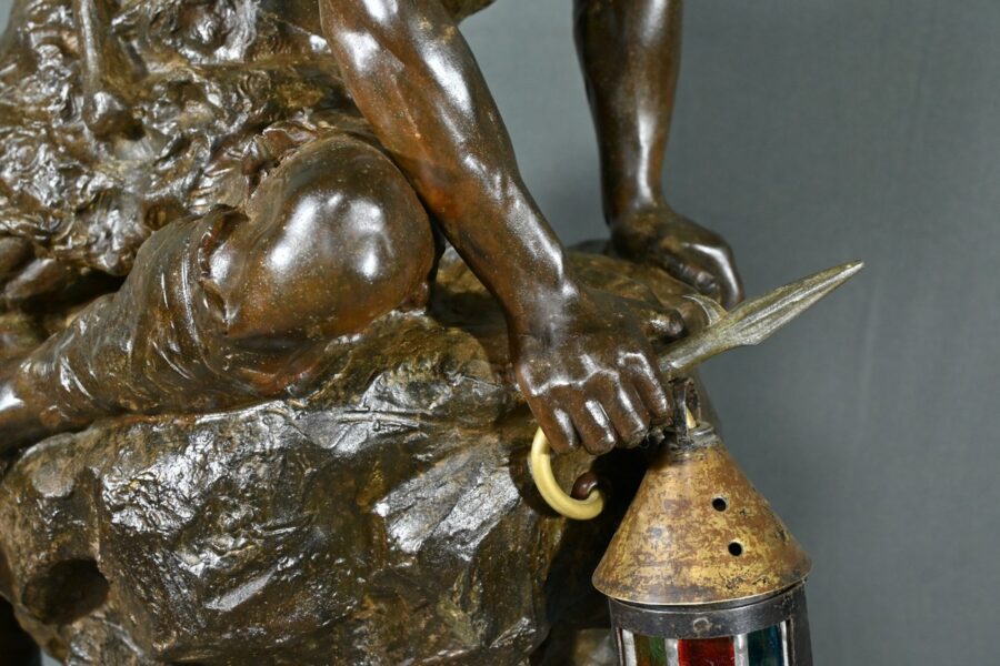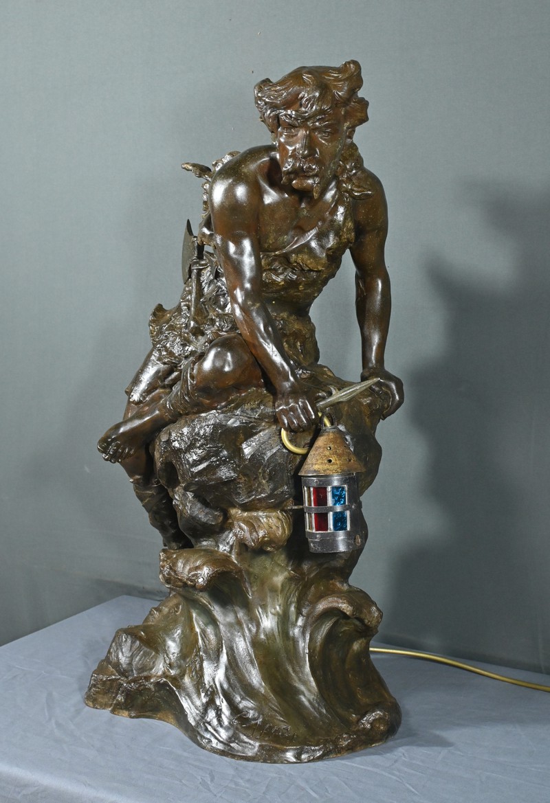 Grande lampe en régule, signée par l’artiste A. Foretay, représentant un pirate sur un rocher en position d’affût, prêt à attaquer. La sculpture, datant du début du XXe siècle, est richement détaillée, capturant l’essence du personnage avec précision. Le pirate tient une lanterne allumée dans sa main droite, émettant une lumière chaleureuse à travers des vitraux colorés. Les vêtements et accessoires typiques de l’époque, y compris une hache accrochée à sa ceinture, ajoutent une touche d’authenticité et de réalisme à cette œuvre. La base de la sculpture imite un rocher, renforçant l’impression de mouvement et de vigilance du pirate. Ajout décoratif à tout intérieur, cette épreuve séduira les collectionneurs et les amateurs d’objets insolites