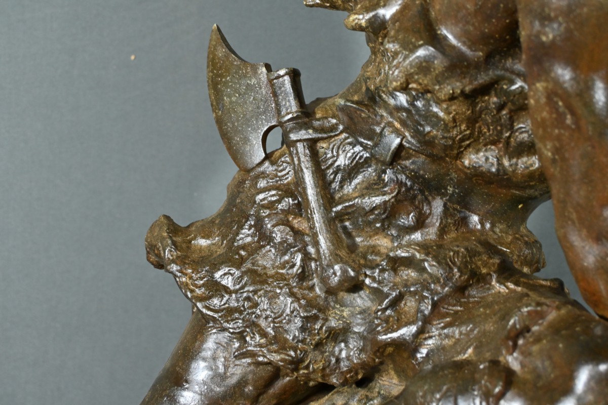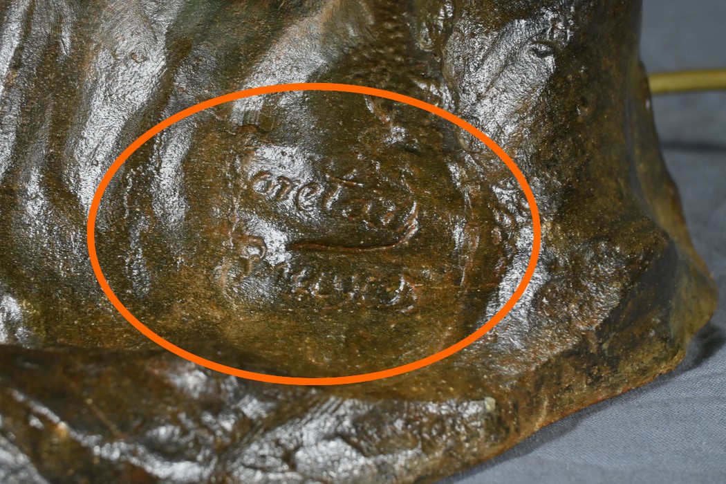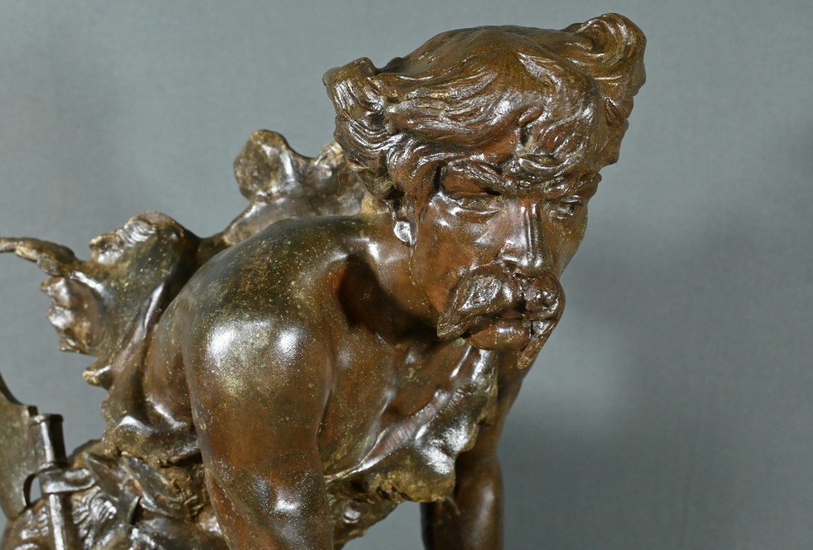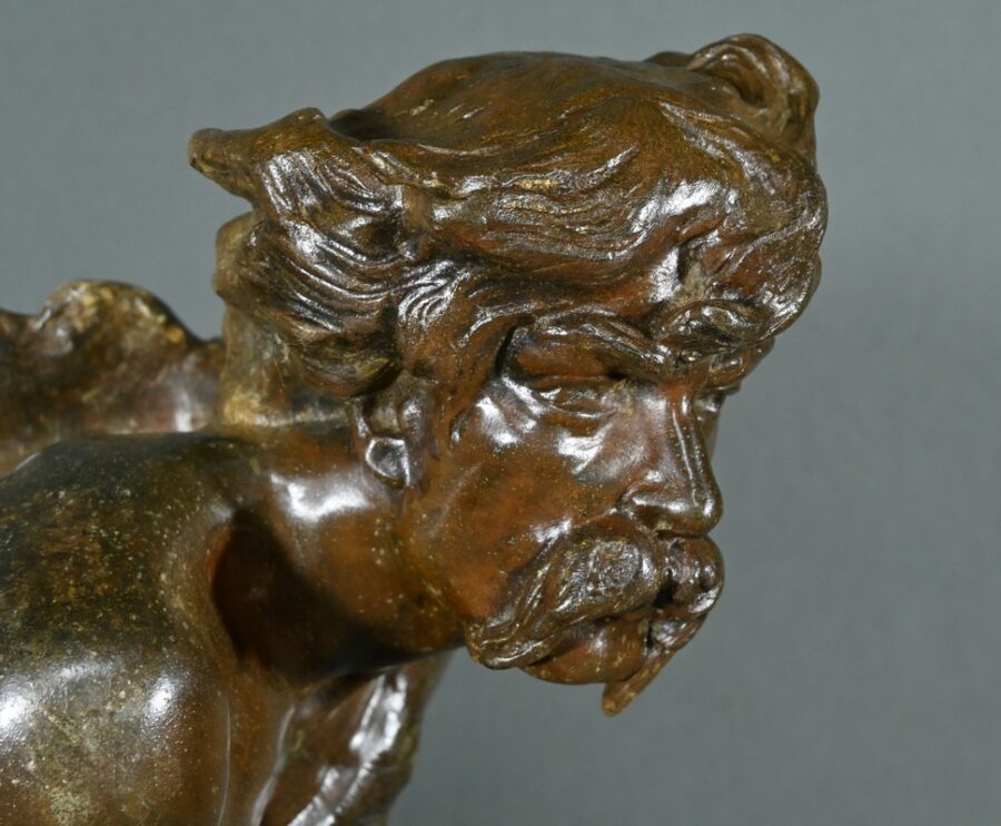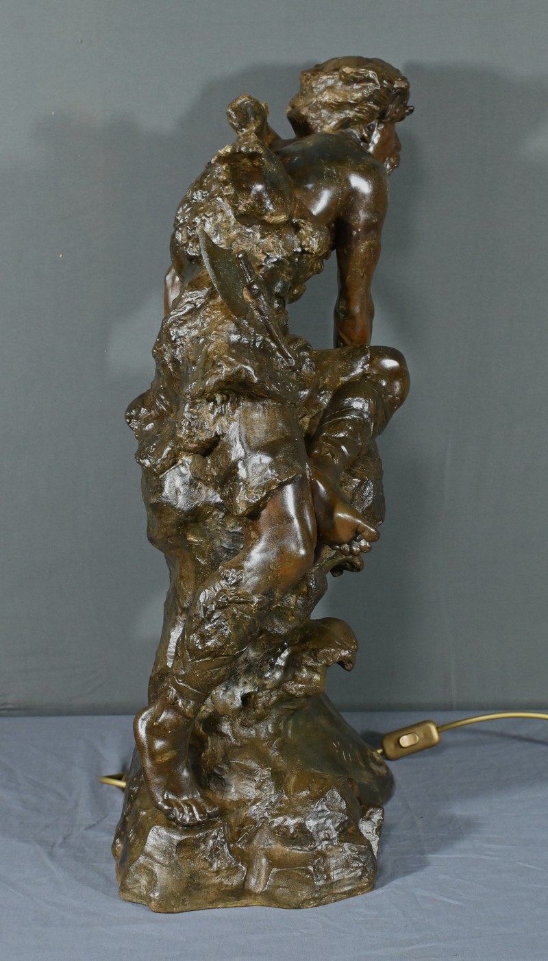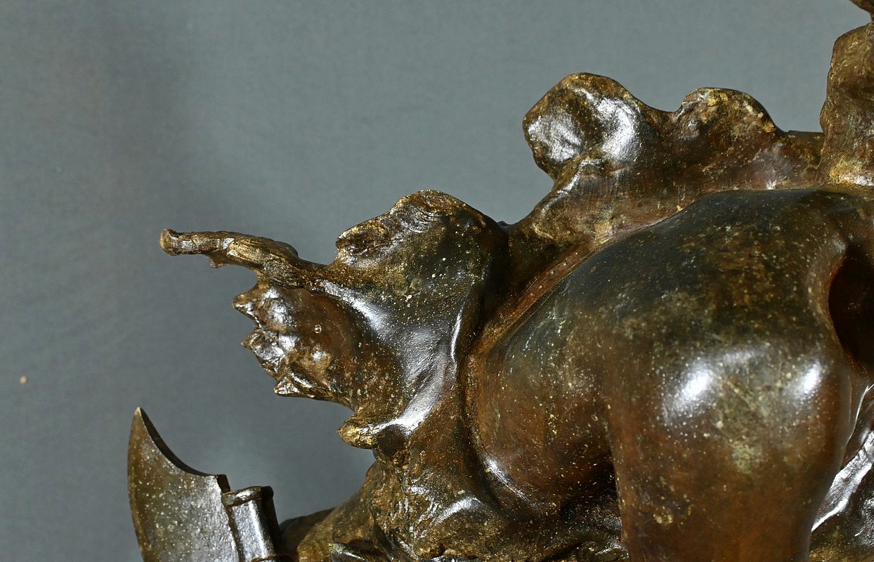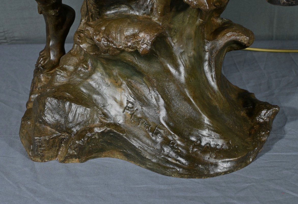 Grande lampe en régule, signée par l’artiste A. Foretay, représentant un pirate sur un rocher en position d’affût, prêt à attaquer. La sculpture, datant du début du XXe siècle, est richement détaillée, capturant l’essence du personnage avec précision. Le pirate tient une lanterne allumée dans sa main droite, émettant une lumière chaleureuse à travers des vitraux colorés. Les vêtements et accessoires typiques de l’époque, y compris une hache accrochée à sa ceinture, ajoutent une touche d’authenticité et de réalisme à cette œuvre. La base de la sculpture imite un rocher, renforçant l’impression de mouvement et de vigilance du pirate. Ajout décoratif à tout intérieur, cette épreuve séduira les collectionneurs et les amateurs d’objets insolites