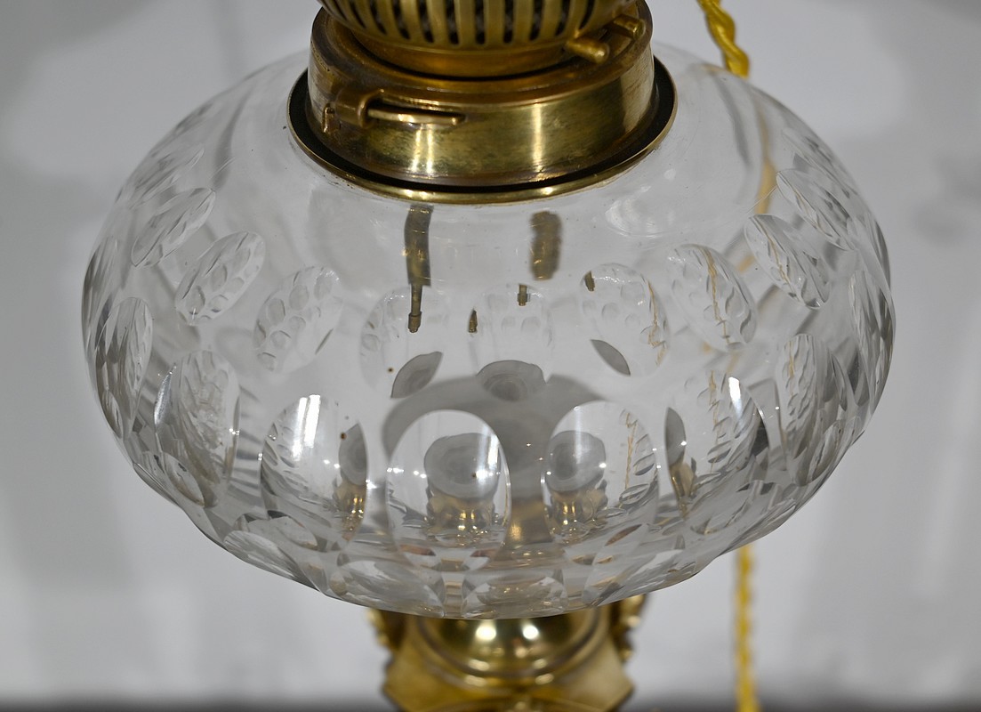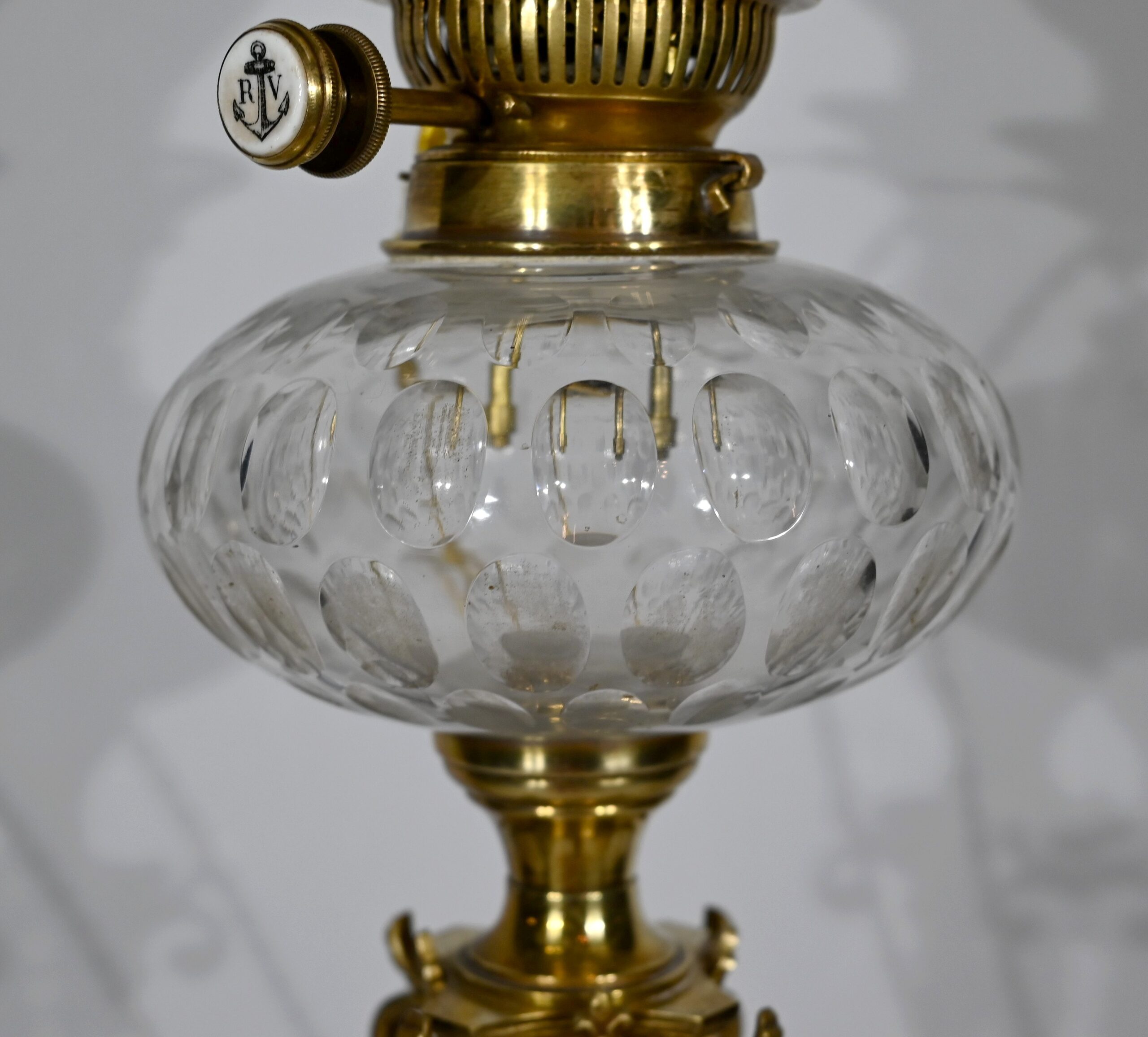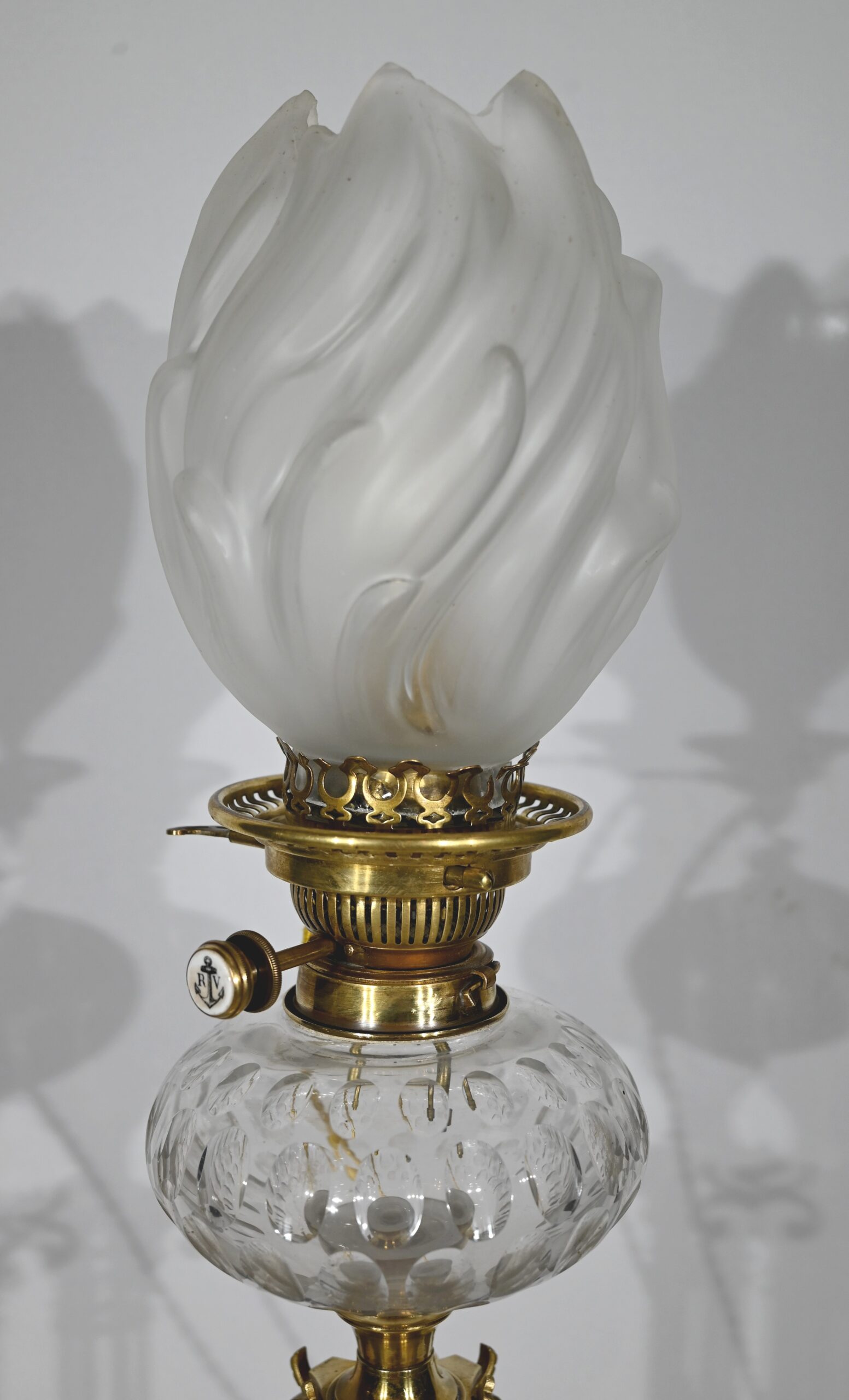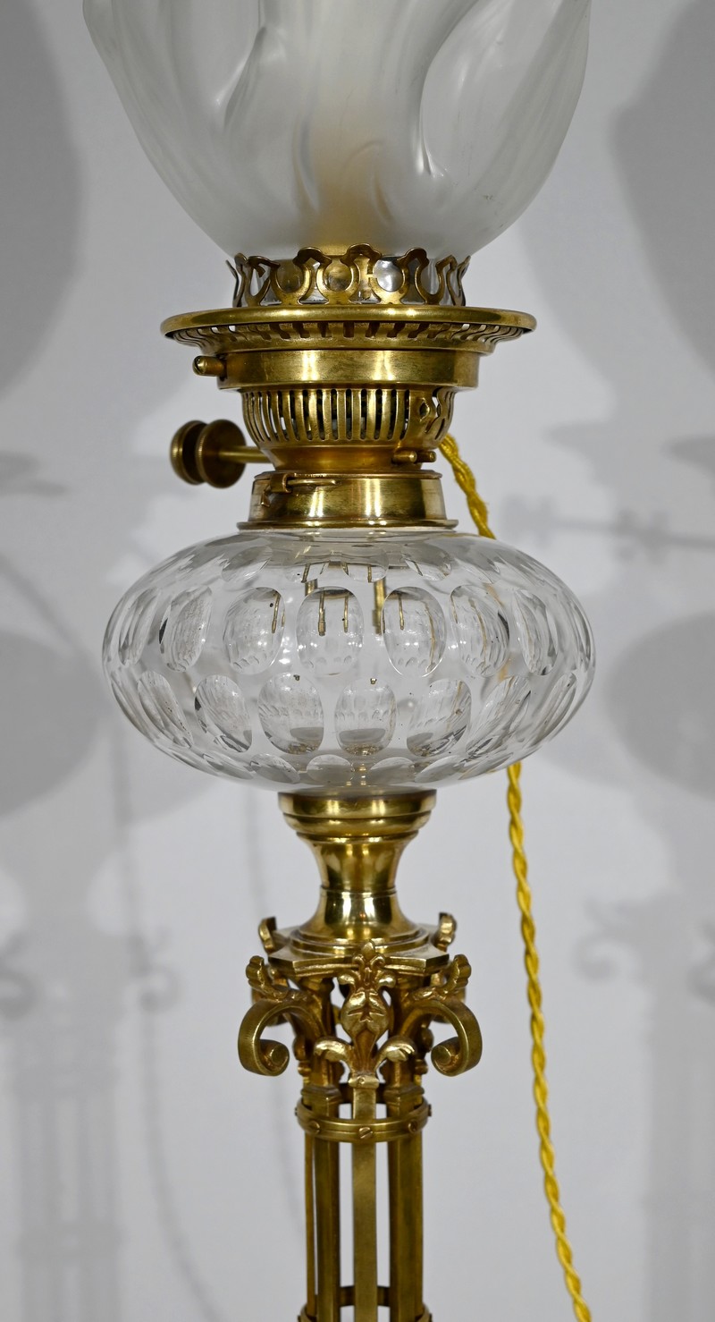 Grande Lampe à pétrole, avec mécanisme et fût ajouré en laiton, à décors en volutes et feuillages.