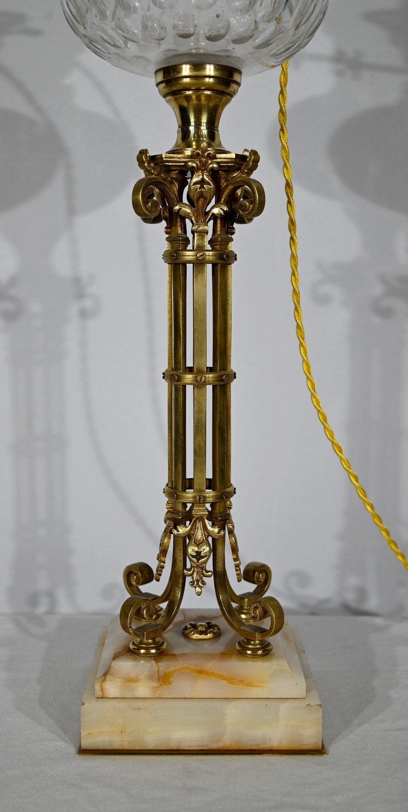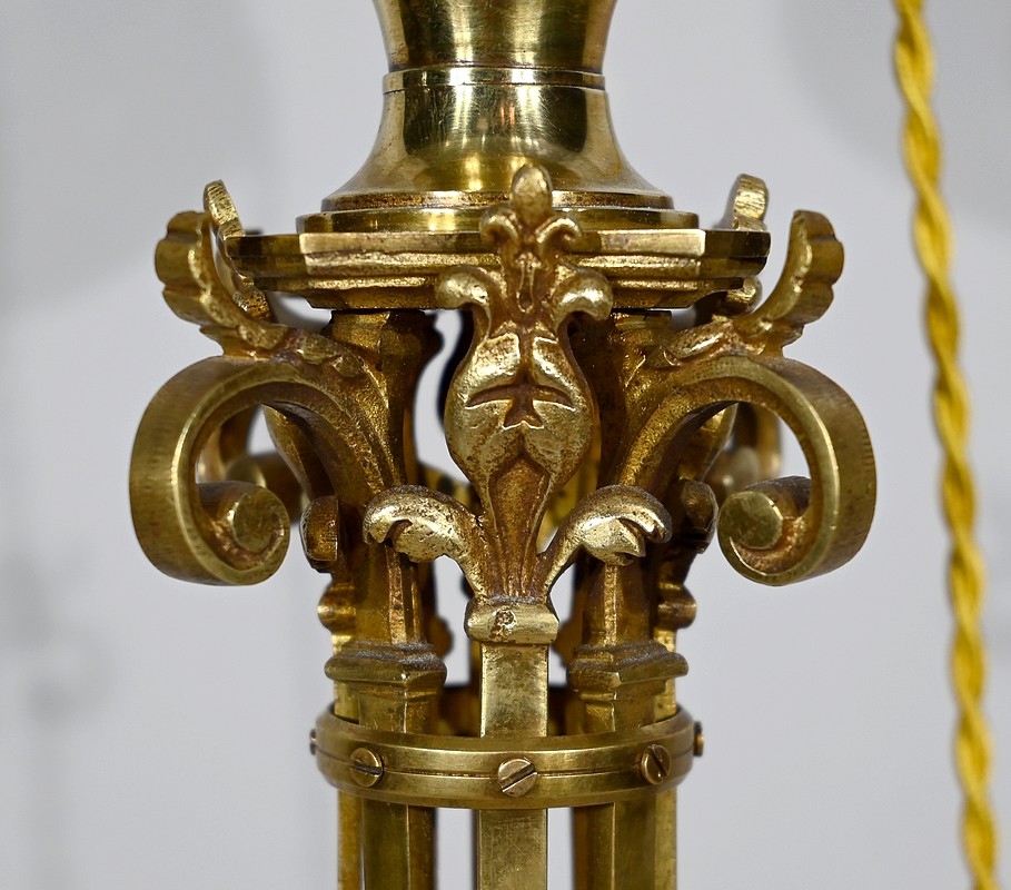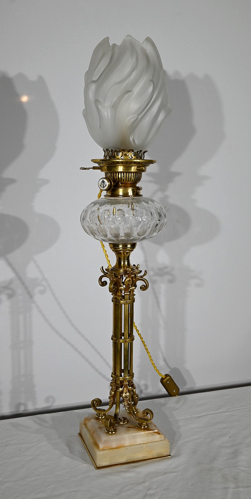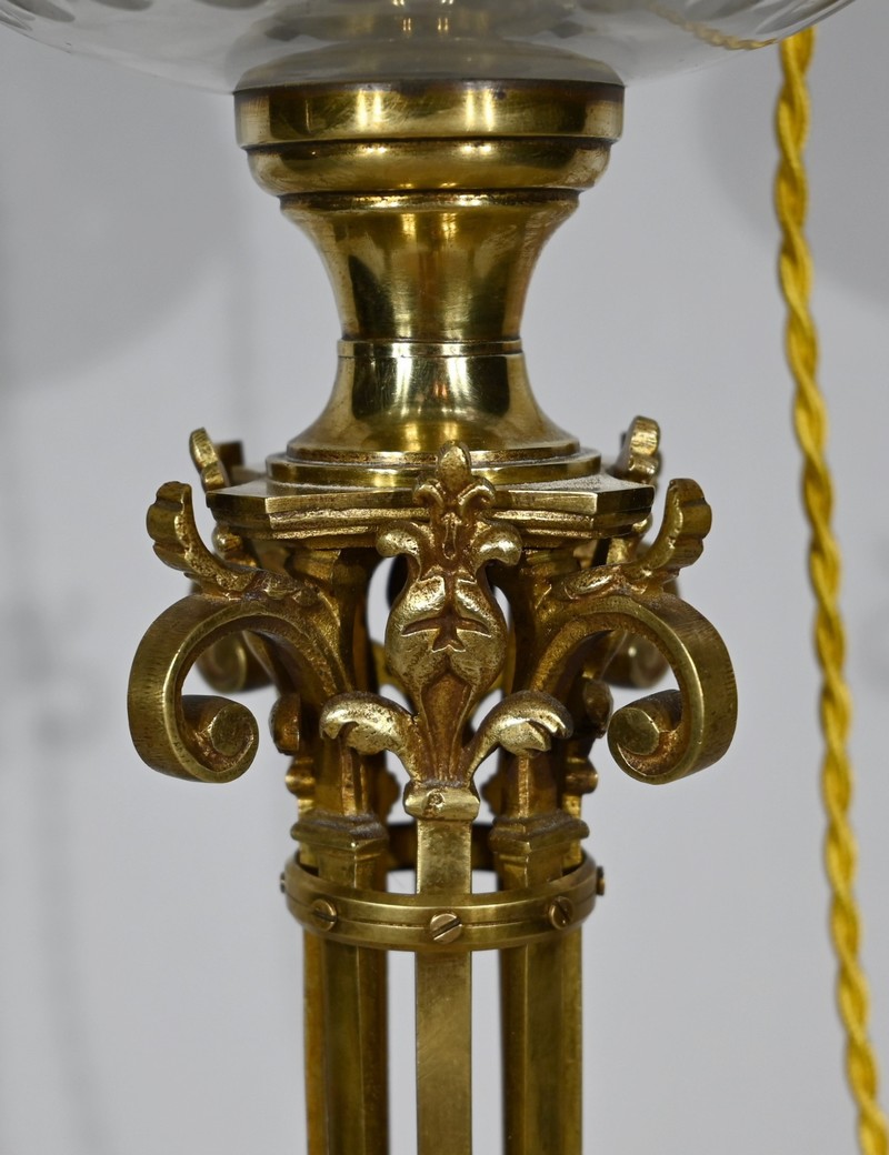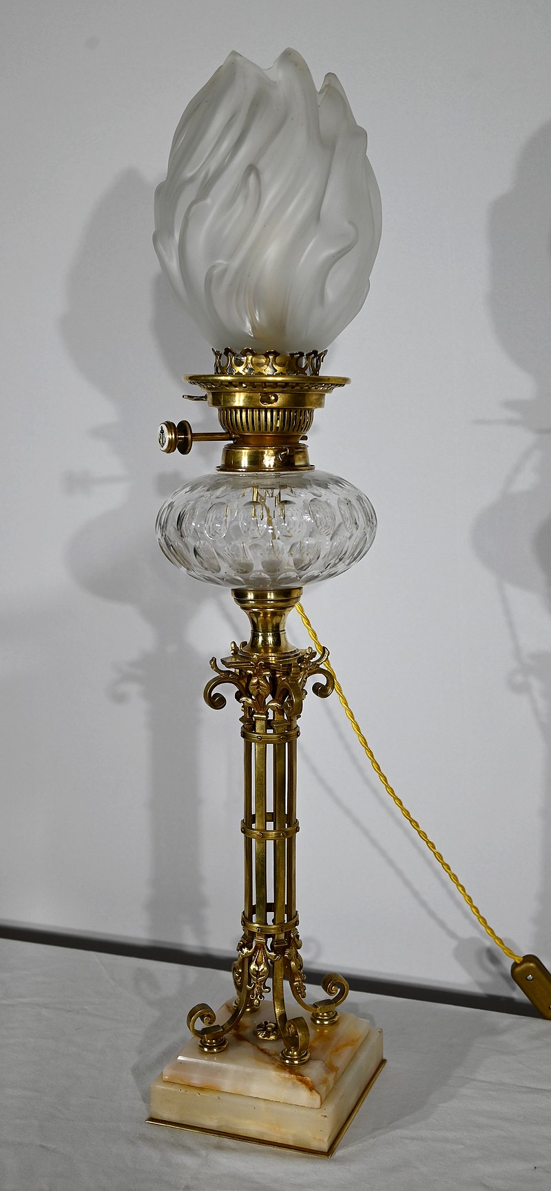 Grande Lampe à pétrole, avec mécanisme et fût ajouré en laiton, à décors en volutes et feuillages.