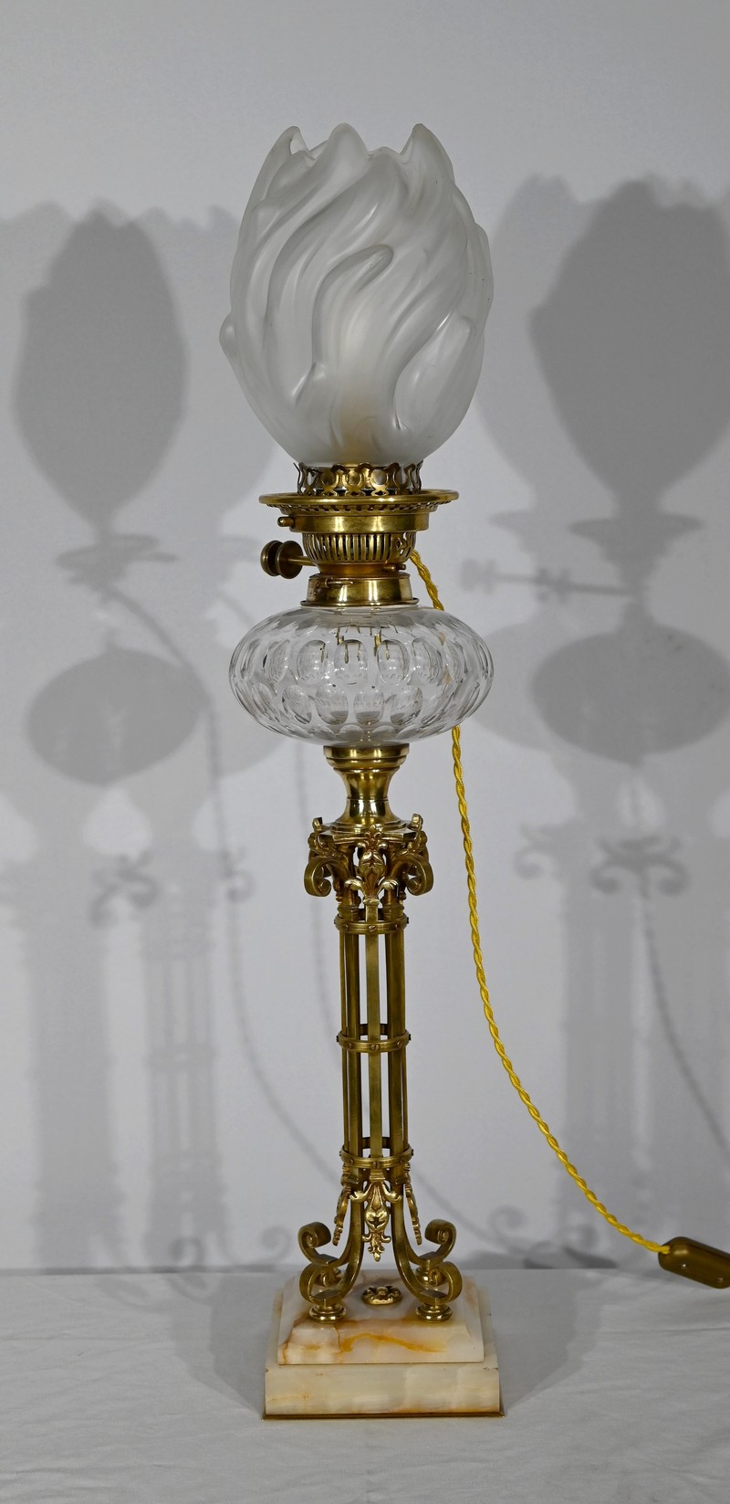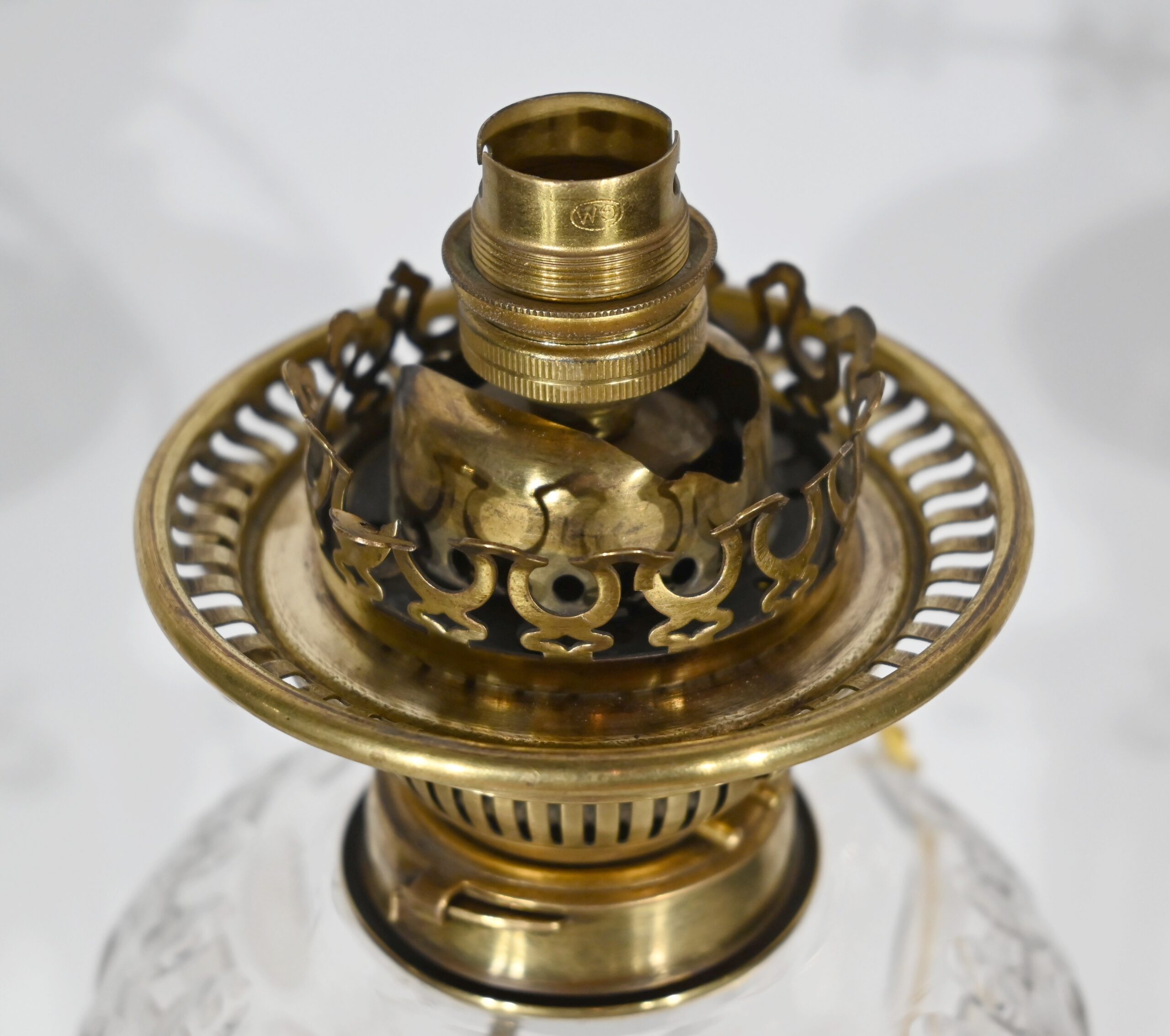 Le globe et le réservoir sont en verre, en tulipe pour le premier, à facettes pour le second.