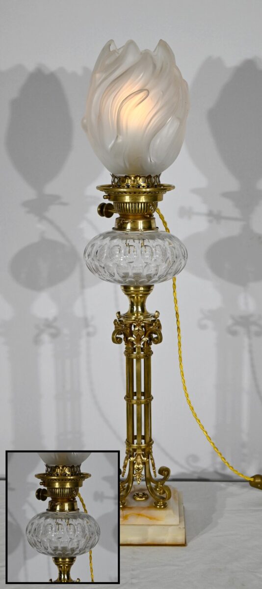 Le globe et le réservoir sont en verre, en tulipe pour le premier, à facettes pour le second.