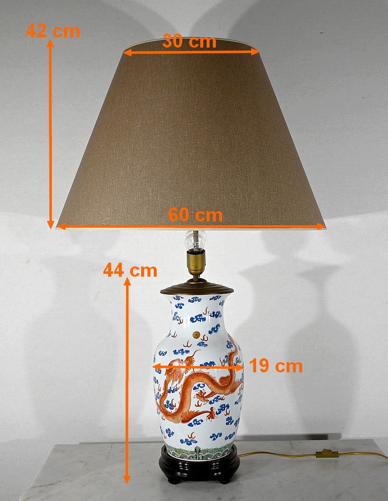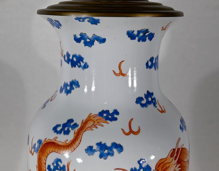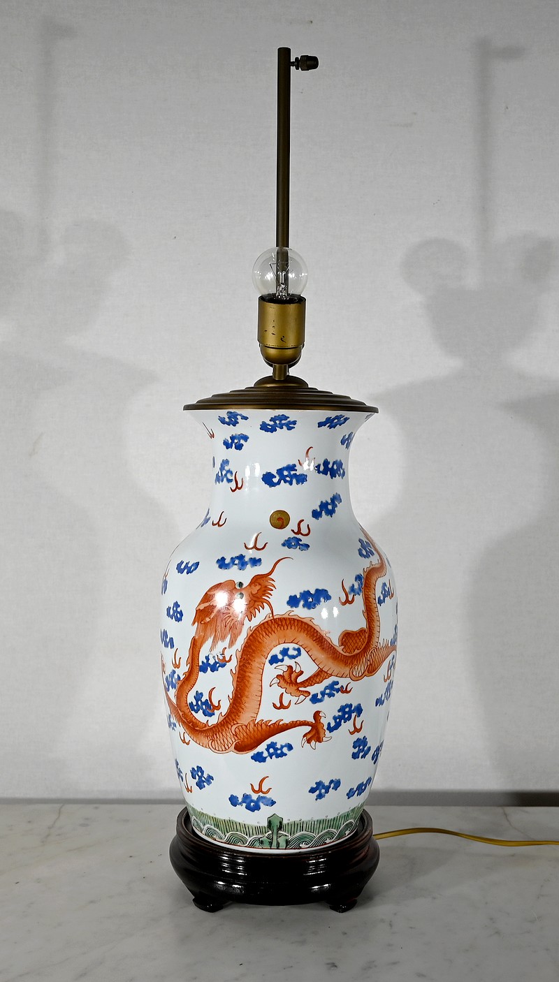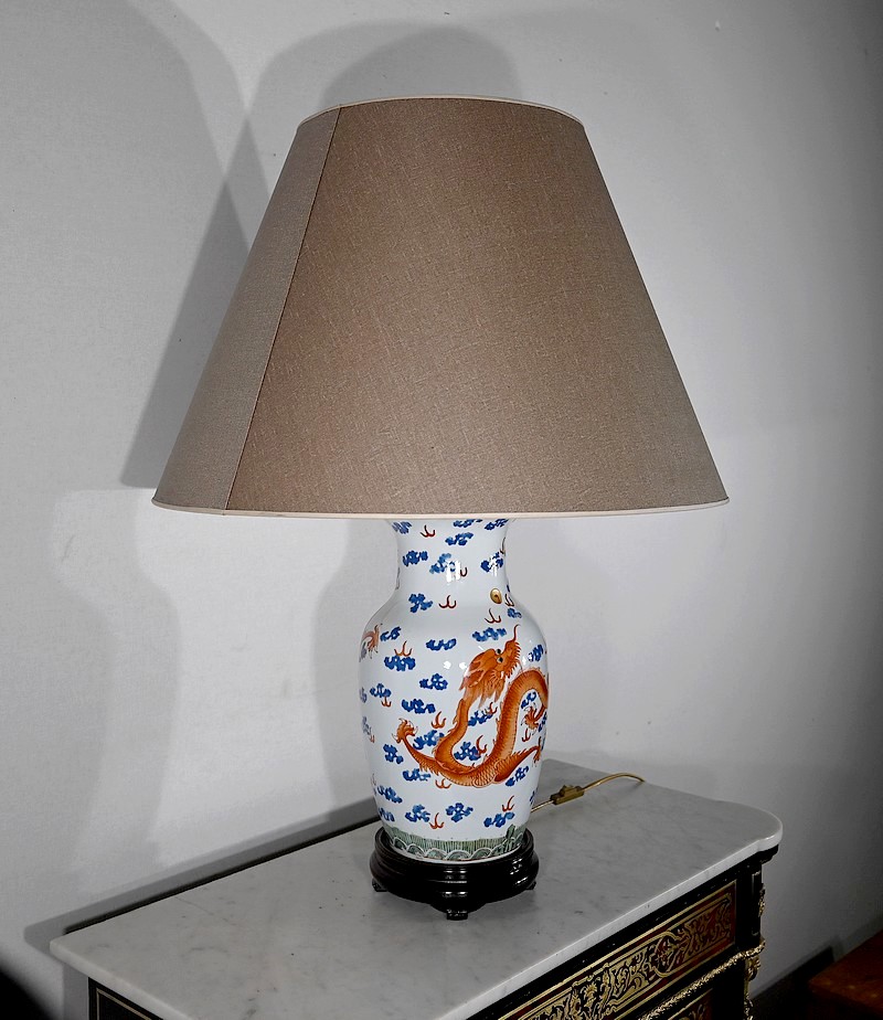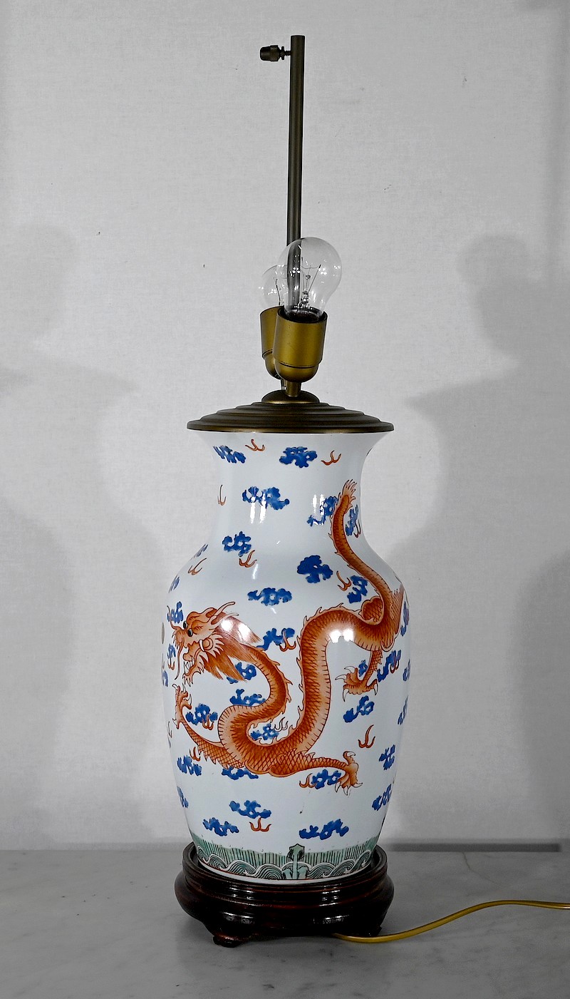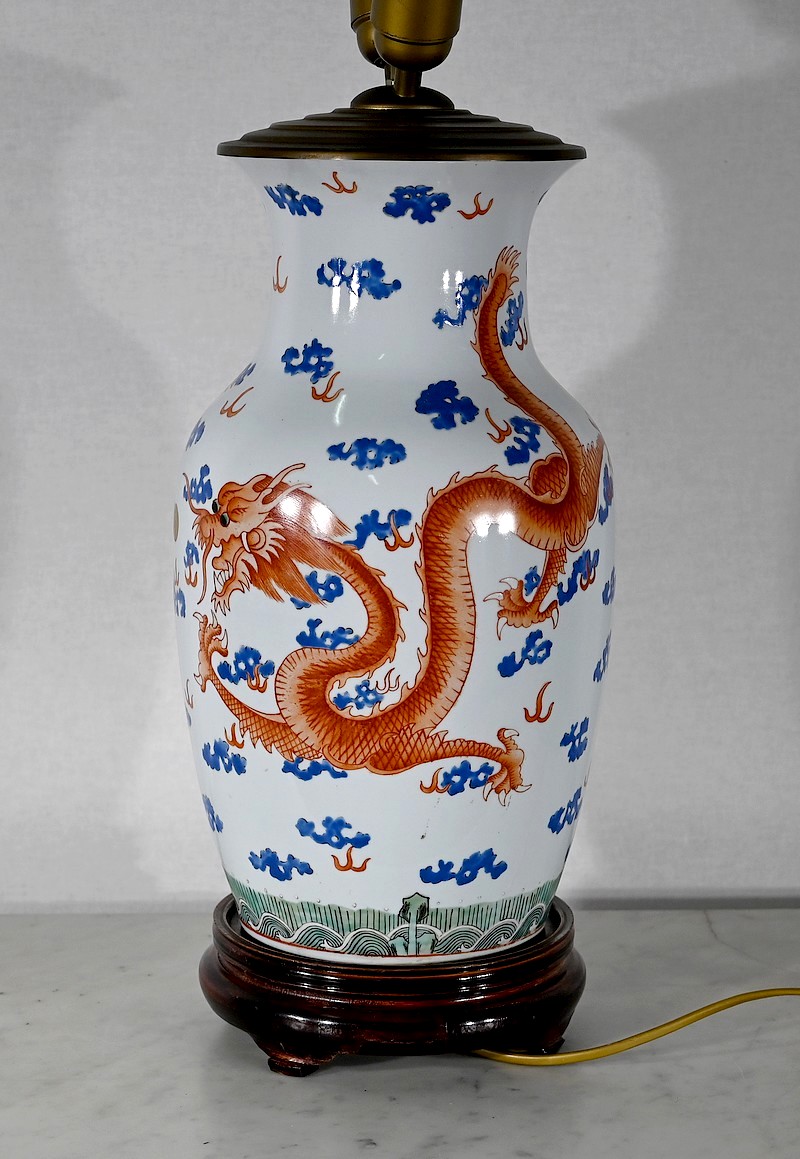 Grande lampe formée d’un vase balustre à col ouvert, à décor de dragons, posée sur un socle mouluré en acajou.