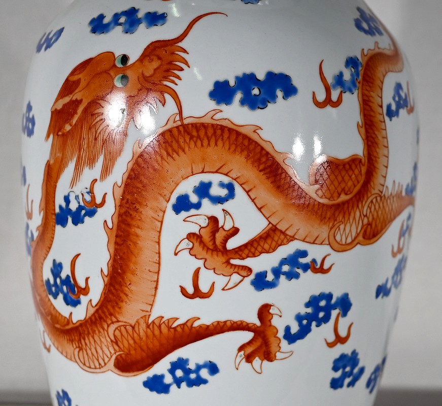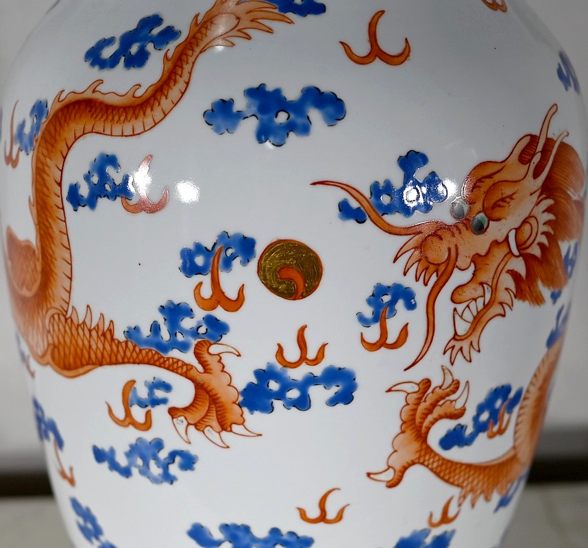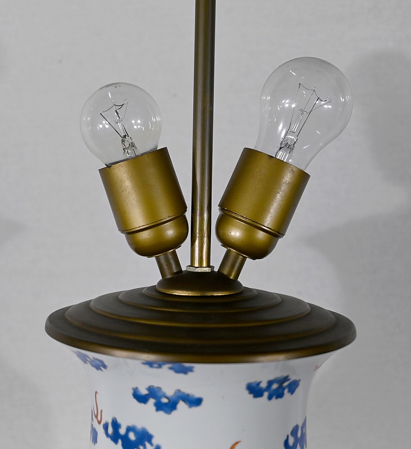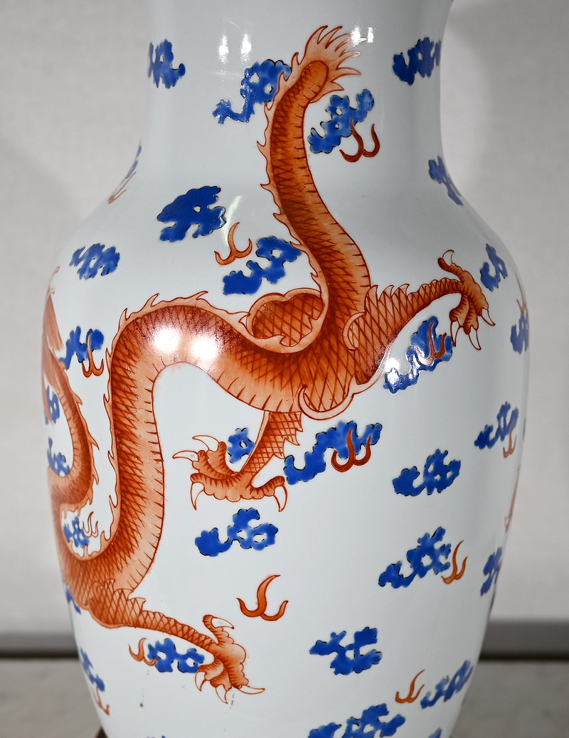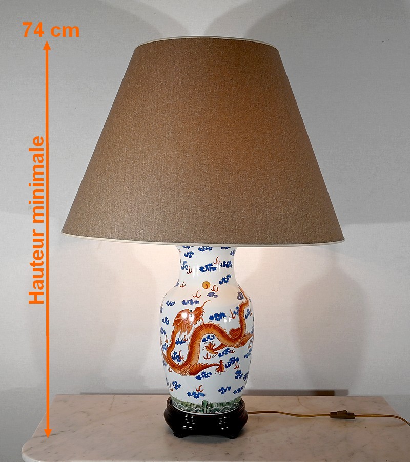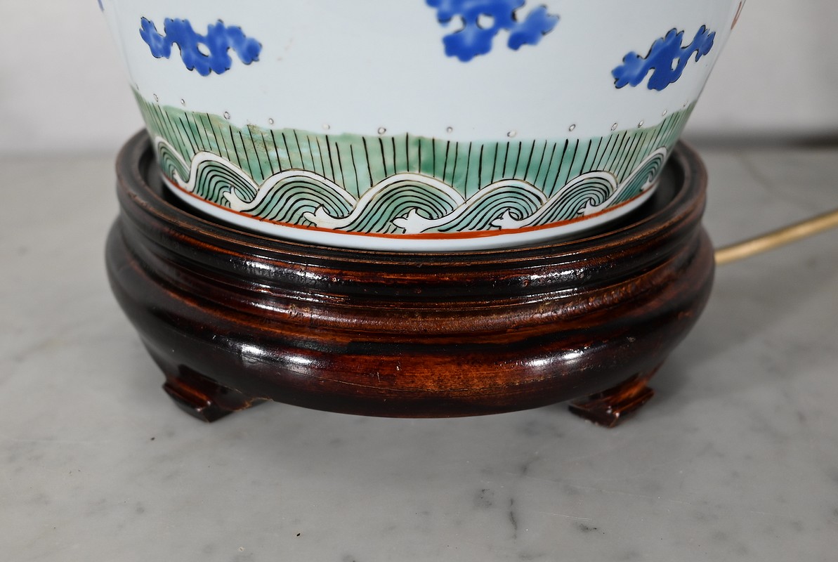 Grande lampe formée d’un vase balustre à col ouvert, à décor de dragons, posée sur un socle mouluré en acajou.