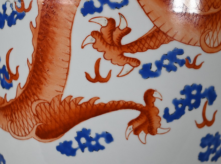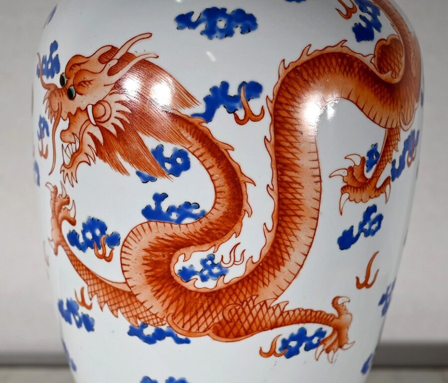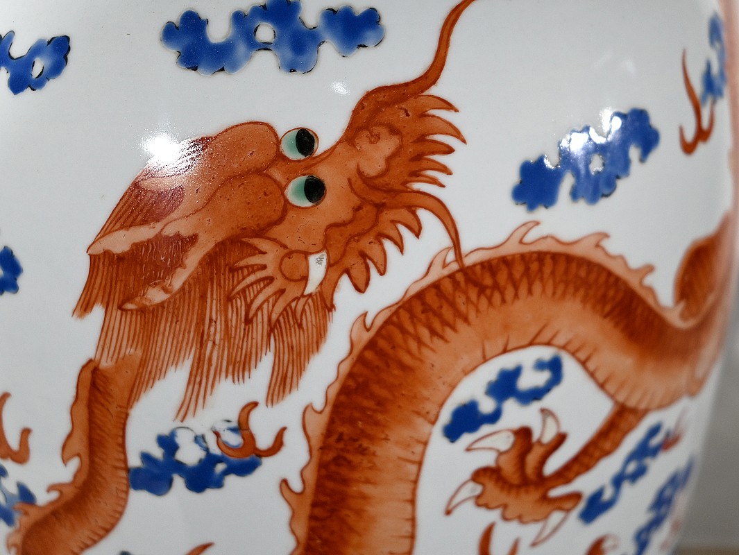 Une scène en frise illustre deux dragons filiformes dansant dans le ciel, entourés de nuages bleus. Ces créatures mythologiques sont peintes délicatement en dégradé de teintes oranges.