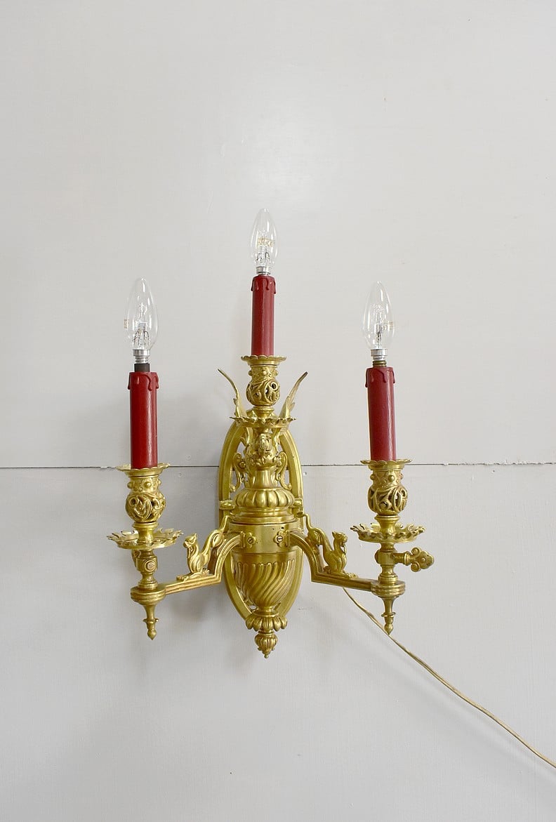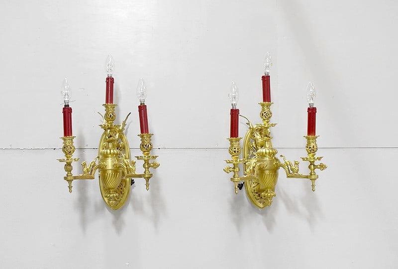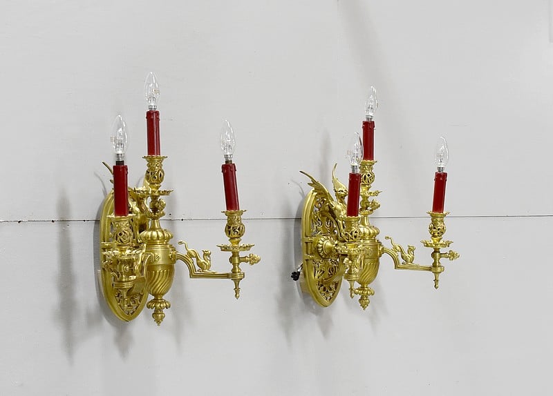 Importante paire d’appliques dans le goût Renaissance à 3 bras de lumière électrifiés en bronze, très lourdes.