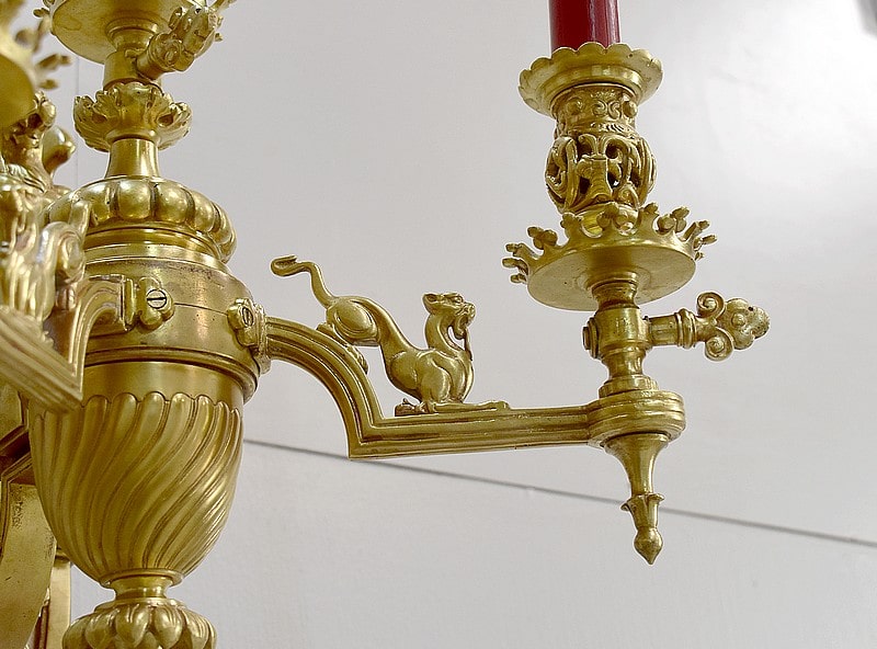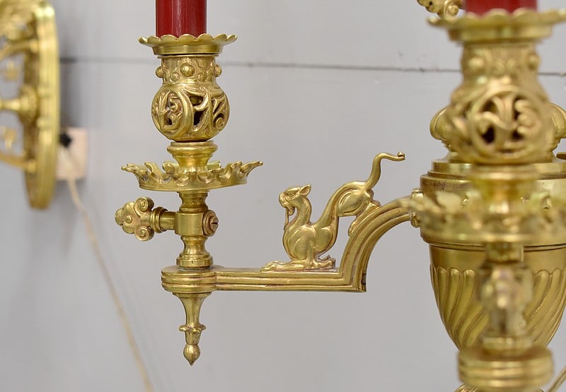 Les deux autres bras de lumière sont ornés chacun d’un lion faisant face aux portants.