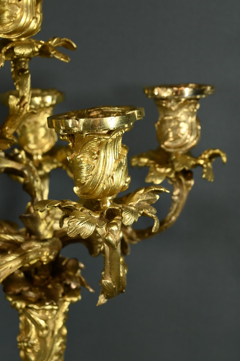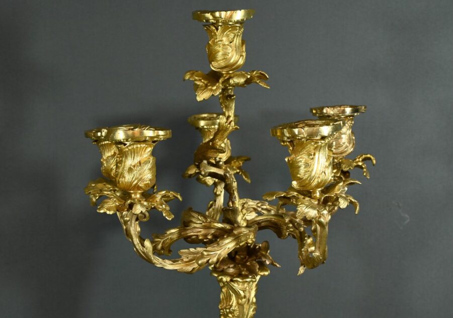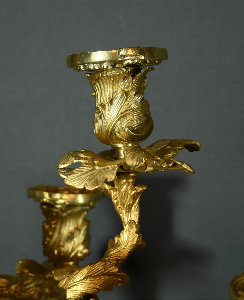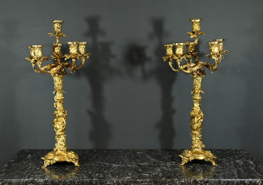 Chaque candélabre est doté de six bras de lumière en volute, magnifiquement décorés de rinceaux et finement ciselés de feuilles d’acanthe, témoignant du savoir-faire exceptionnel des artisans de l’époque.