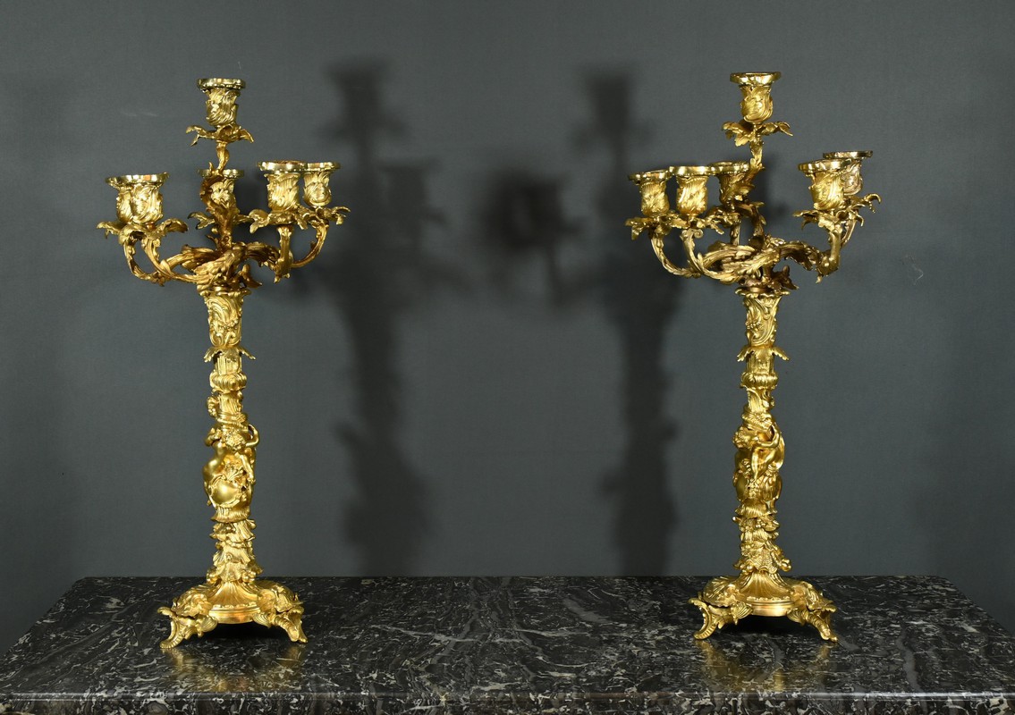 Cette paire de candélabres en bronze doré, de style Rocaille et datant de l’époque Napoléon III au milieu du XIXe siècle, est un exemple éblouissant de l’art décoratif de cette période.