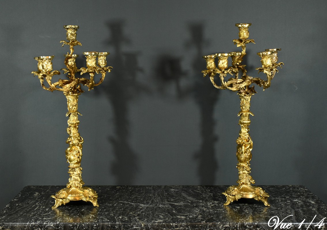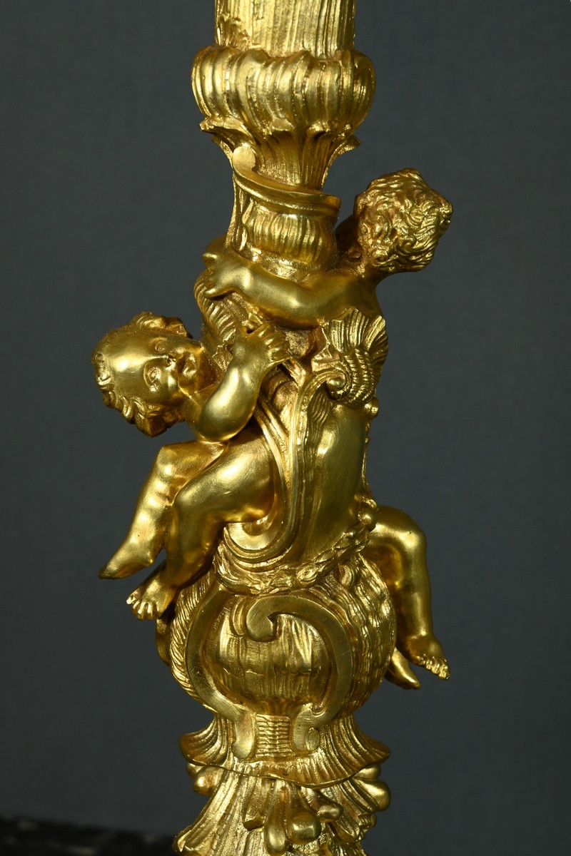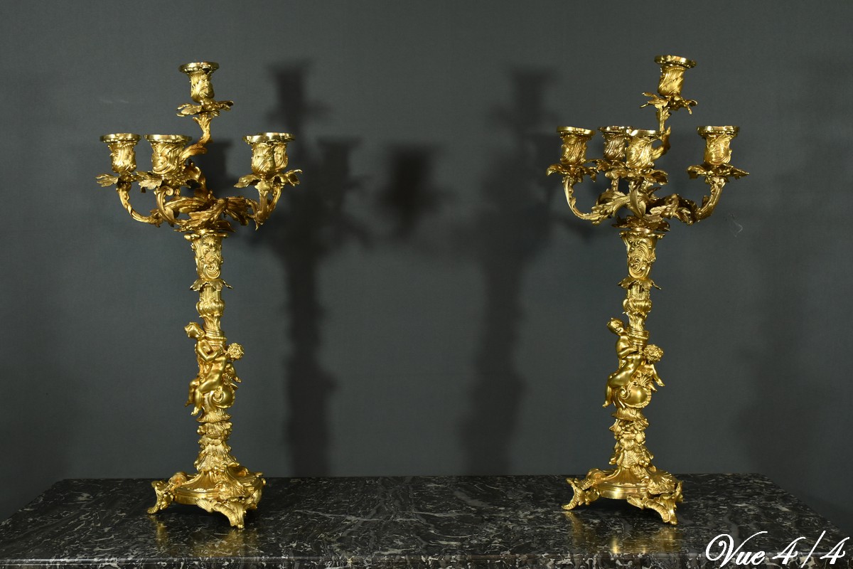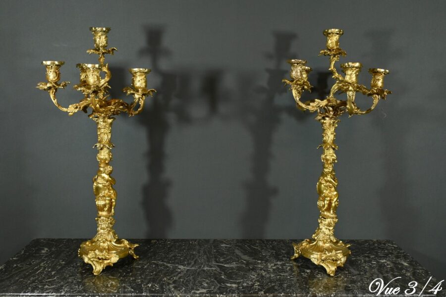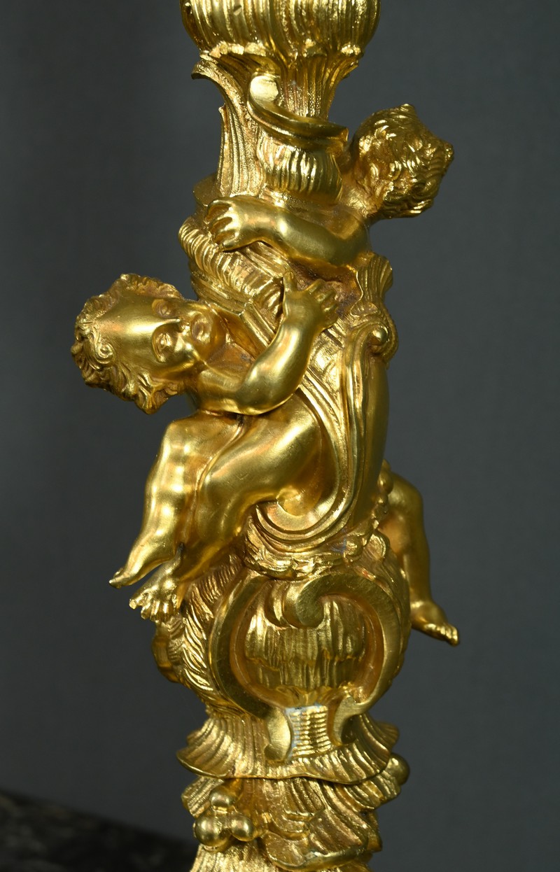 Les corps des candélabres sont richement ornés de sculptures de putti, de feuilles de ruban et d’autres éléments végétalisés, créant une harmonie visuelle et une richesse de détails qui captivent le regard.