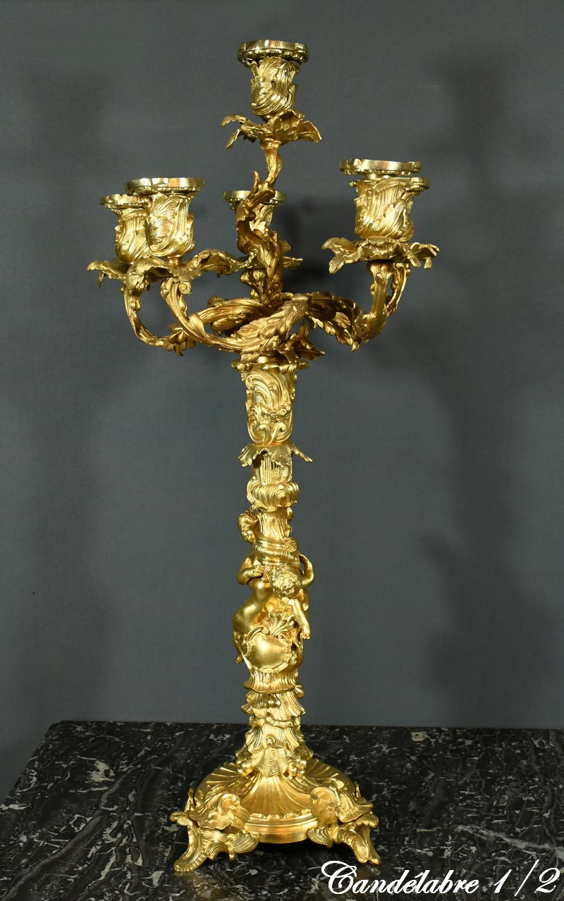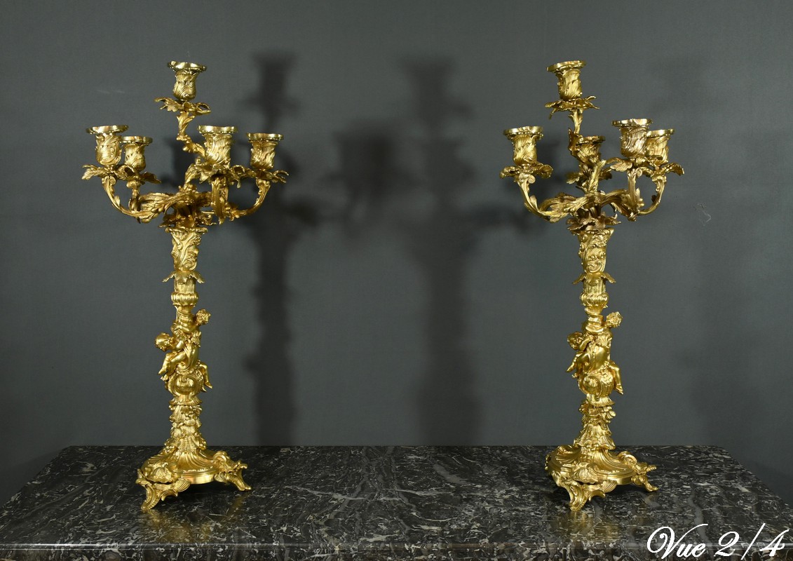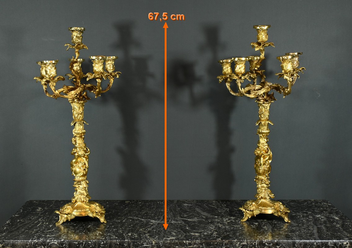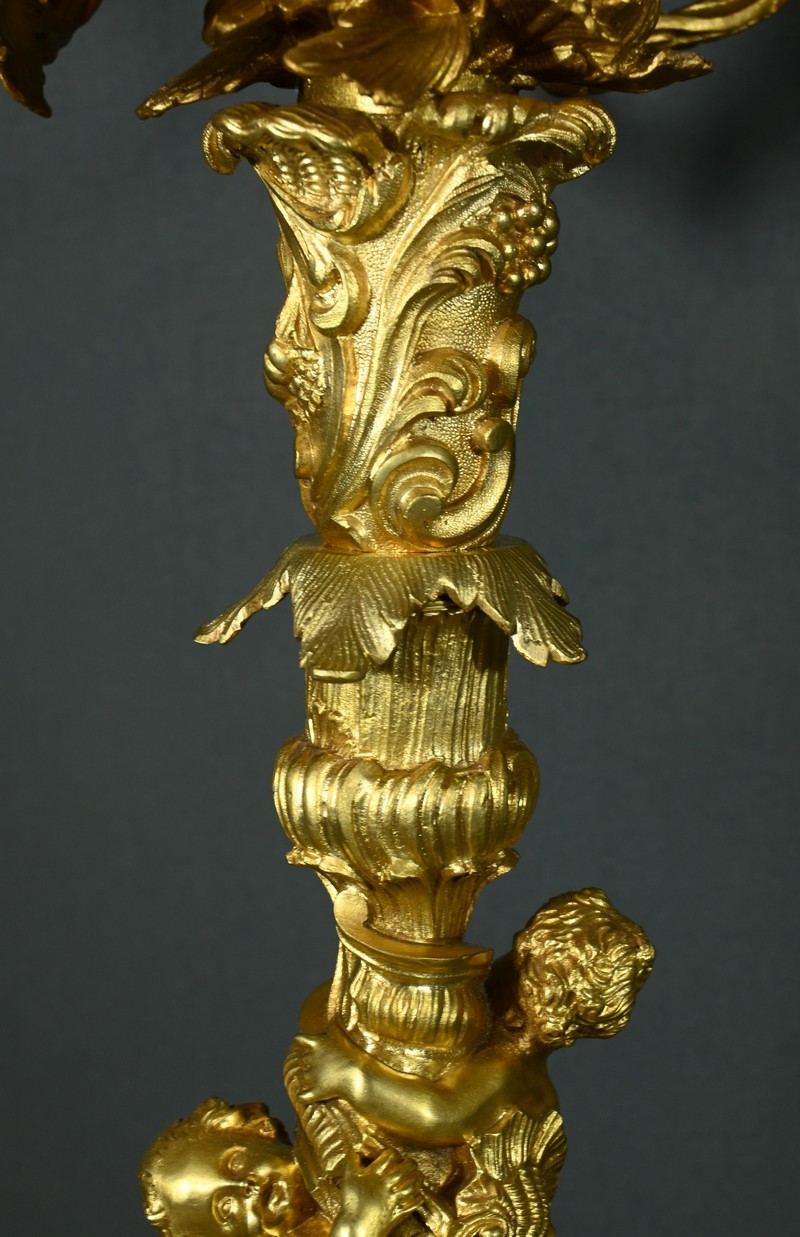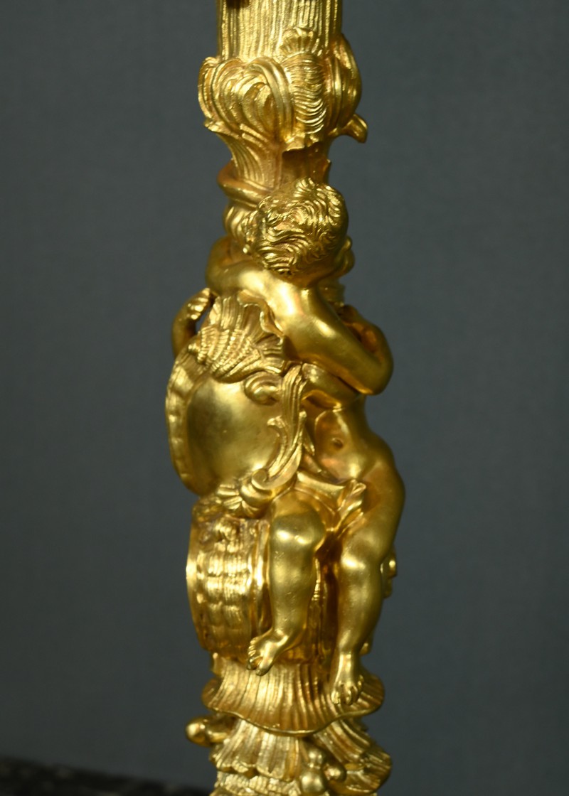 Les corps des candélabres sont richement ornés de sculptures de putti, de feuilles de ruban et d’autres éléments végétalisés, créant une harmonie visuelle et une richesse de détails qui captivent le regard.