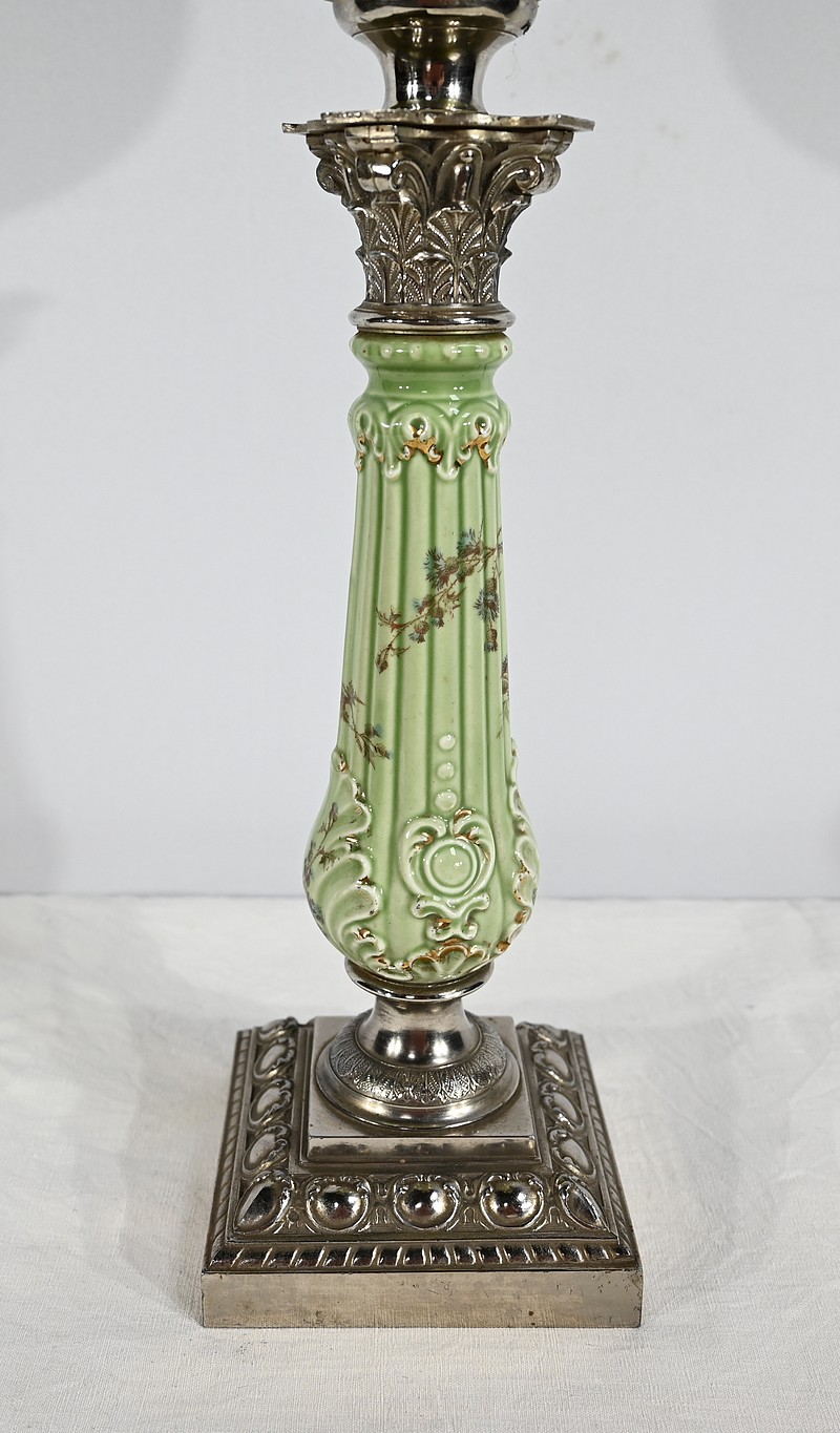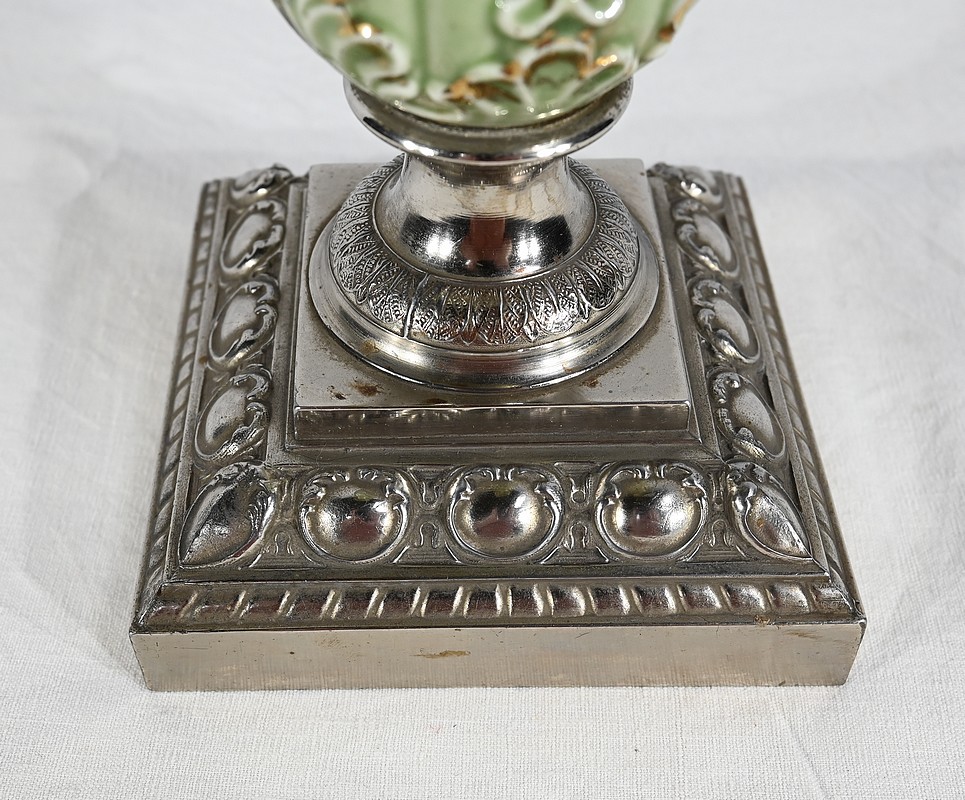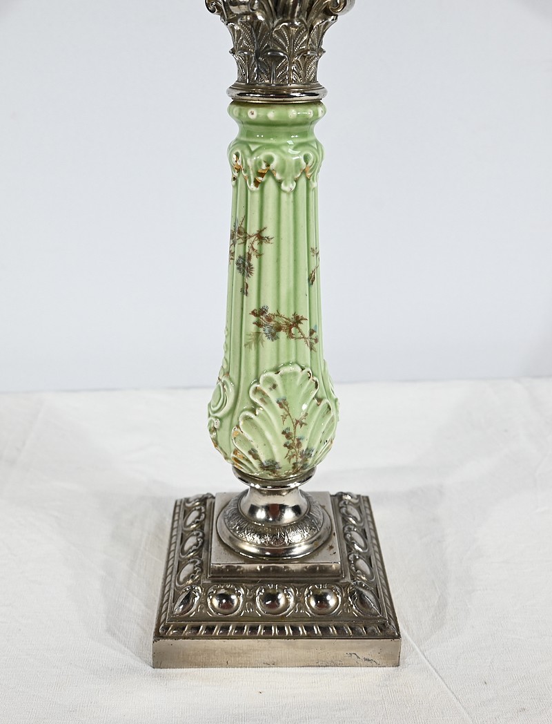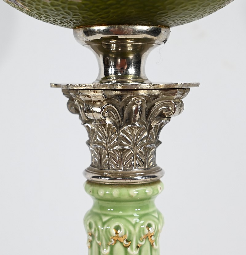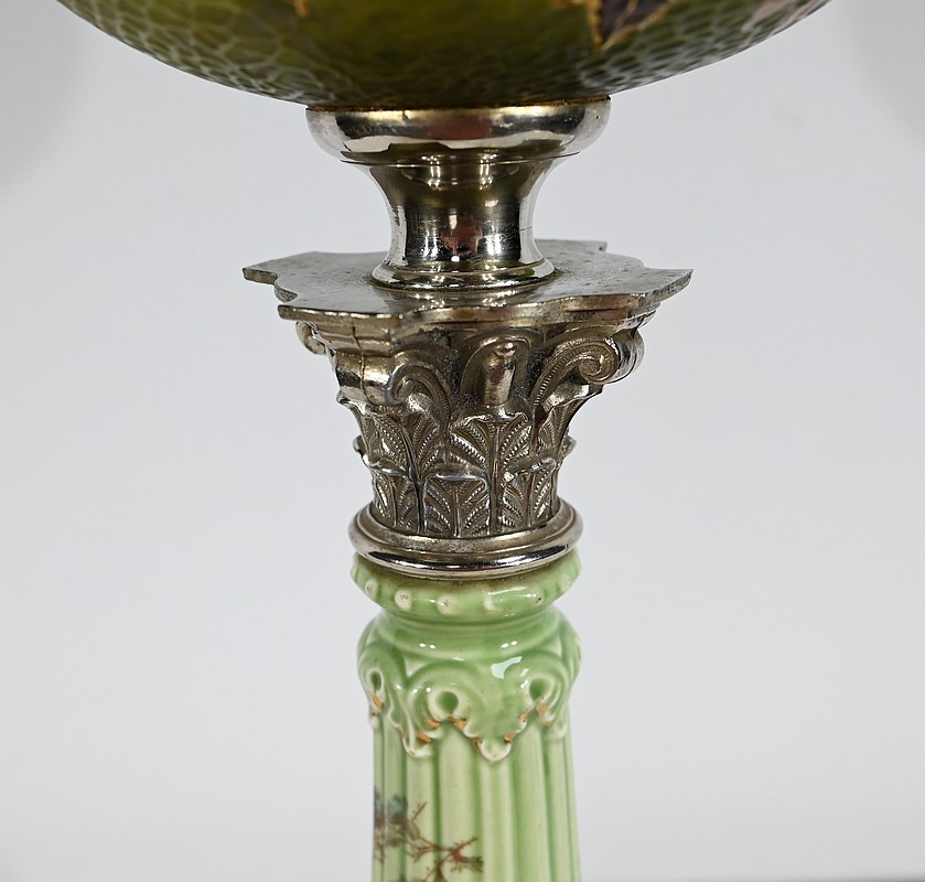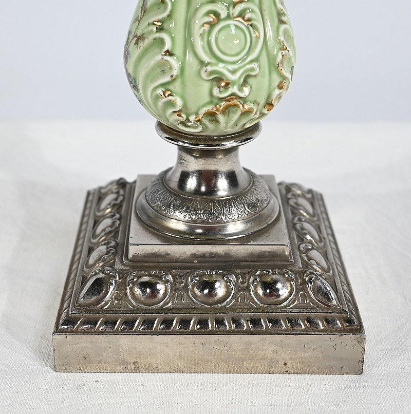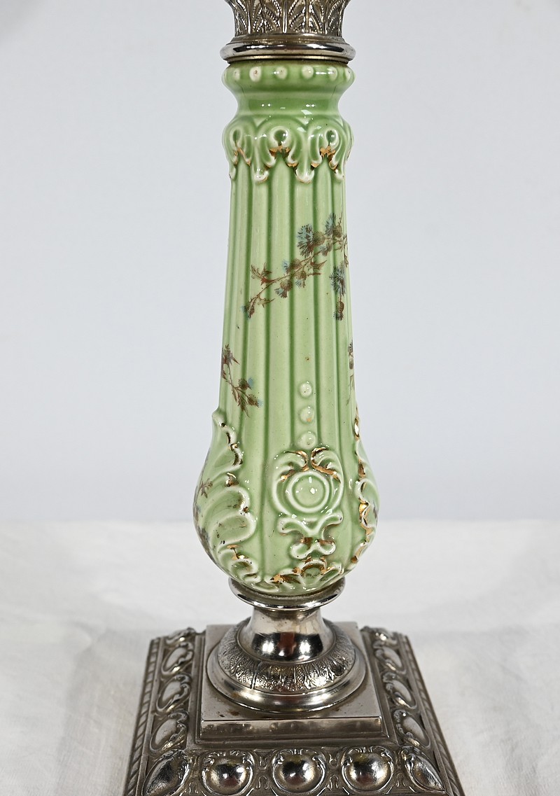 En partie basse, un joli fût en faïence de couleur vert tendre est formé de sillons et de rinceaux. Des petits chardons y sont peints reprenant le thème végétal. Au dessus, une belle collerette rappelant le haut d’une colonne habille la lampe. L’ensemble repose sur une base carrée en métal argenté façonnée d’une frise de pastilles entourées de volutes.