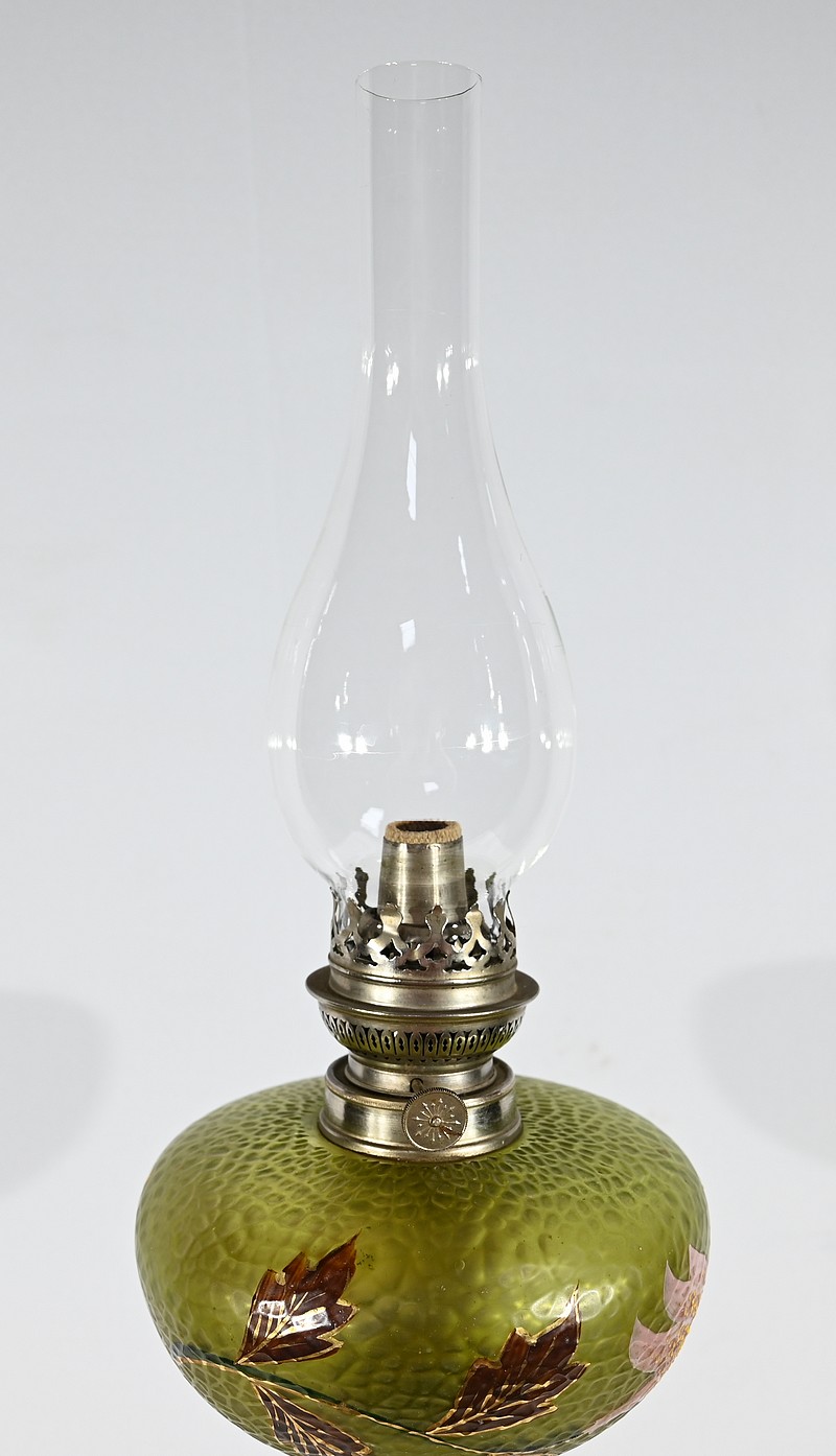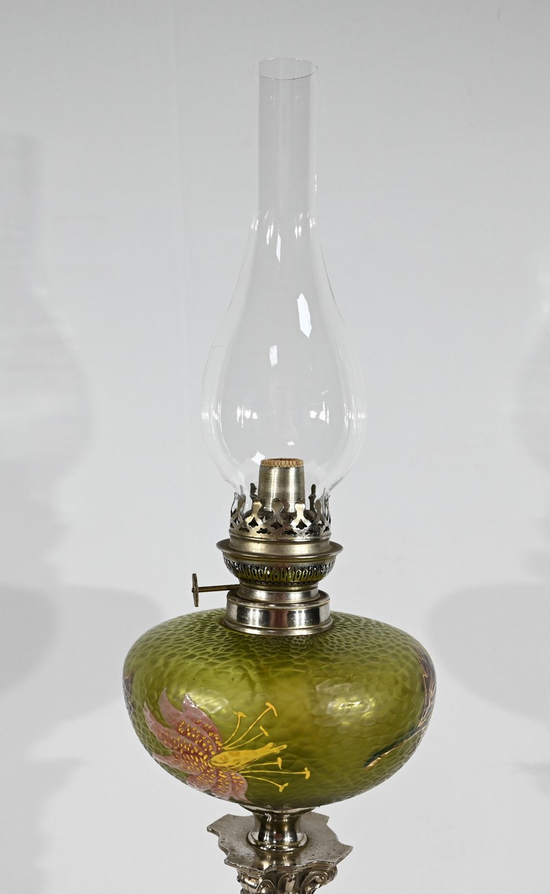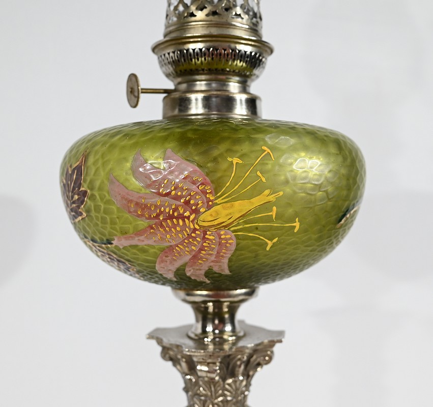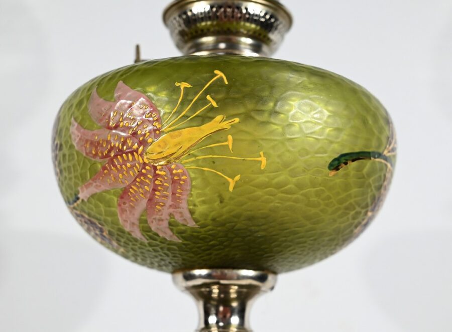 Cette Lampe possède un réservoir en opaline craquelée. Sur ses reliefs, une fleur et sa tige feuillagée sont peintes et font le tour de la lampe.