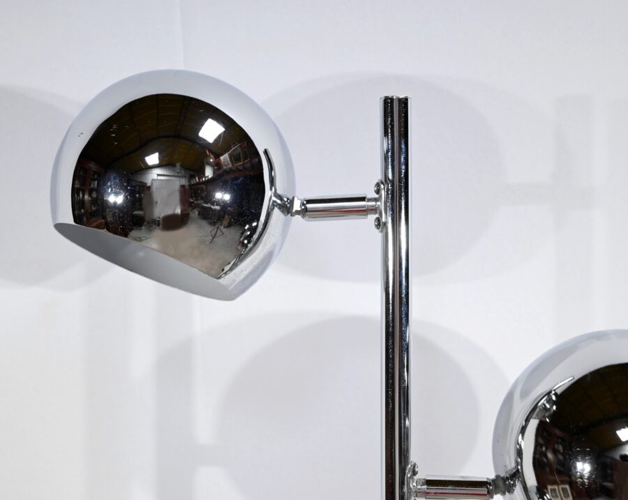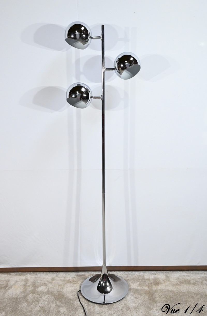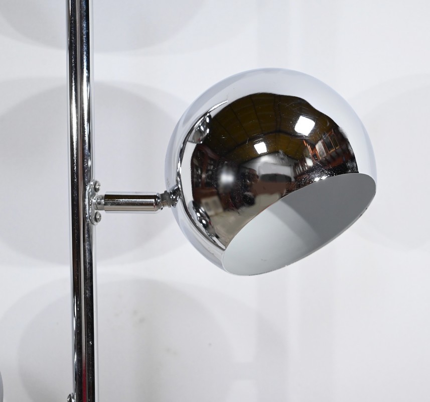 Lampadaire en métal chromé à trois bras de lumière. Les abat-jours sont rotatifs permettant de moduler les sources lumineuses. Le pied tubulaire repose sur une base circulaire en métal chromé.