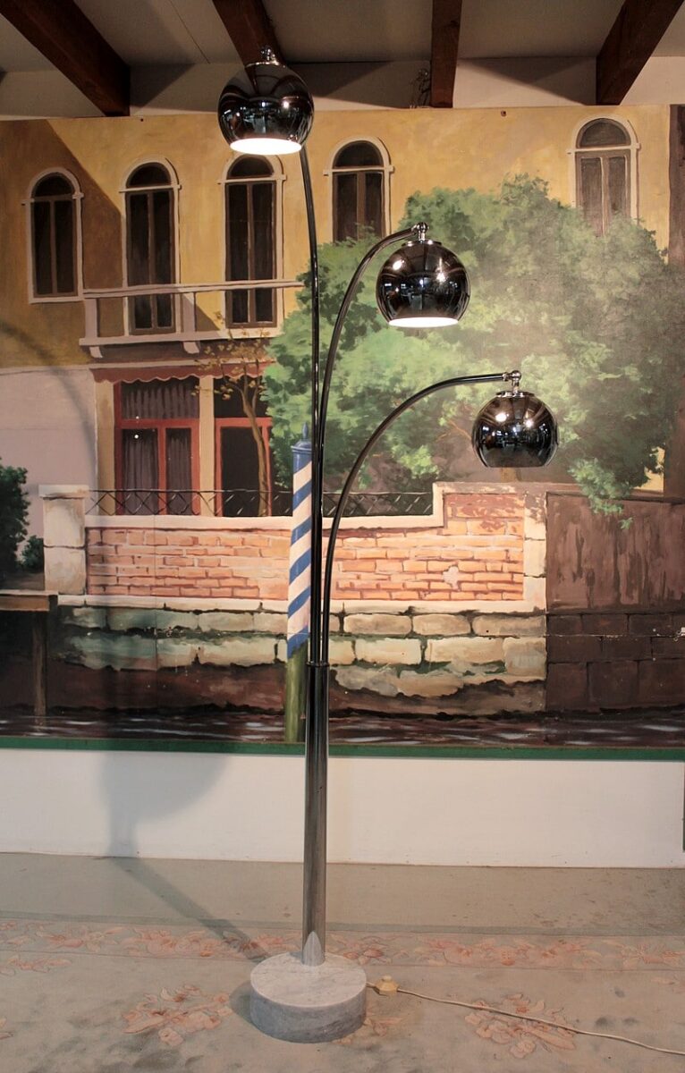Lampadaire en métal chromé à 3 lumières des années 1970. Il repose sur un socle en marbre de carrare et il est composé de 3 branches pivotantes permettant de nombreuses positions. Les cache ampoules de forme sphérique sont orientables. XXe siècle.