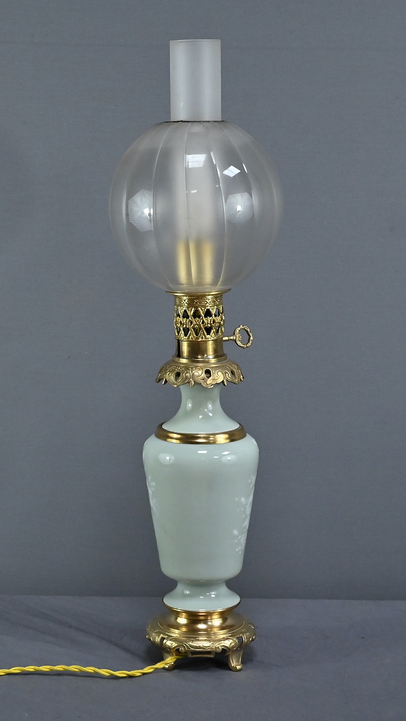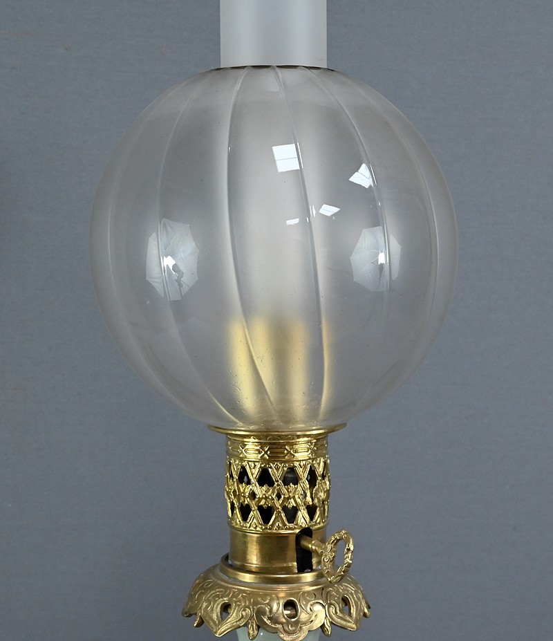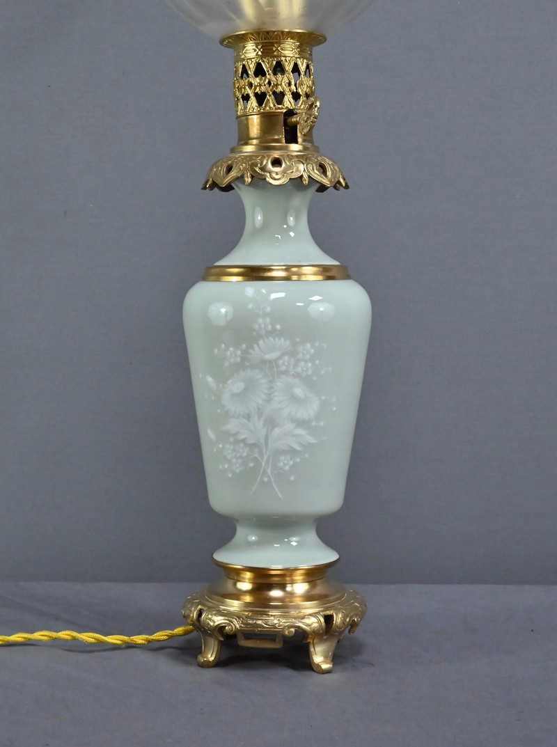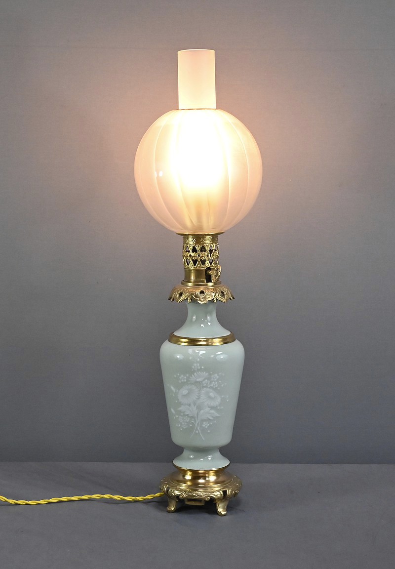 Cette lampe à pétrole électrifiée en porcelaine céladon est une pièce remarquable datant de la seconde moitié du XIXe siècle, sous le règne de Napoléon III. Elle incarne à merveille le goût éclectique et raffiné de cette époque. Le corps de la lampe prend la forme d’une urne en porcelaine céladon, dont la teinte vert pâle évoque la délicatesse des céramiques asiatiques. Elle est subtilement décorée de fleurs blanches translucides en léger relief, apportant une touche de poésie et de finesse à l’ensemble. Ces motifs floraux semblent presque flotter à la surface, captant la lumière avec une grâce discrète. Les ornementations à décor de volutes et feuillage sont en bronze doré finement ciselé, notamment à la base et au col de la lampe. Le bronze doré ajoute une chaleur visuelle qui contraste élégamment avec la fraîcheur du céladon. Le globe en verre dépoli, placé au sommet, est orné de sillons incurvés qui diffusent la lumière avec douceur créant des reflets subtils et accentuant le charme ancien de la lampe lorsqu’elle est allumée.