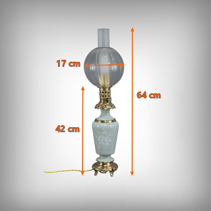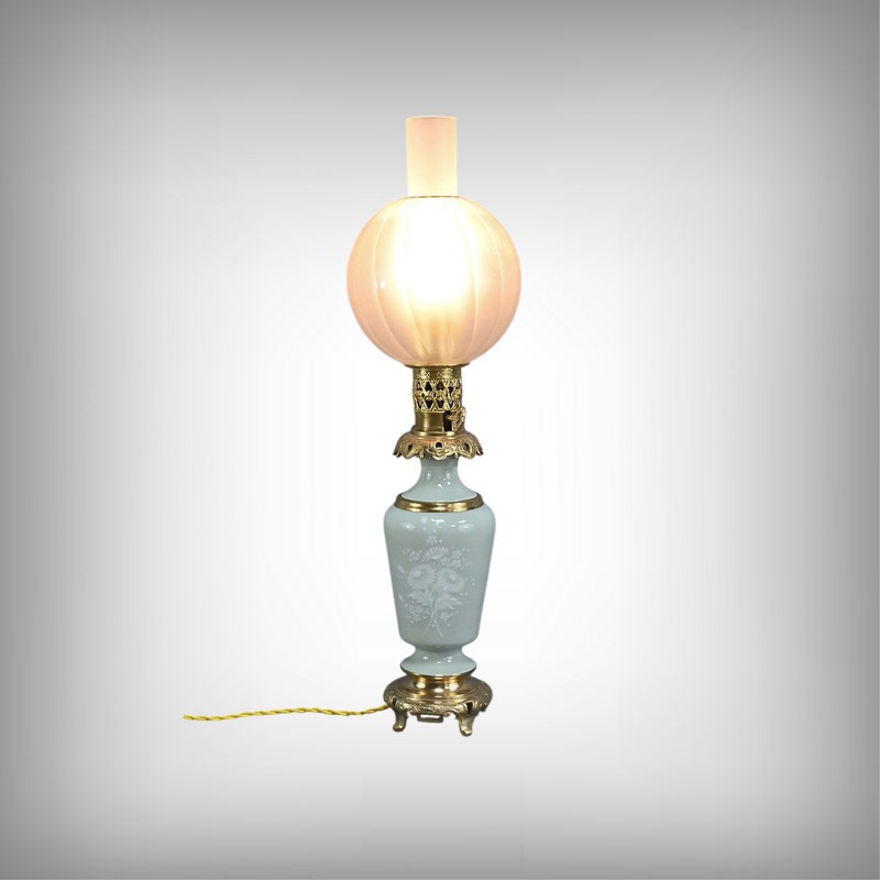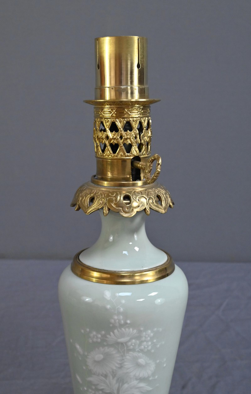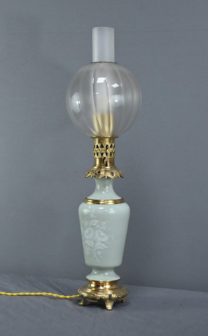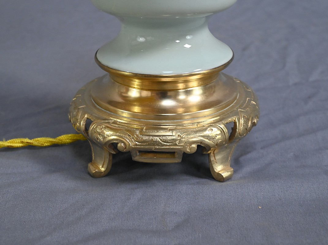Cette lampe à pétrole électrifiée en porcelaine céladon est une pièce remarquable datant de la seconde moitié du XIXe siècle, sous le règne de Napoléon III. Elle incarne à merveille le goût éclectique et raffiné de cette époque. Le corps de la lampe prend la forme d’une urne en porcelaine céladon, dont la teinte vert pâle évoque la délicatesse des céramiques asiatiques. Elle est subtilement décorée de fleurs blanches translucides en léger relief, apportant une touche de poésie et de finesse à l’ensemble. Ces motifs floraux semblent presque flotter à la surface, captant la lumière avec une grâce discrète. Les ornementations à décor de volutes et feuillage sont en bronze doré finement ciselé, notamment à la base et au col de la lampe. Le bronze doré ajoute une chaleur visuelle qui contraste élégamment avec la fraîcheur du céladon. Le globe en verre dépoli, placé au sommet, est orné de sillons incurvés qui diffusent la lumière avec douceur créant des reflets subtils et accentuant le charme ancien de la lampe lorsqu’elle est allumée.