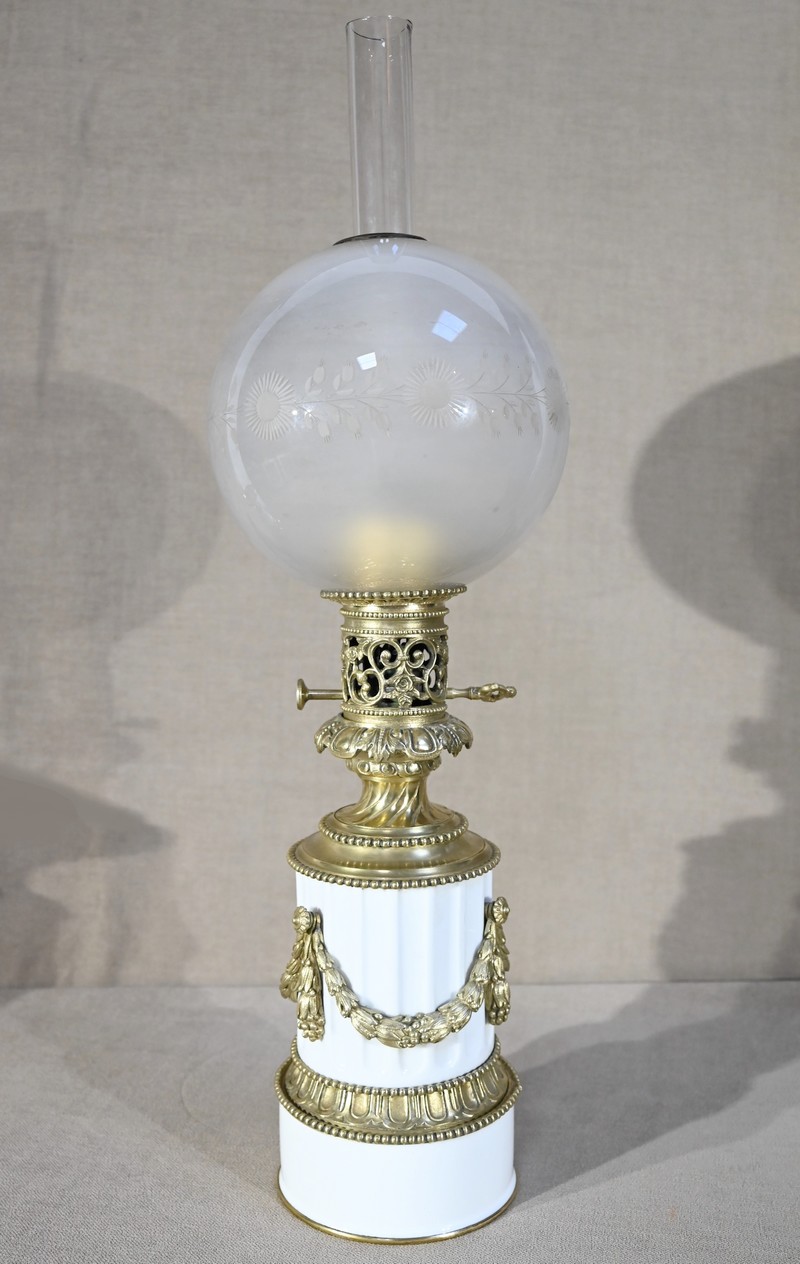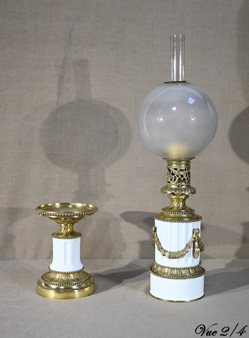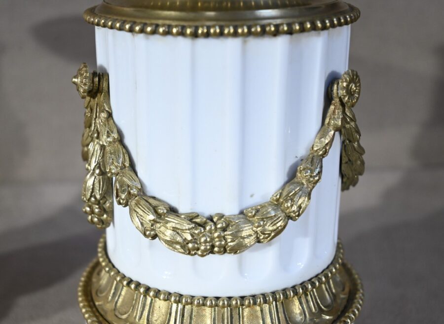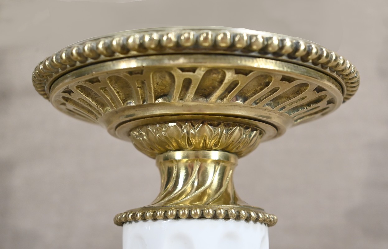 Le réservoir de lampe, aux larges cannelures, est ceint de fines guirlandes en bronze doré et souligné de perlés et de godrons.
