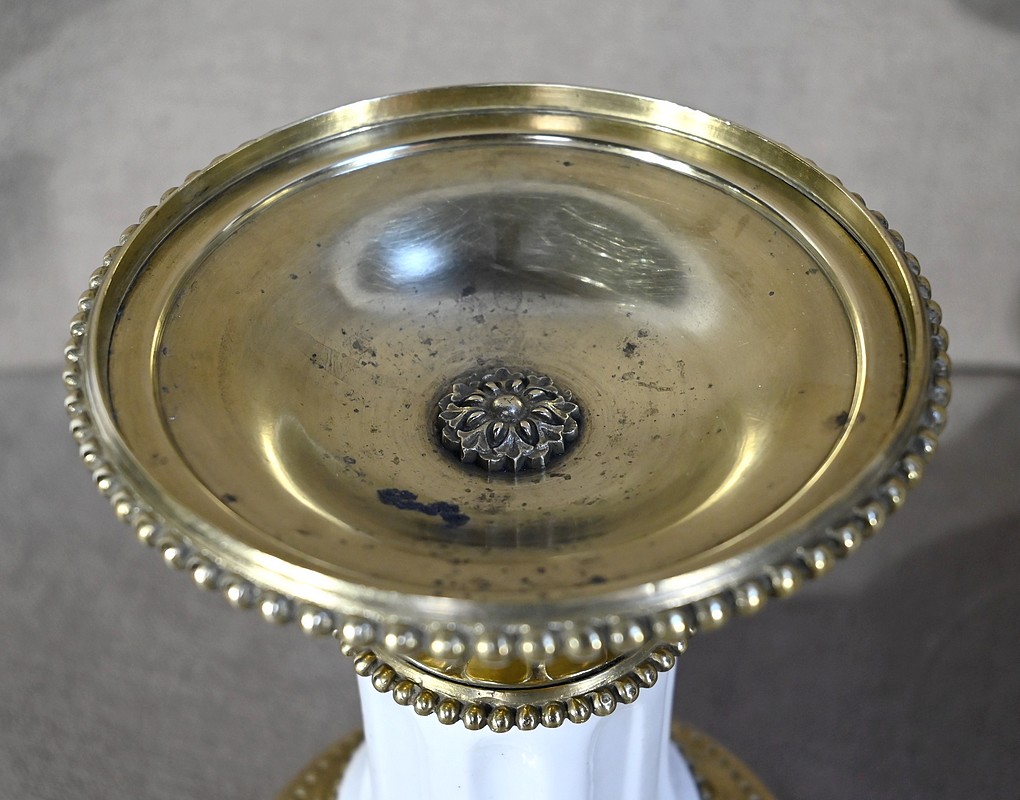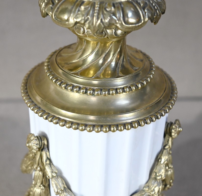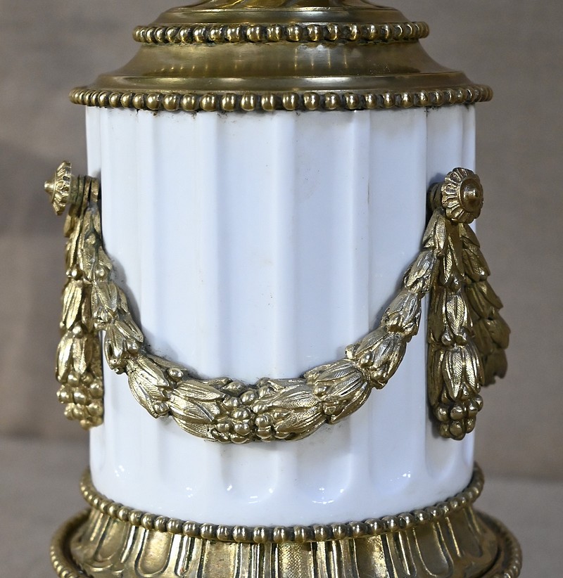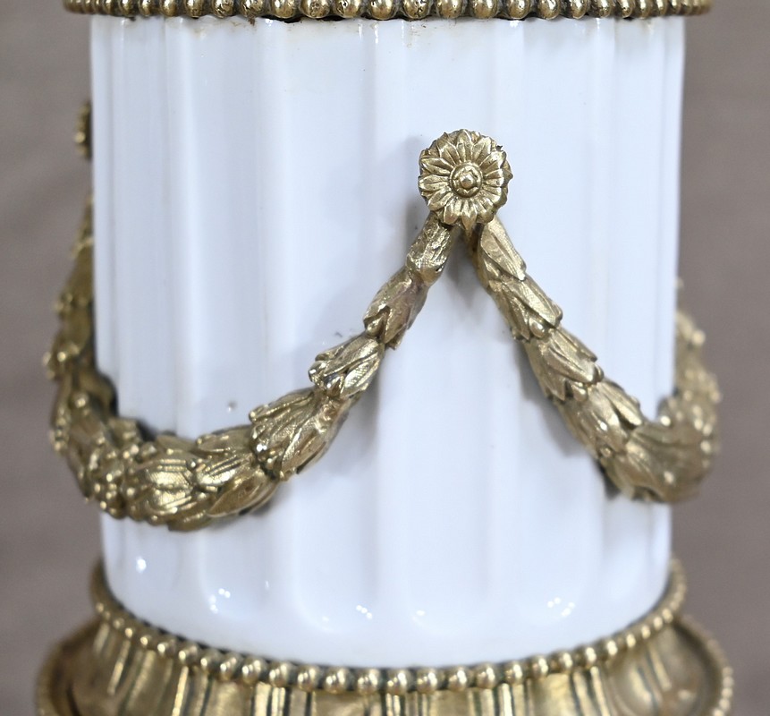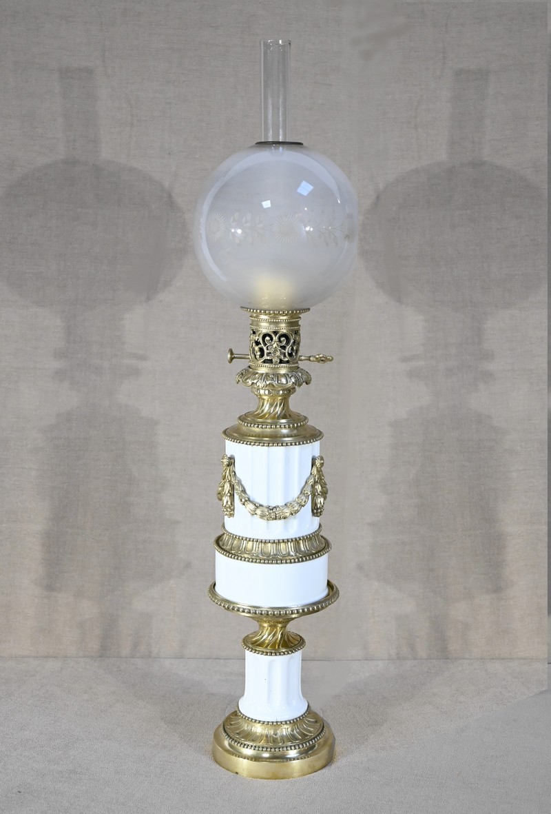 Le réservoir de lampe, aux larges cannelures, est ceint de fines guirlandes en bronze doré et souligné de perlés et de godrons.