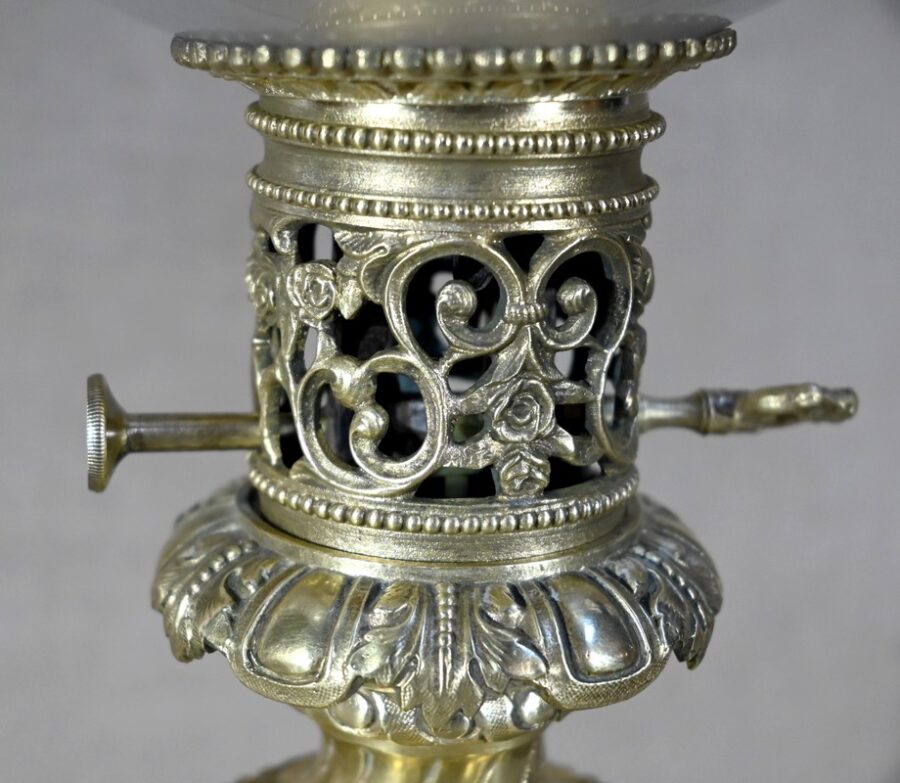 Au-dessus, le piédouche est ciselé à décors de petits oves, il soutient un bec de lampe à motifs de feuilles d’acanthe, de volutes, de perlés et de roses.