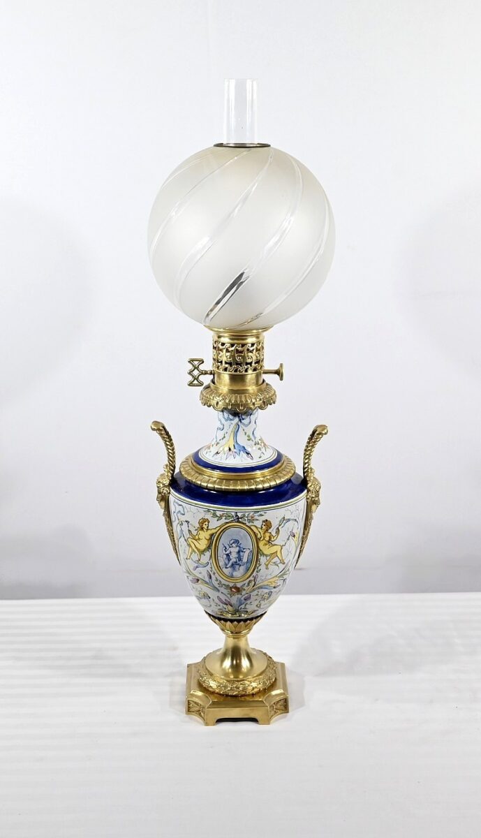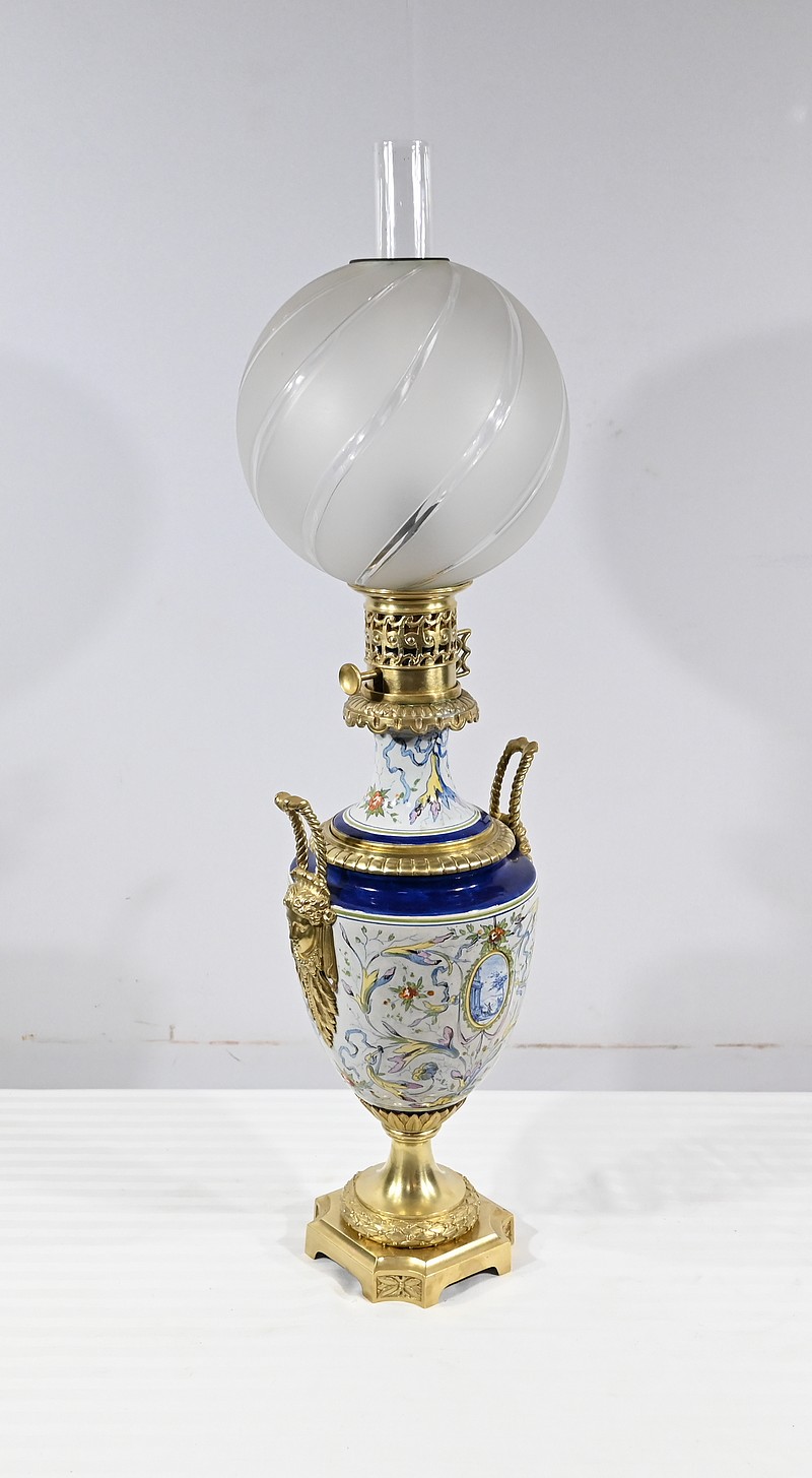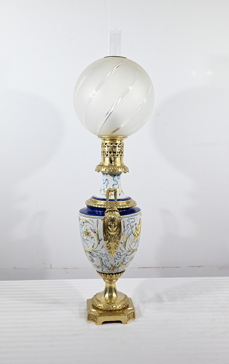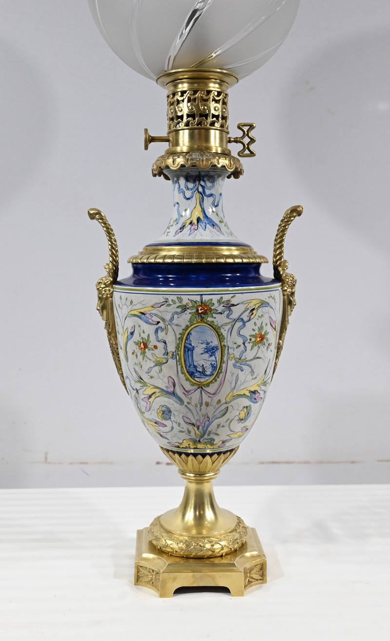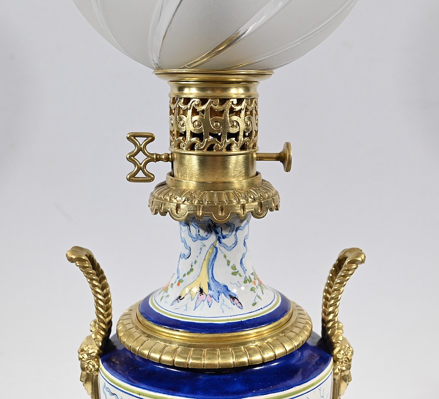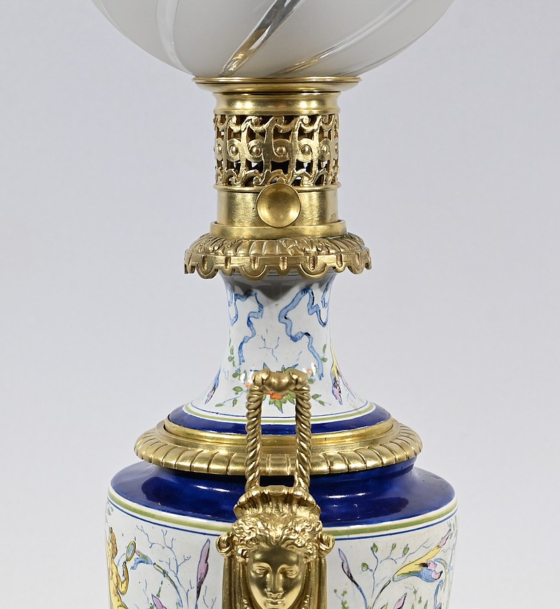 Lampe à pétrole en faïence polychrome, ornementée de bronze et munie d’un globe gravé de sillons courbes.